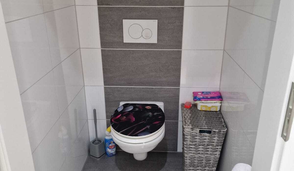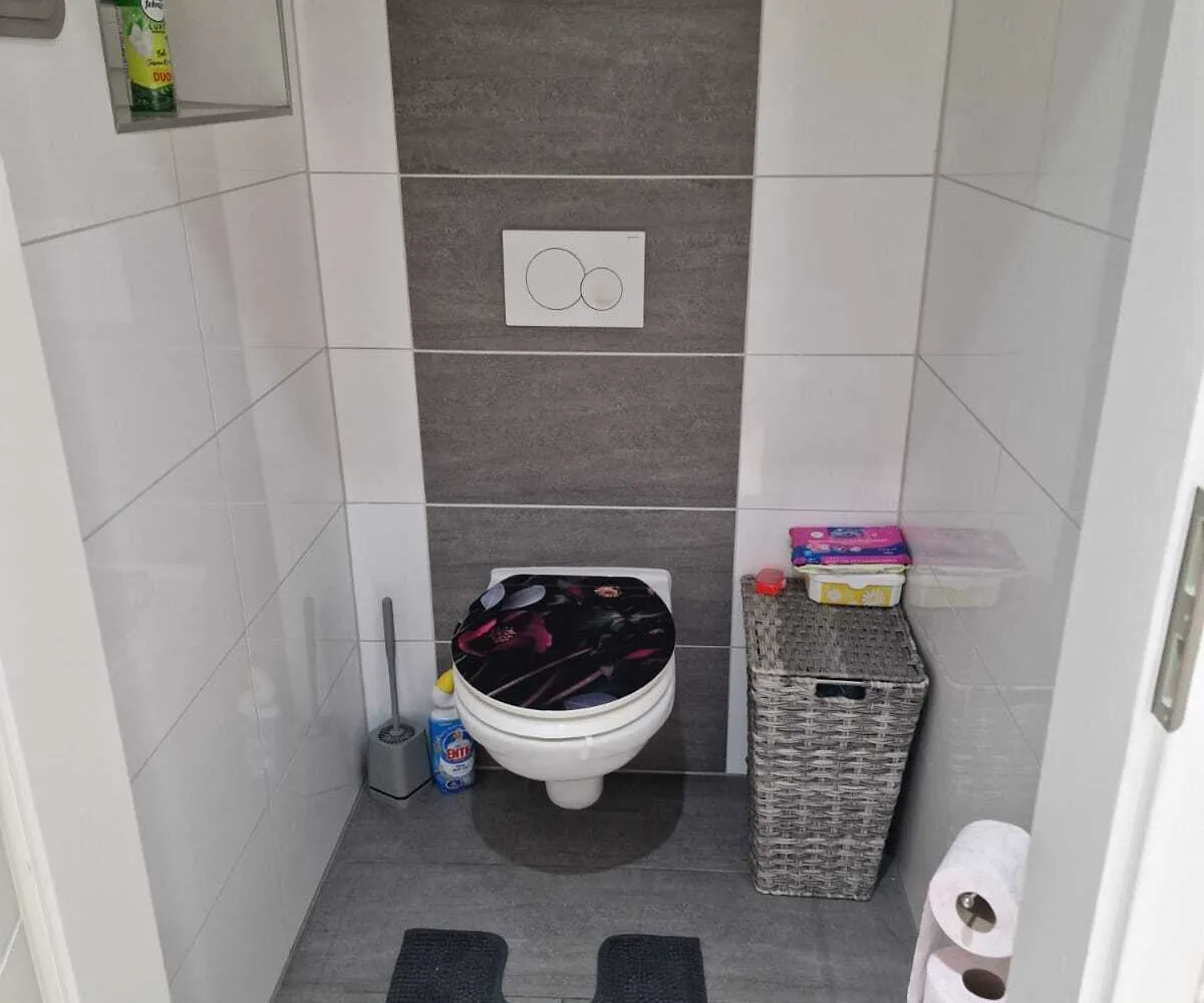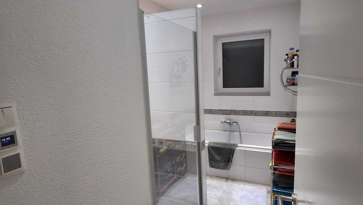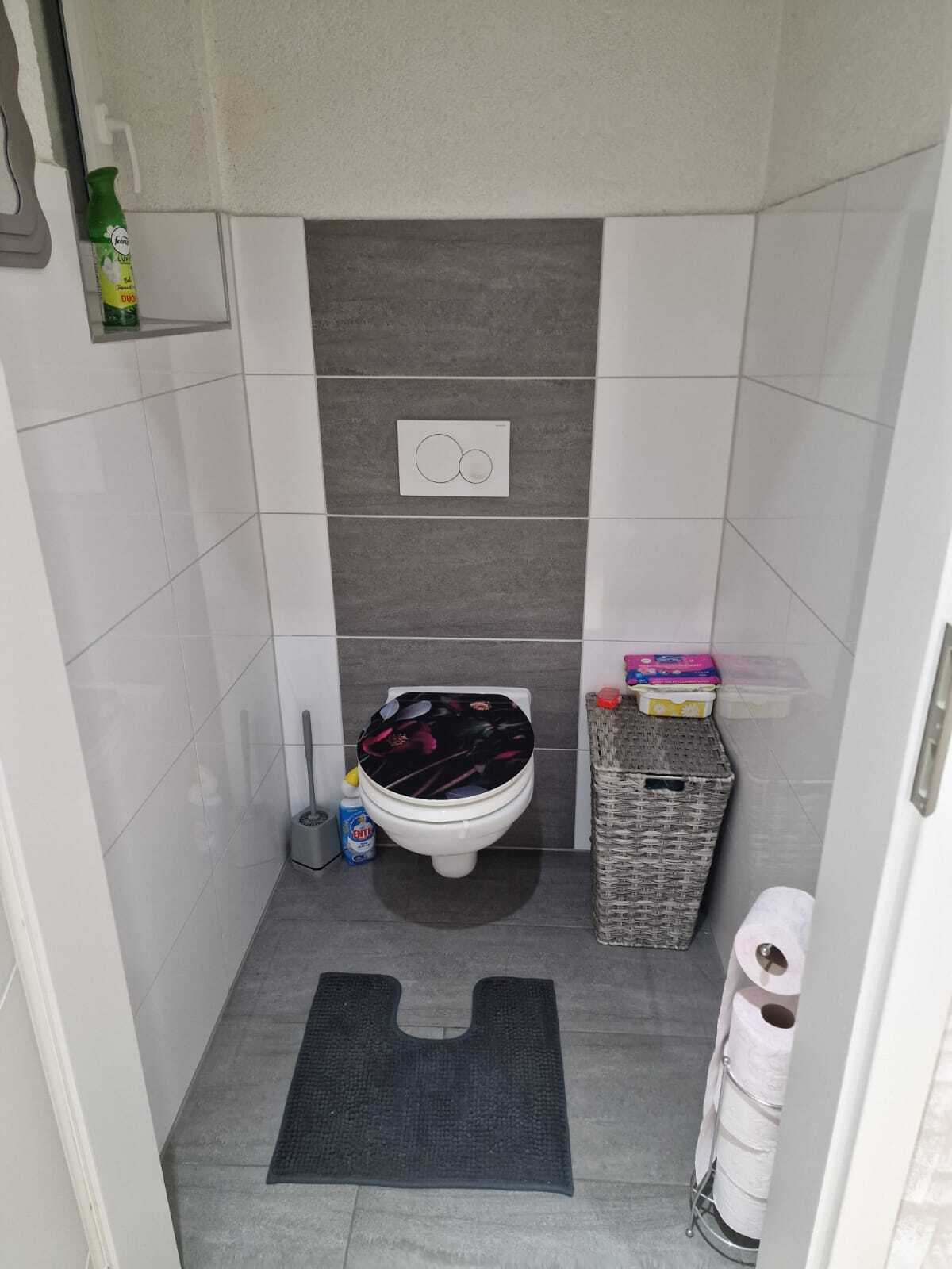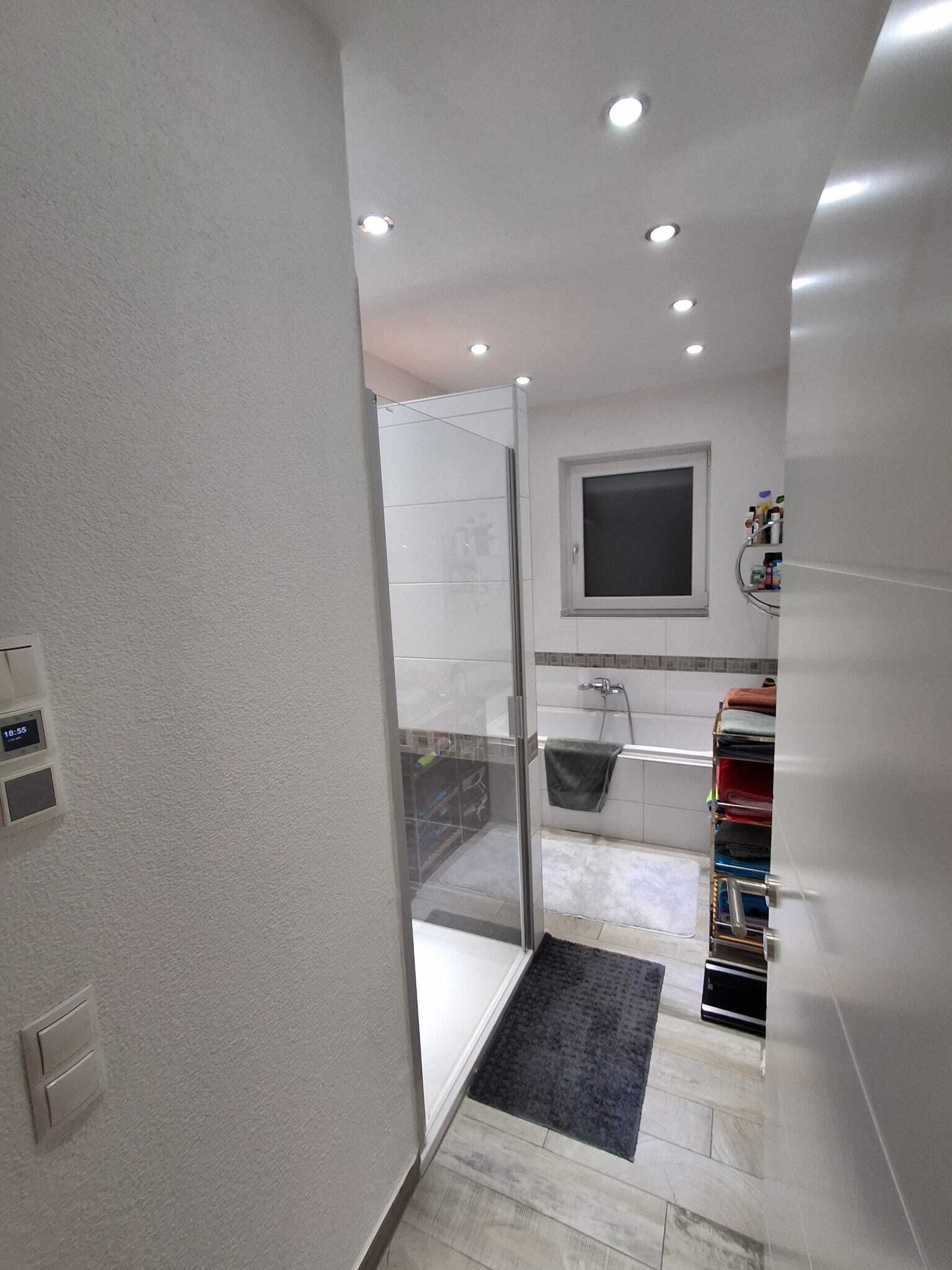 Beim Betreten des Erdgeschosses erreicht man auf der linken Seite das Badezimmer, dieses mit einer Dusche, einer Badewanne und einen Waschbecken ausgestattet ist. Nebenan befindet sich die separate Toilette.