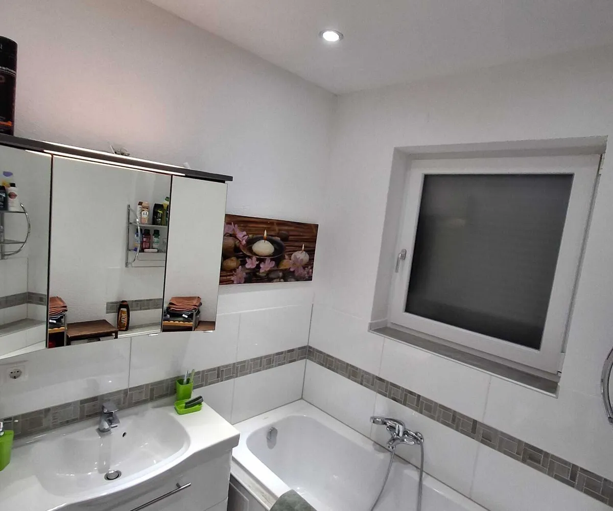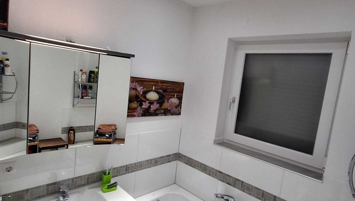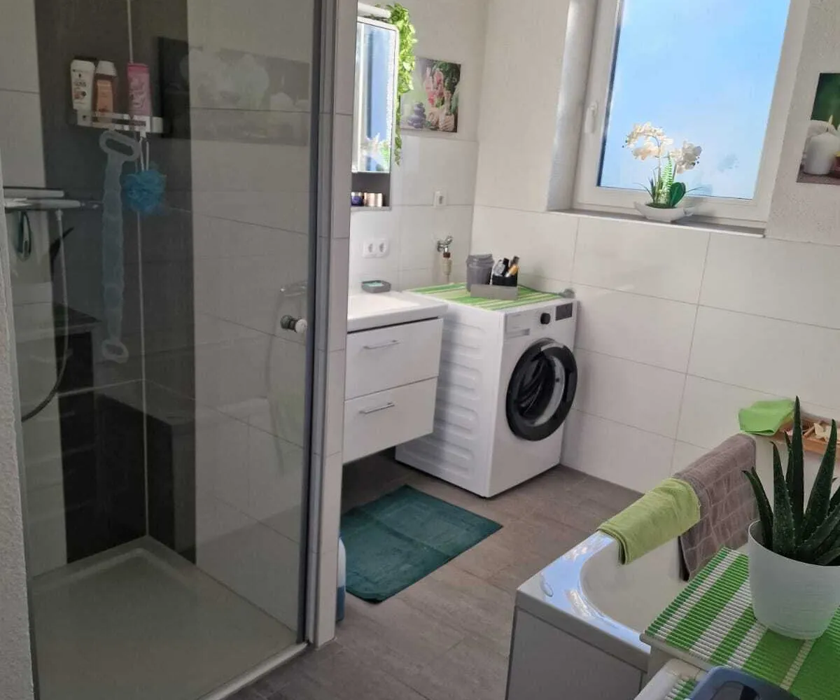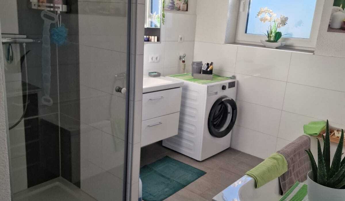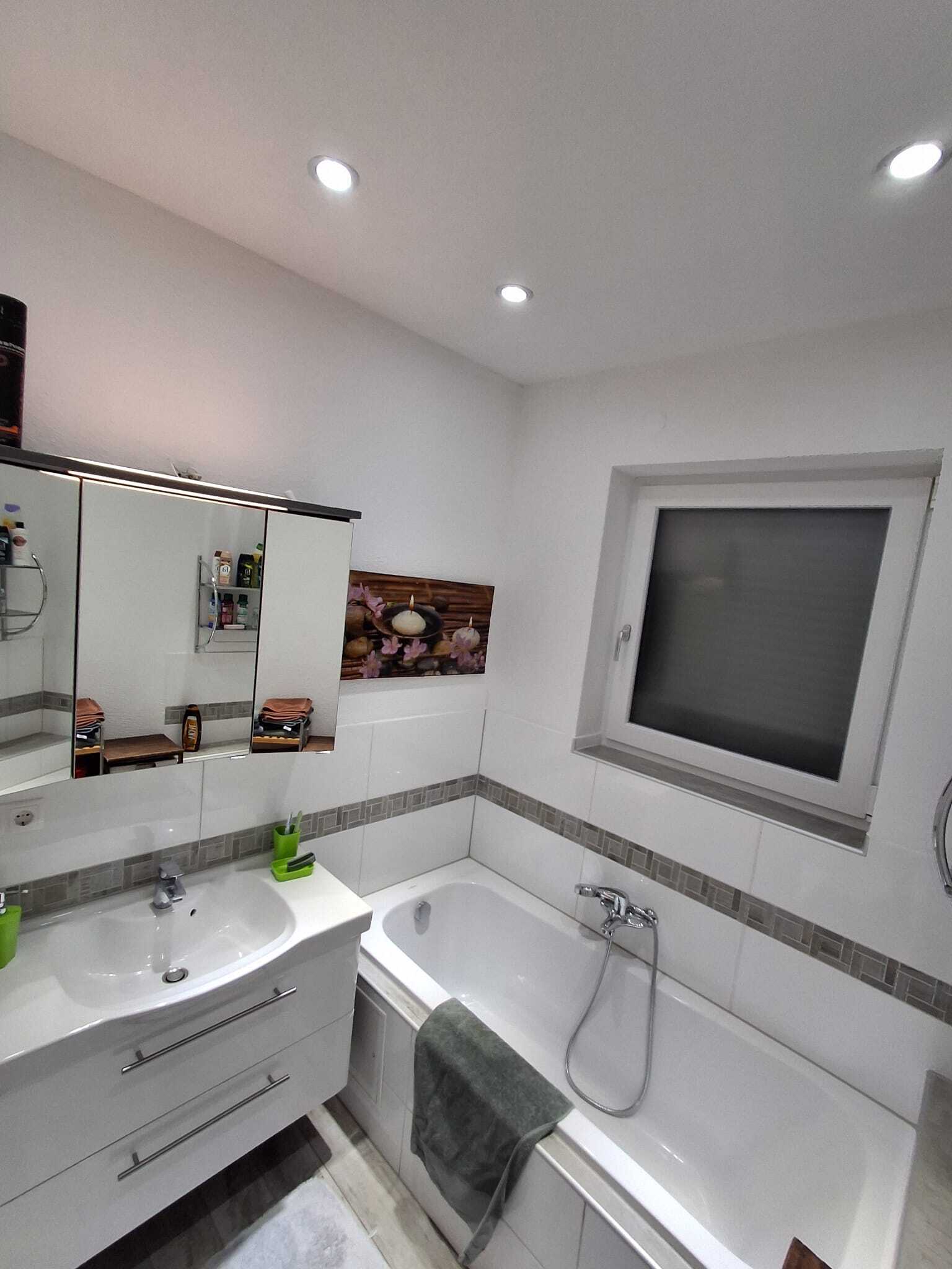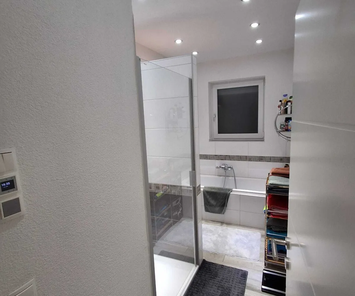 Beim Betreten des Erdgeschosses erreicht man auf der linken Seite das Badezimmer, dieses mit einer Dusche, einer Badewanne und einen Waschbecken ausgestattet ist. Nebenan befindet sich die separate Toilette.