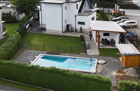 Zum Verkauf gelangt ein großzügiges Einfamilienhaus mit zwei Wohneinheiten und Swimmingpool in Deutschlandsberg.