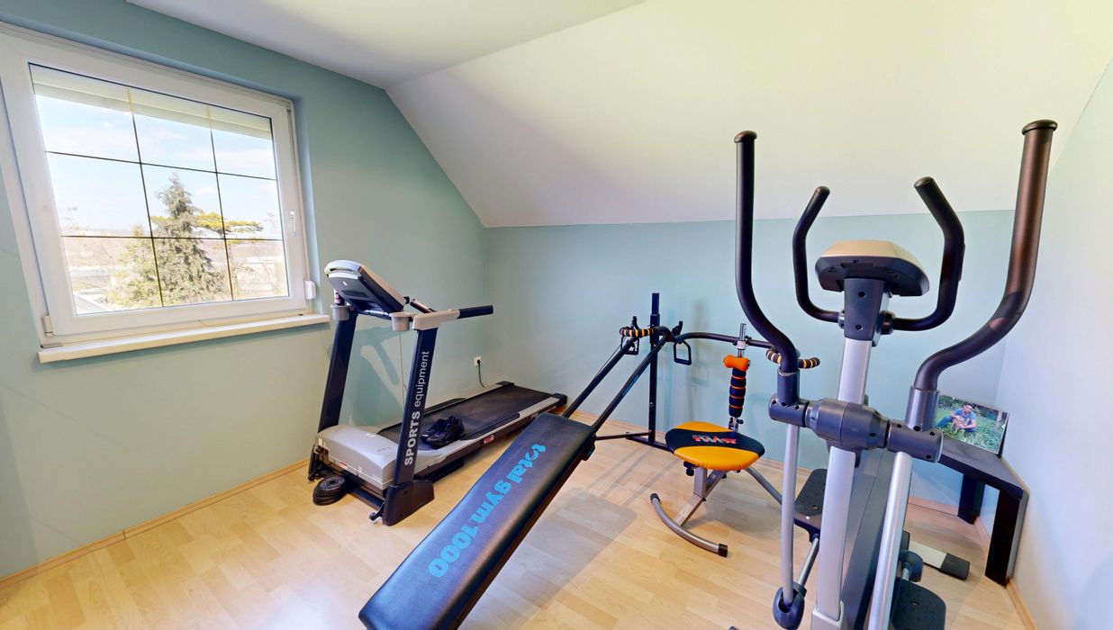 Auch praktische Aspekte kommen in diesem Haus nicht zu kurz. Eine Garage bietet ausreichend Platz für Ihr Auto und Fahrräder. Zusätzlich gibt es einen Abstellraum, in dem Sie Ihre Gartengeräte oder andere Utensilien verstauen können. Ein weiterer Pluspunkt ist der Fitnessraum, in dem Sie sich ganz nach Ihren Wünschen sportlich betätigen können.