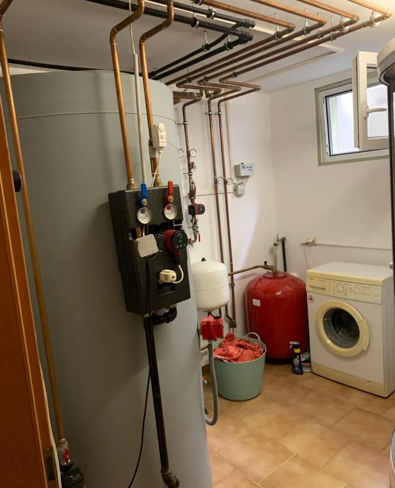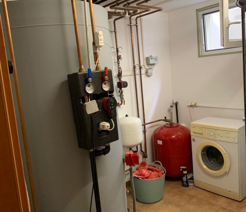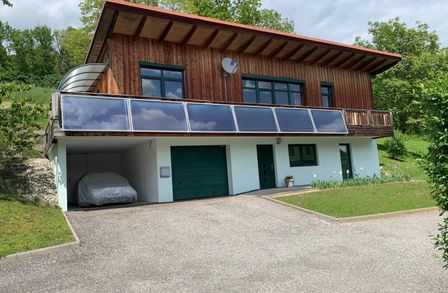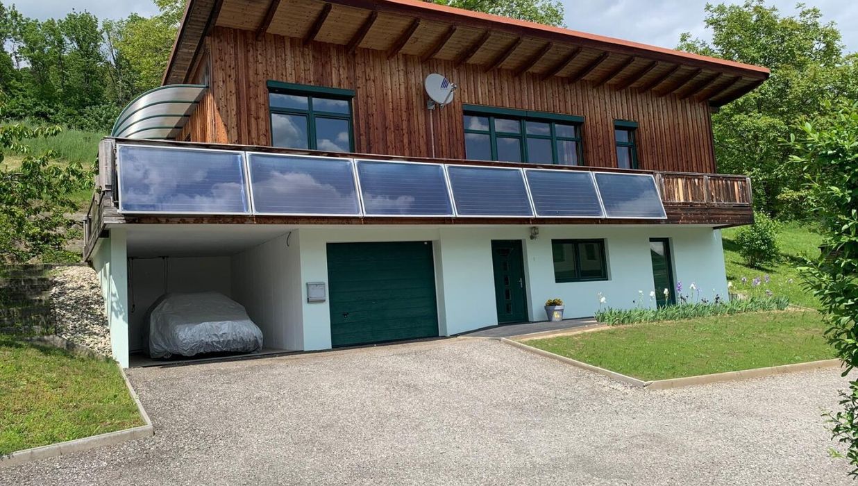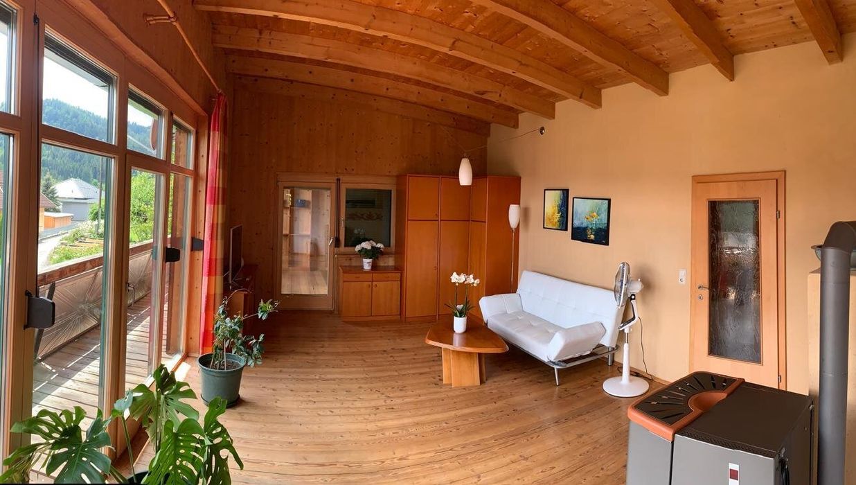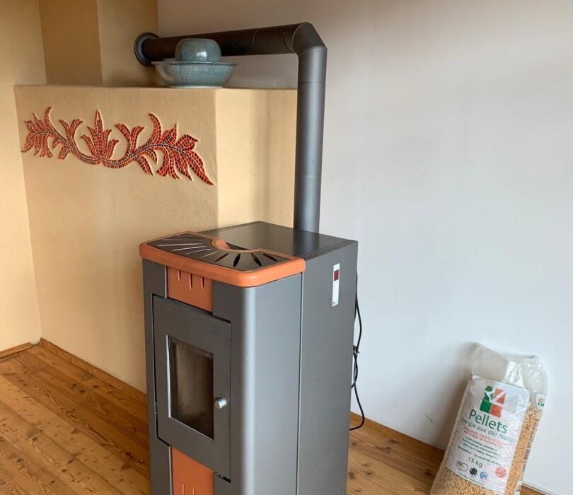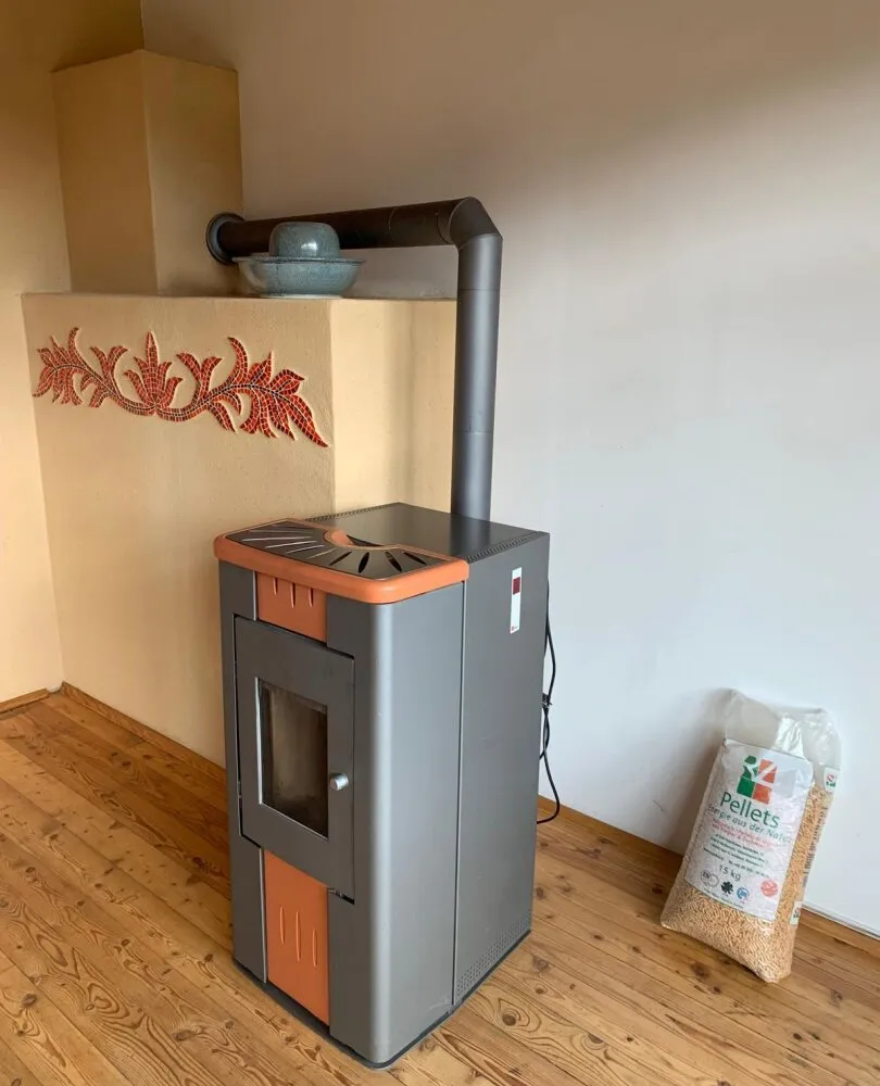 mit Niedrigsten Betriebskosten durch Boden und Wandheizung erzeugt durch die Solarenergie mit Pufferspeicher + Wand- und Fußbodenheizung + Kombiofen mit Automatik für feste Brennstoffe + Pellets-Ofen im Wohnzimmer.