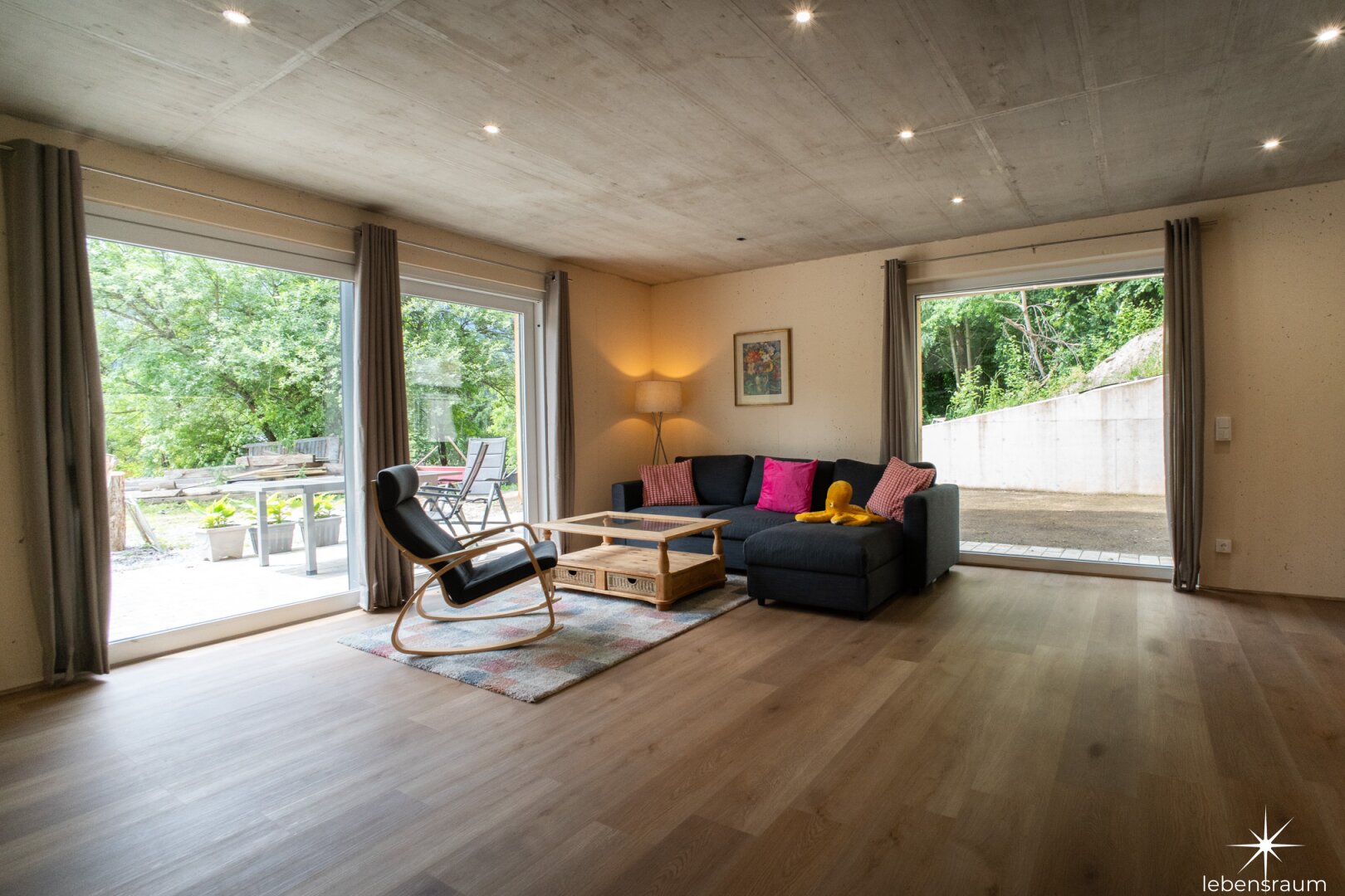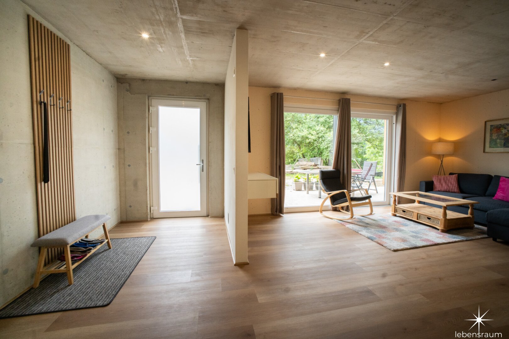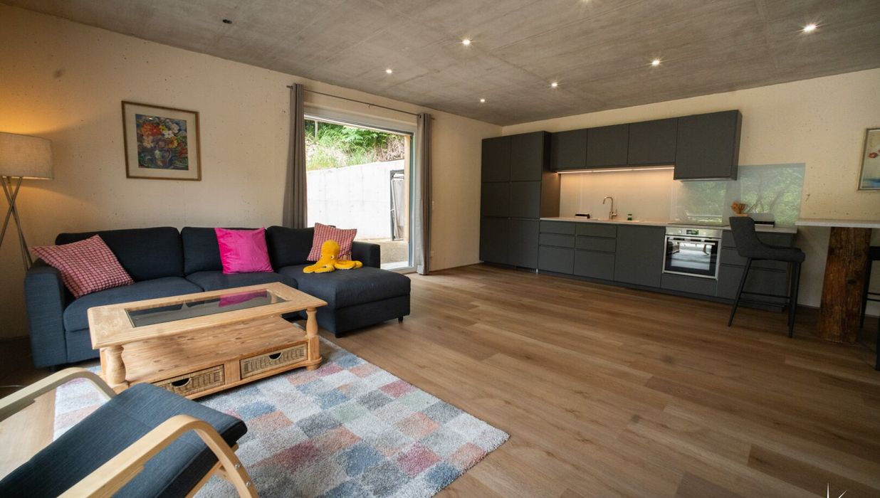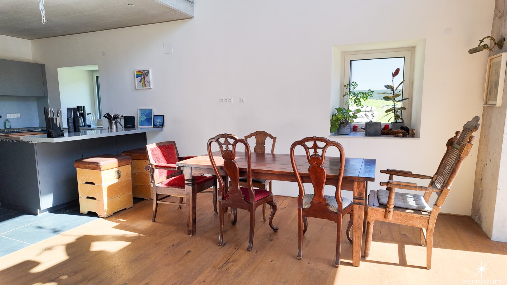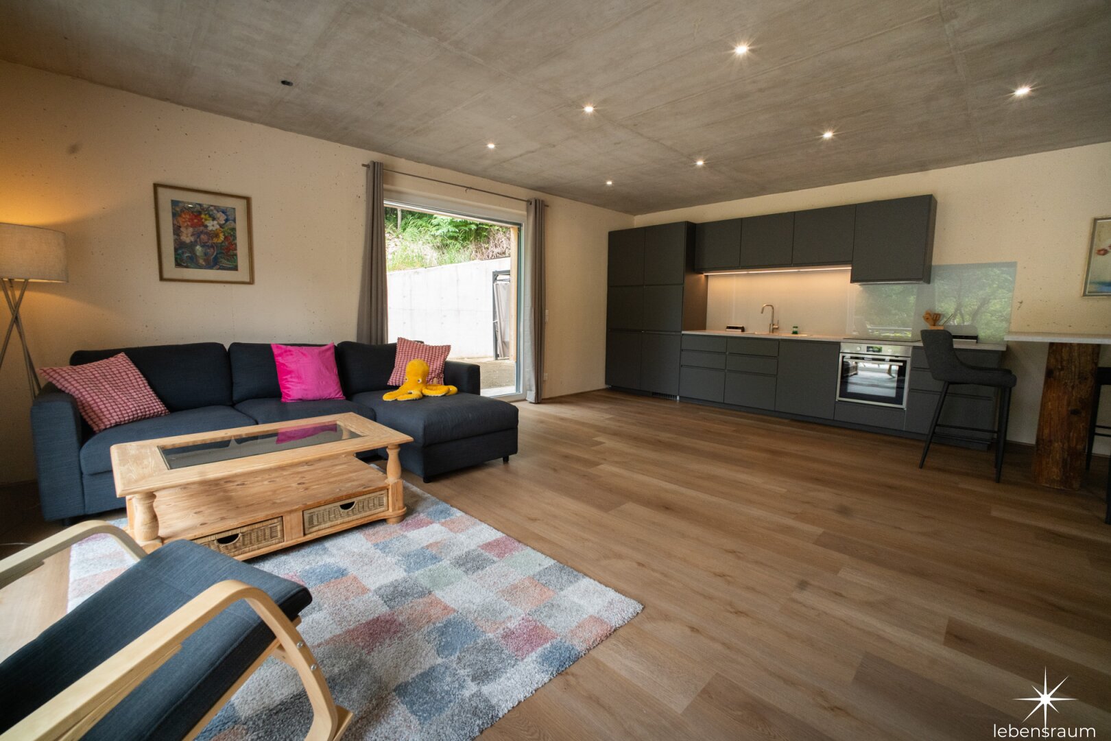 Die offene Wohnküche lädt zu geselligen Abenden mit Freunden und Familie ein. Hier können Sie kulinarische Meisterwerke kreieren und genießen, während Sie den herrlichen Ausblick auf die umliegenden Berge und die grüne Landschaft auf sich wirken lassen. Die großen, bodentiefen Fenster lassen viel Licht in die Räume strömen und bieten einen atemberaubenden Fernblick, der Sie jeden Tag aufs Neue begeistern wird.