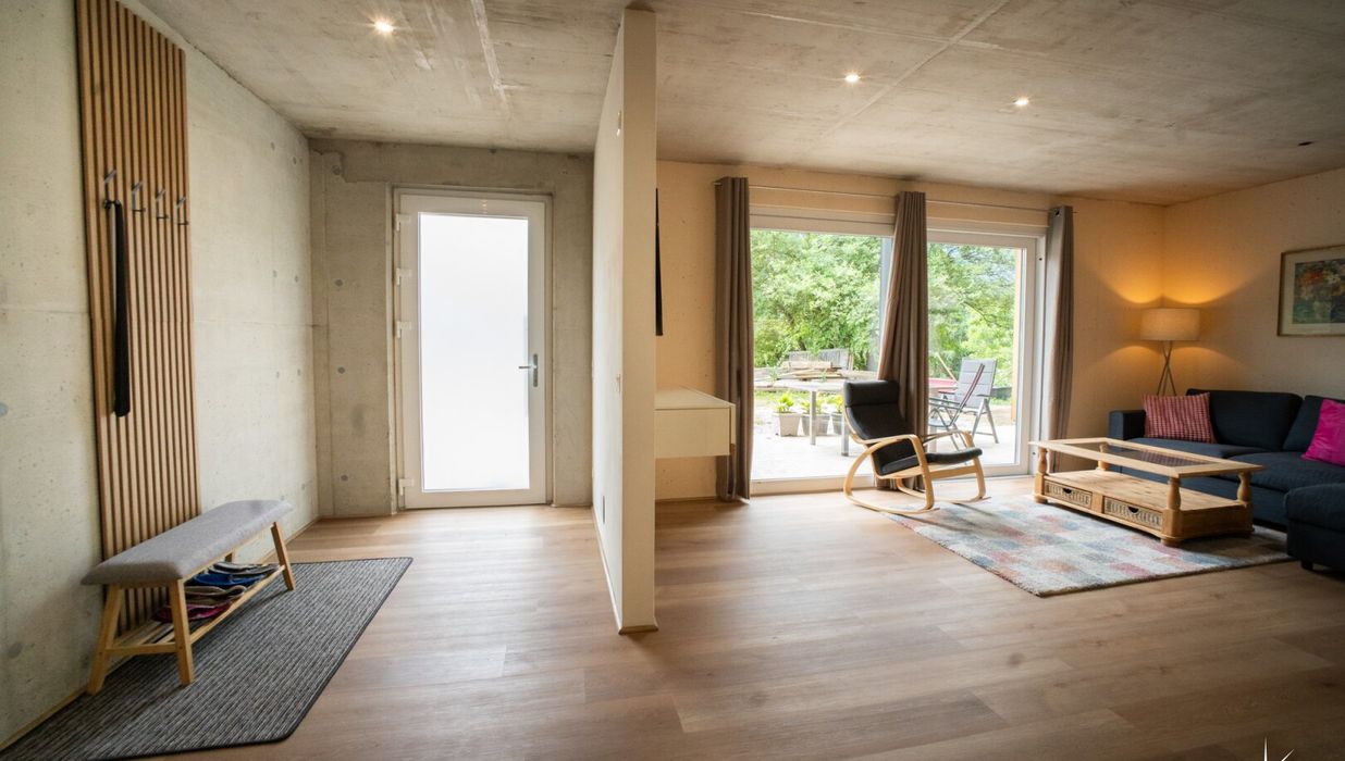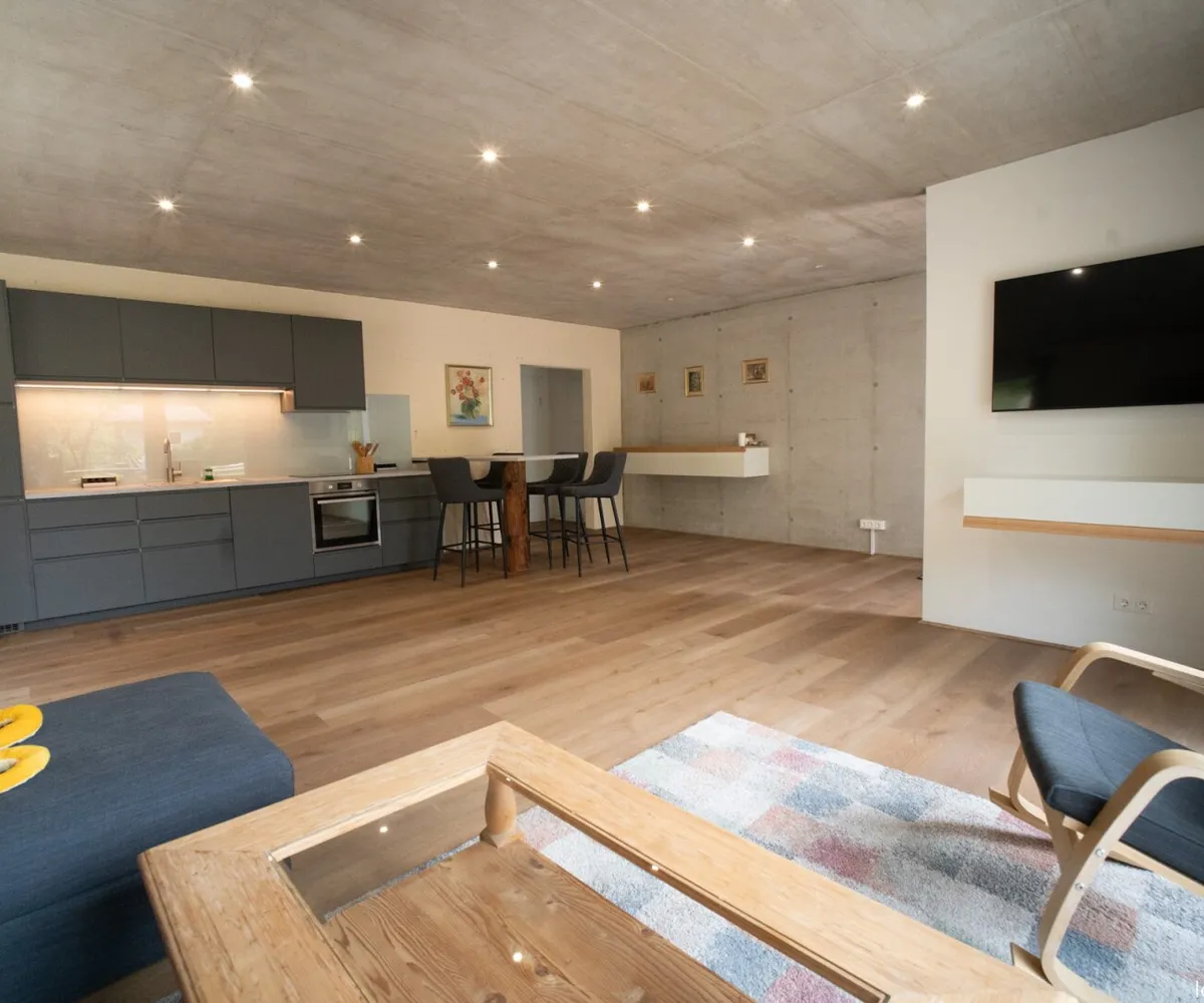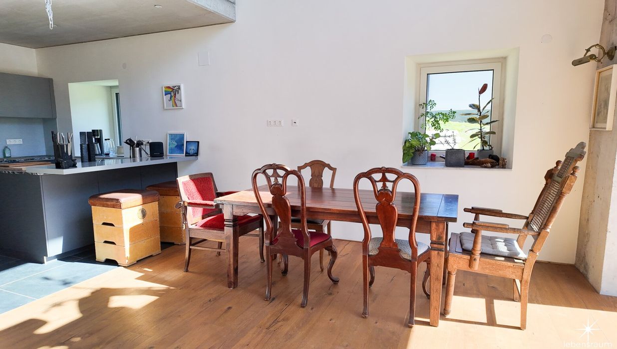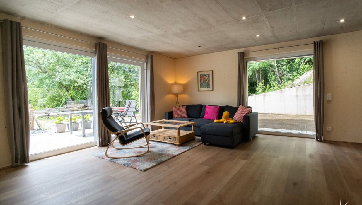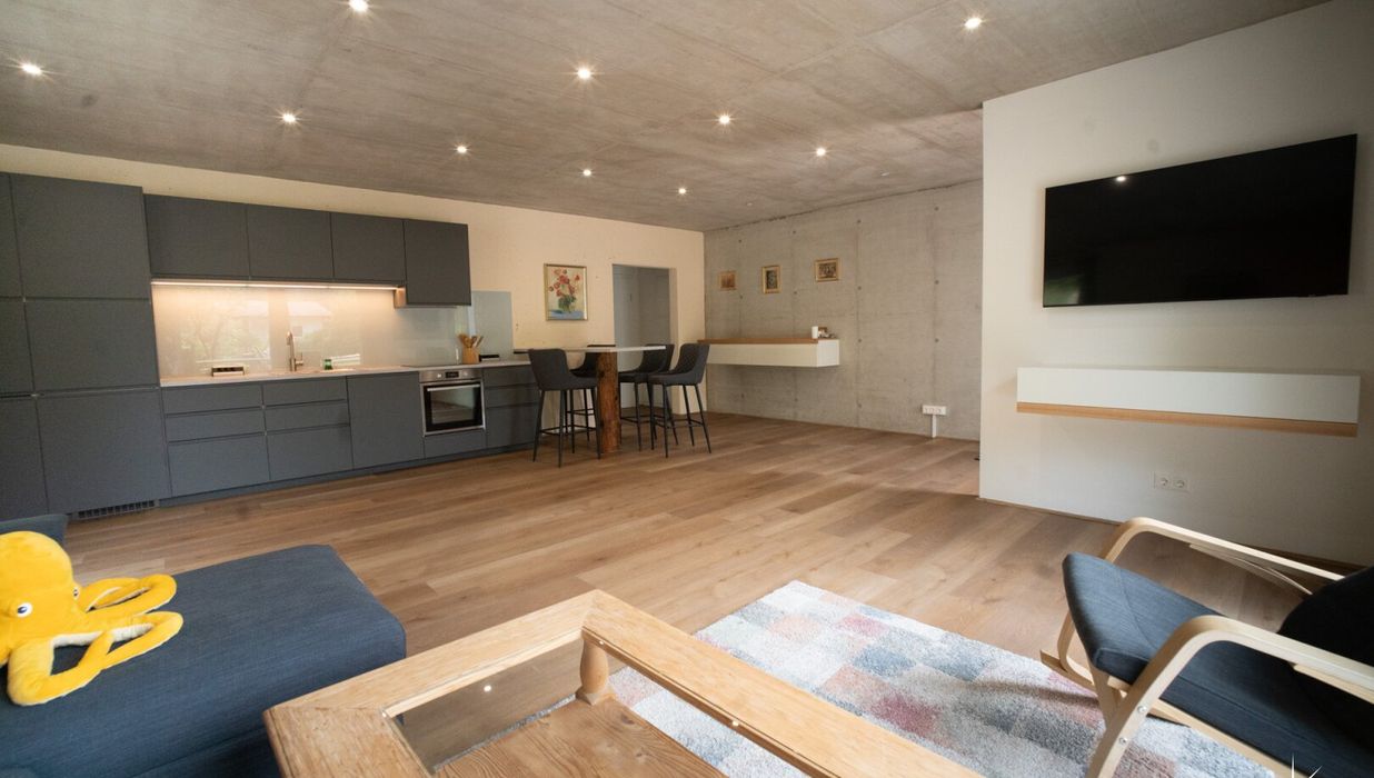 Die offene Wohnküche lädt zu geselligen Abenden mit Freunden und Familie ein. Hier können Sie kulinarische Meisterwerke kreieren und genießen, während Sie den herrlichen Ausblick auf die umliegenden Berge und die grüne Landschaft auf sich wirken lassen. Die großen, bodentiefen Fenster lassen viel Licht in die Räume strömen und bieten einen atemberaubenden Fernblick, der Sie jeden Tag aufs Neue begeistern wird.
