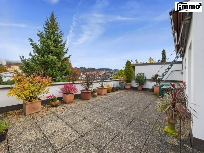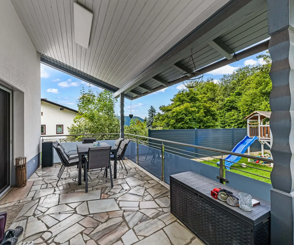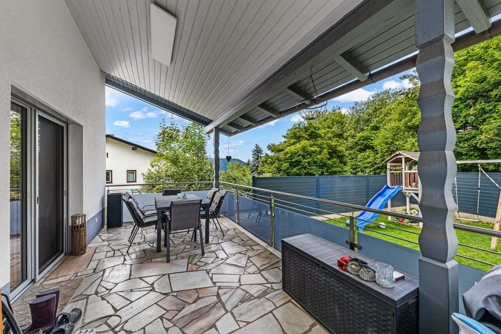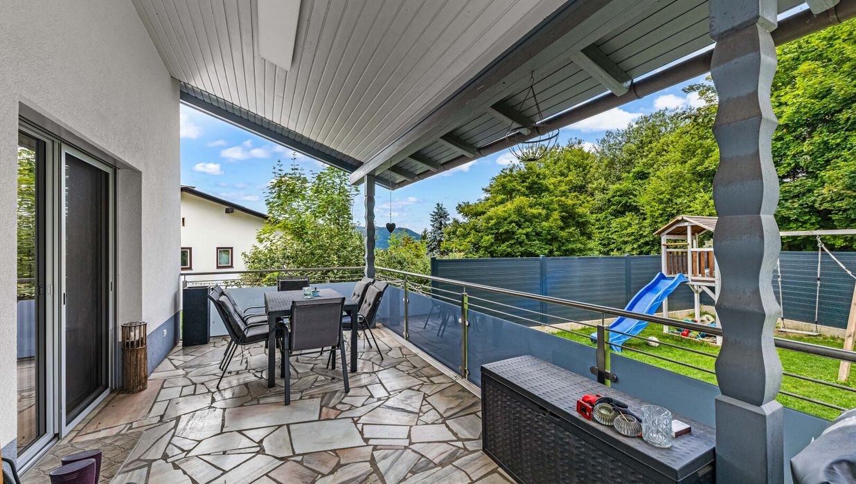Ca. 20 m² große, überdachte Westterrasse mit Blick in den liebevoll gestalteten Garten (ca. 326 m²)