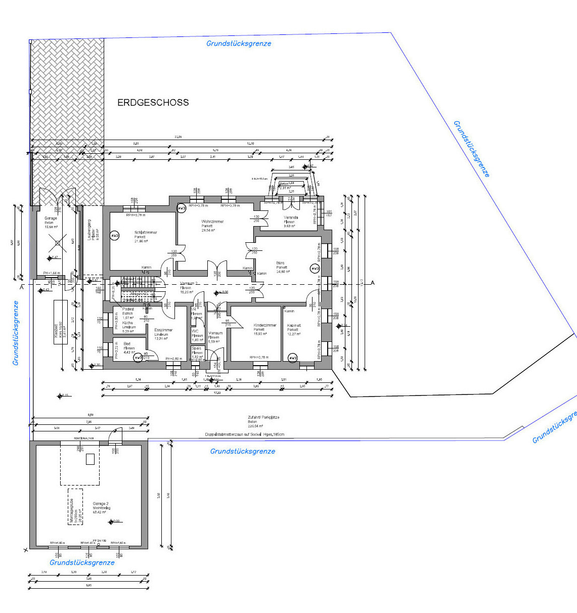Der Eingangsbereich führt in einen verfliesten Vorraum mit rund 6 m², der einen ersten Eindruck der klar strukturierten Architektur vermittelt. Rechterhand befindet sich unmittelbar das etwa 16 m² große Kinderzimmer, während linkerhand eine praktische Abstellkammer mit ca. 1,3 m² zusätzlichen Stauraum bietet. Von hier gelangt man in einen zentralen, rund 15 m² großen Vorraum, der als verbindendes Element sämtliche Räume des Erdgeschosses erschließt. Das Raumangebot im Erdgeschoss überzeugt durch seine Vielfalt: Ein gemütliches Esszimmer mit ca. 12,3 m² bildet gemeinsam mit der angrenzenden, rund 5 m² großen Küche einen funktionalen und dennoch einladenden Wohnbereich. Ergänzt wird diese Ebene durch ein Badezimmer mit etwa 4 m². Vis-à-vis eröffnet sich das großzügige Schlafzimmer mit knapp 22 m², das viel Raum für Ruhe und Rückzug bietet. Das beeindruckende Wohnzimmer mit rund 30 m² bildet das Herzstück des Hauses – lichtdurchflutet und ideal für repräsentatives Wohnen. Ein besonderes Highlight ist das rund 25 m² große Büro, welches sowohl vom Wohnzimmer als auch vom Vorraum aus begehbar ist – ideal für Homeoffice, Atelier oder separate Gästebereiche. Von hier aus erschließt sich ein weiteres Kabinett mit etwa 12 m². Direkt vom Wohnzimmer aus zugänglich befindet sich zudem die rund 10 m² große Veranda bzw. der Wintergarten – ein wunderbarer Ort, um zu jeder Jahreszeit den Blick ins Grüne zu genießen. Der Garten umschließt das gesamte Haus und schafft eine private, grüne Oase mit vielfältigen Gestaltungsmöglichkeiten. Zwei Garagen/Stauräume mit ca. 16 m² und ca. 60 m² runden das Angebot im Erdgeschoss ab.