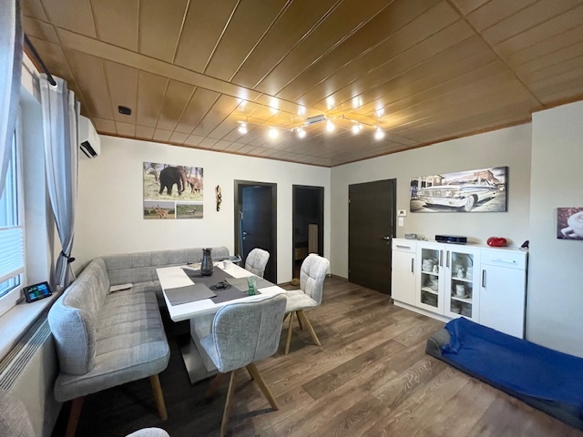 Aufteilung: Vorzimmer, großes Wohnzimmer, Esszimmer, Küche, Schlafzimmer, Kinderzimmer, Wintergarten, Bad und 2x WC.