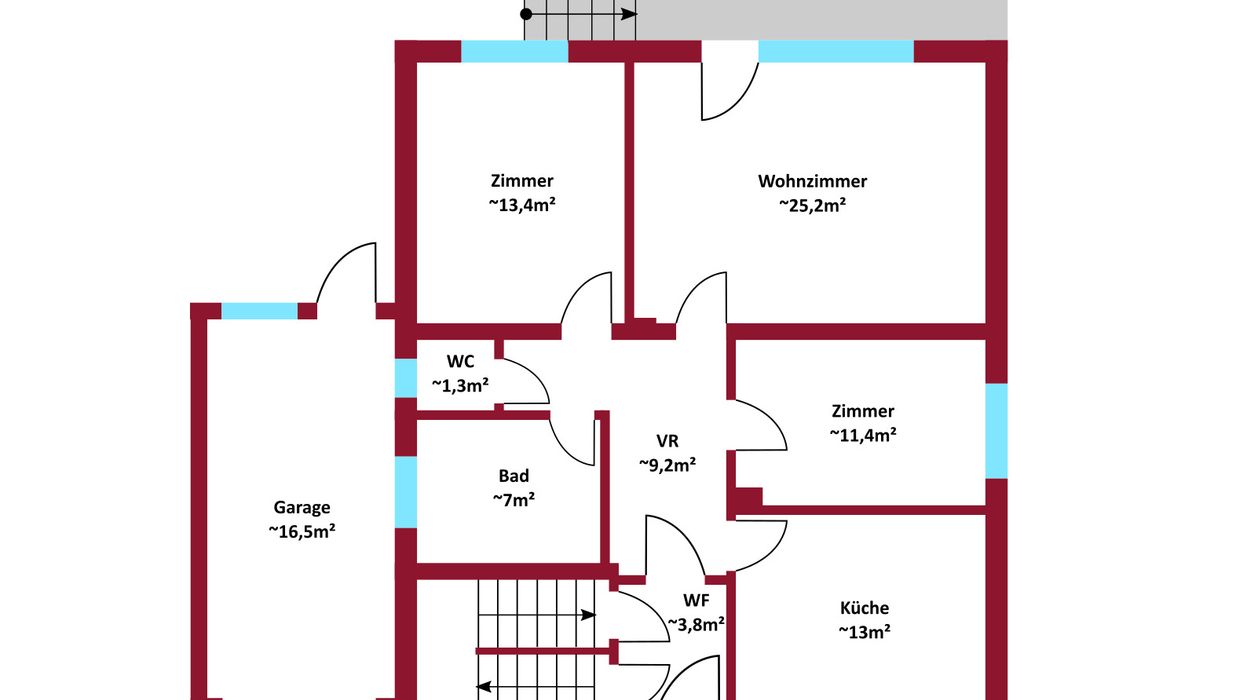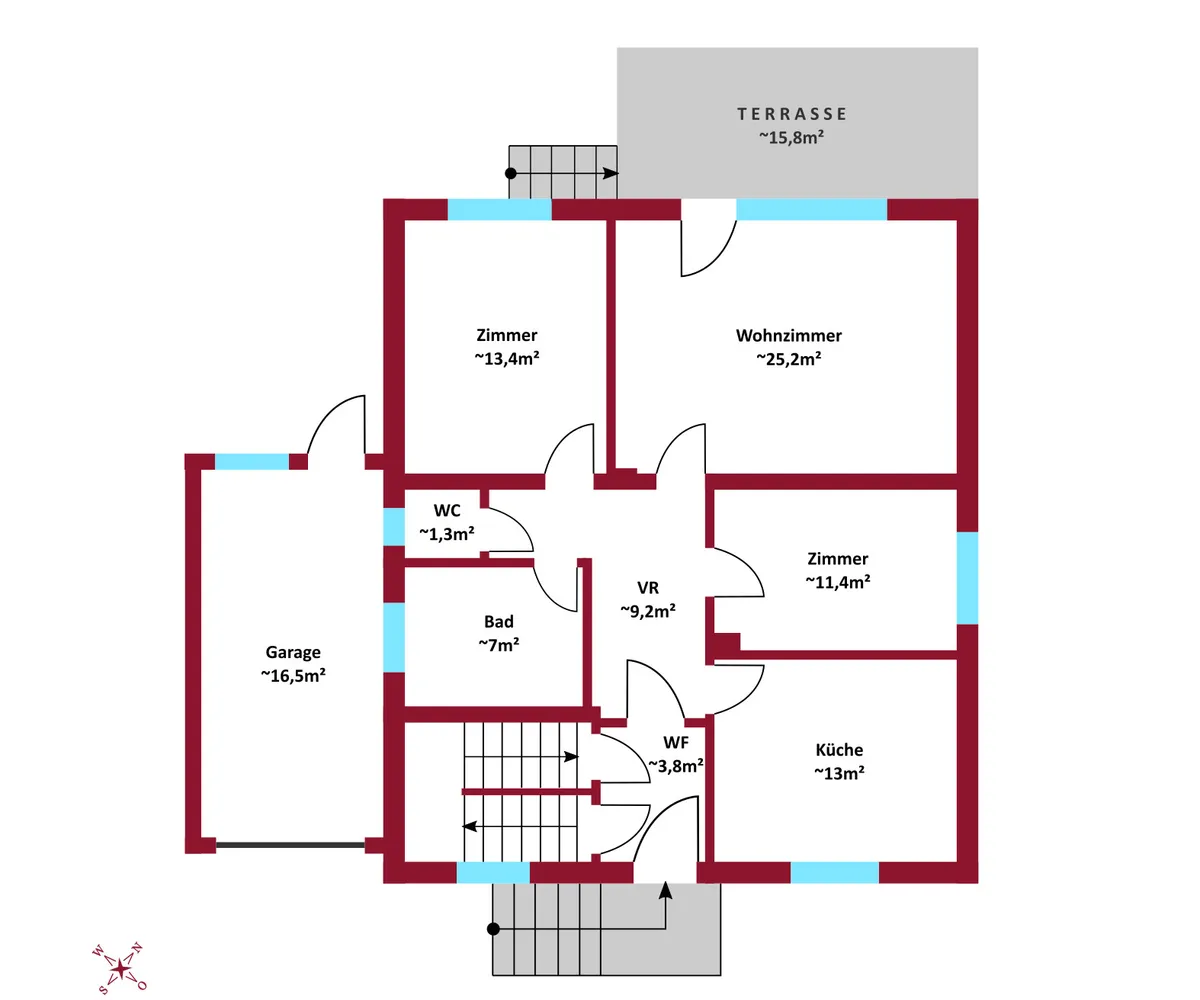 Das Erdgeschoss verfügt über eine Wohnfläche von ca. 84 m², ein Badezimmer, ein separates WC sowie direkten Zugang zur Terrasse (ca. 16 m²) . Die südwestliche Ausrichtung von Terrasse und Garten sorgt für optimale Lichtverhältnisse und lädt dazu ein, den Außenbereich ganz nach eigenen Vorstellungen zu gestalten.