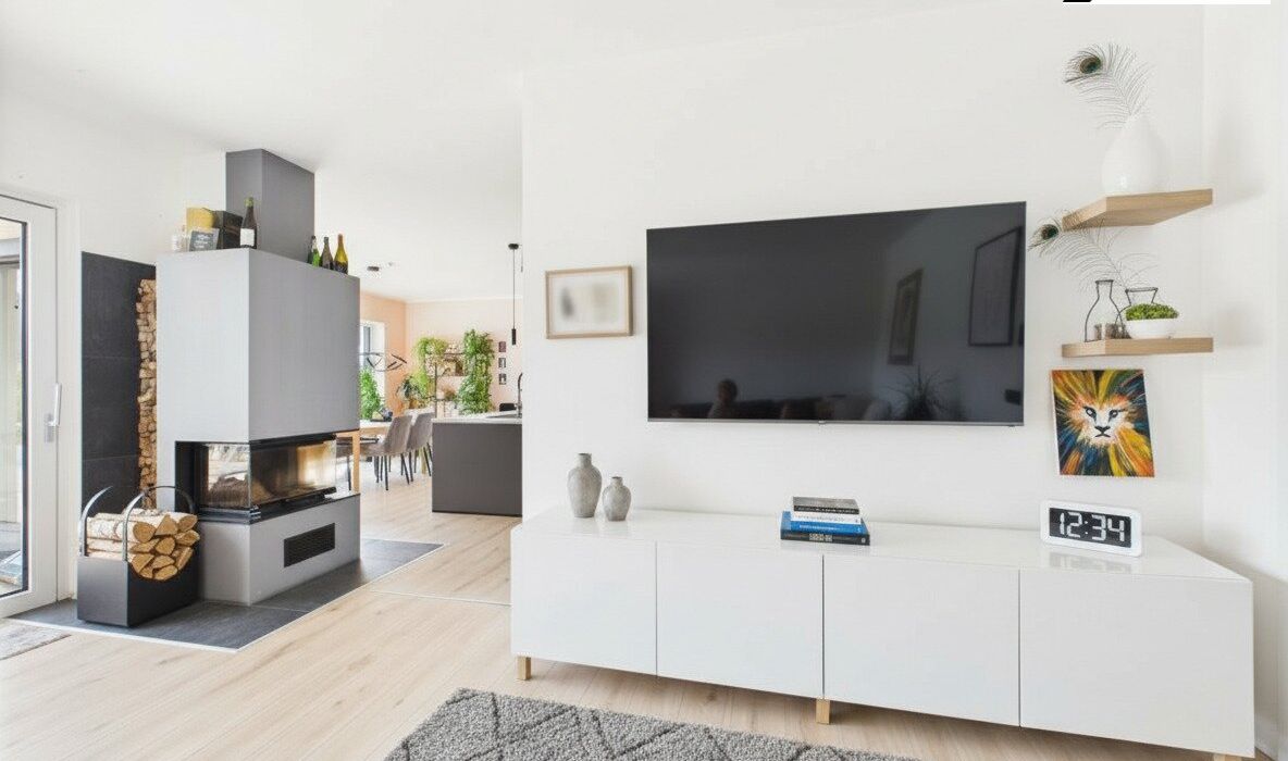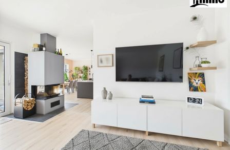 Die Kombination aus Fußbodenheizung, moderner Haustechnik und hochwertiger Bauweise sorgt für ein angenehmes Raumklima und niedrige Betriebskosten. Große Fensterflächen holen die Natur ins Haus und schaffen eine helle, freundliche Atmosphäre. Der Kamin im Wohnzimmer setzt nicht nur optische Akzente, sondern sorgt auch an kühleren Tagen für wohlige Wärme.