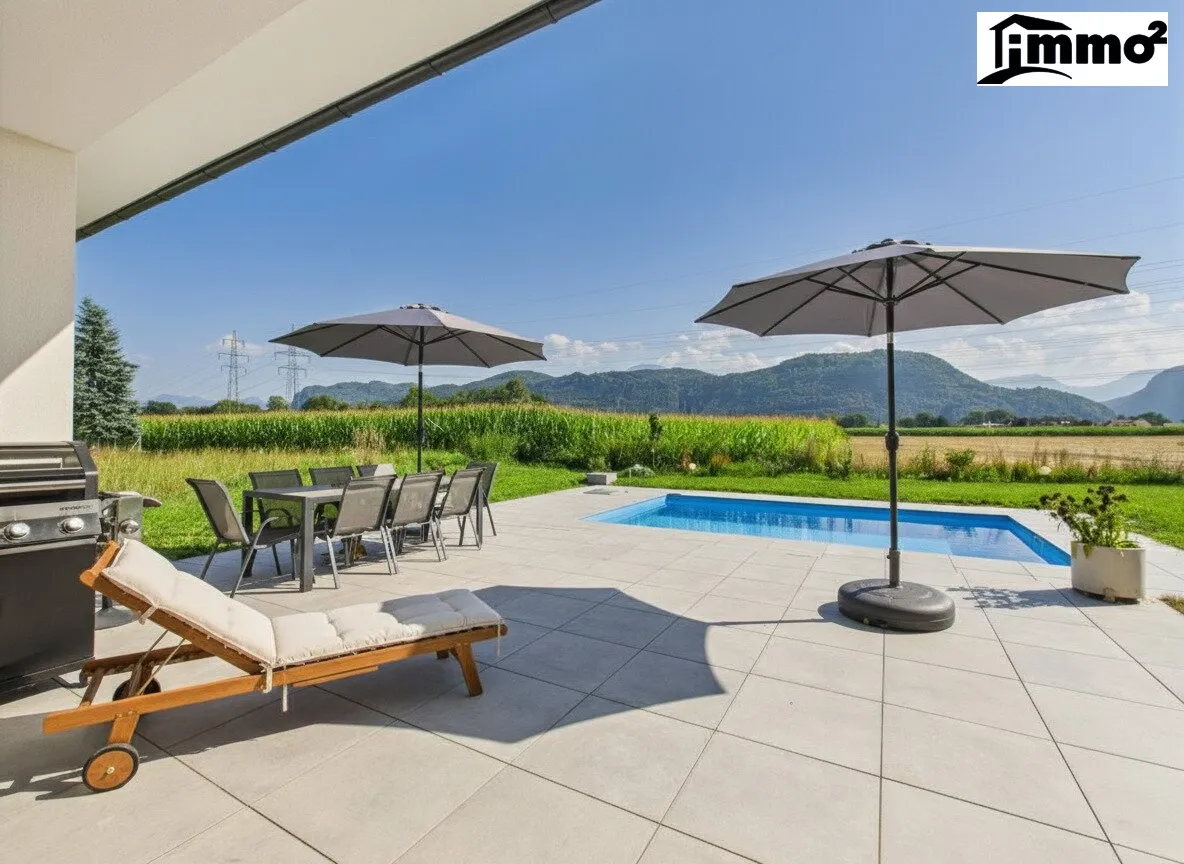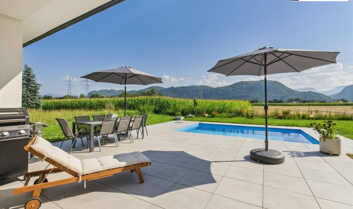 Lage: Ruhige, sonnige Wohnsiedlung mit traumhaftem Blick auf Berge und Wiesen, ca. 12 Fahrminuten nach Klagenfurt