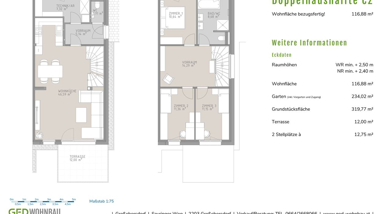 Das Erdgeschoss besteht aus einem lichtdurchfluteten offenen Wohn-, Koch- und Essbereich mit Zugang auf die Terrasse und in den Garten. Auf dieser Ebene befinden sich das Vorzimmer, ein Gäste-WC, der Technikraum und ein zusätzlicher Abstellraum, der auch gut als Büro genutzt werden kann. Im Obergeschoss befinden sich drei getrennt begehbare Schlafzimmer sowie ein großzügiges Badezimmer mit Fenster. Die Terrasse und der südseitig ausgerichtete Garten laden zum Entspannen und Seele baumeln lassen ein.