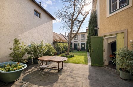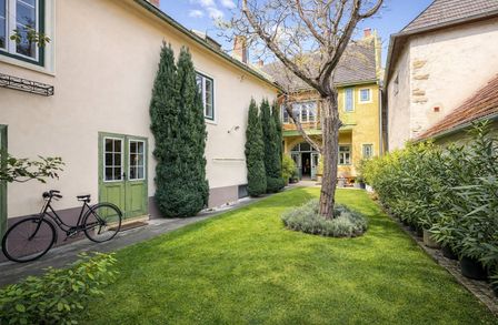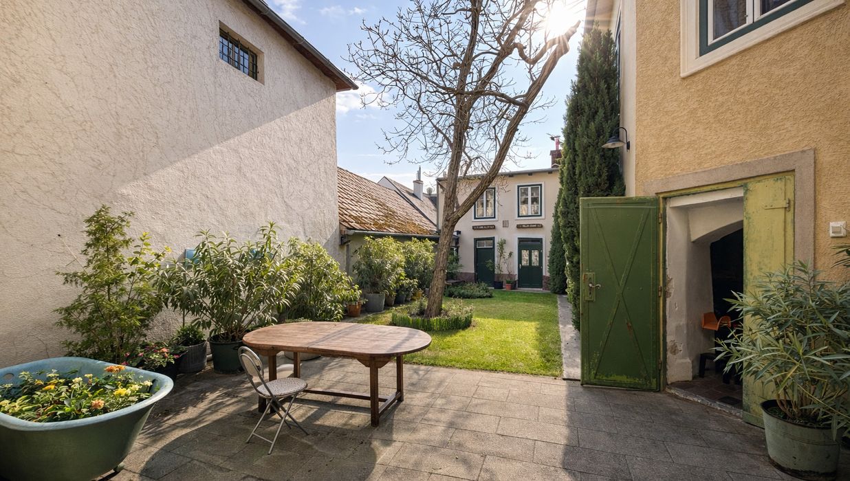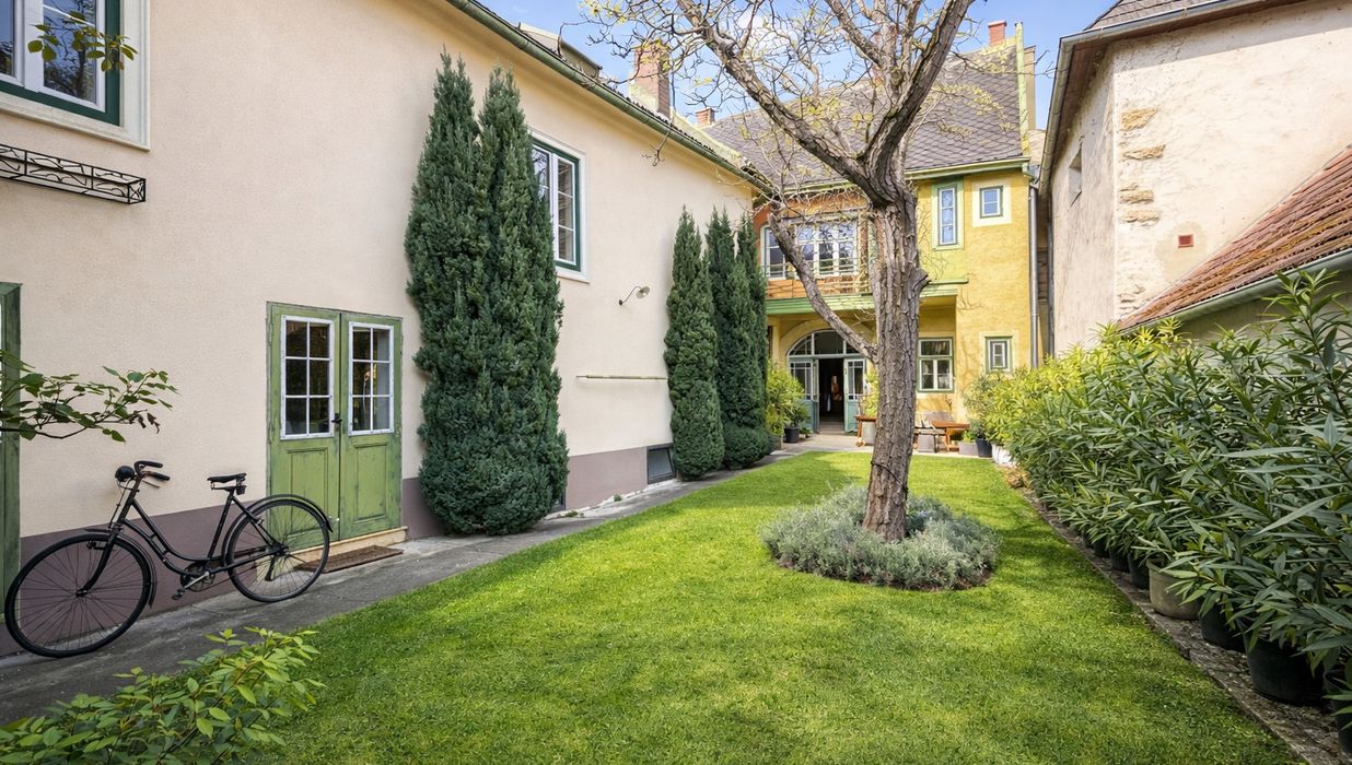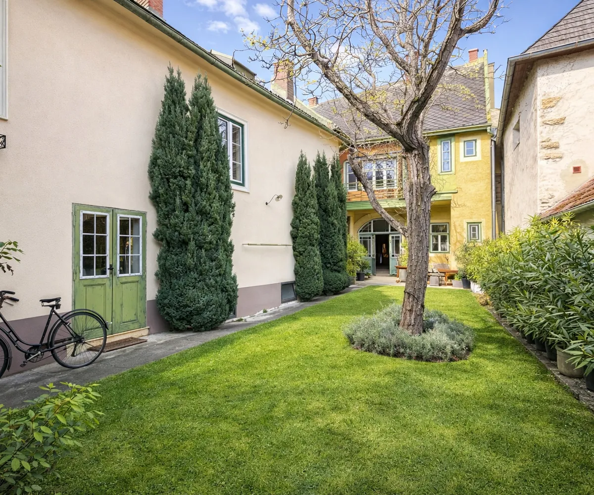 Ein besonderes Highlight ist der idyllische Innenhofgarten – ein geschütztes Refugium, das Ruhe und Natur vereint. Von hier aus gelangt man sowohl in den hinteren Gebäudeteil als auch in den großzügigen Weinkeller und weitere Lagerräumlichkeiten, die das Herz eines jeden Weinliebhabers höherschlagen lassen.