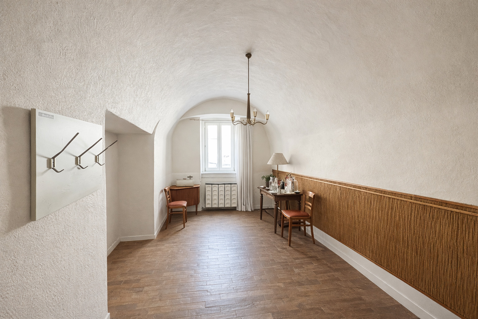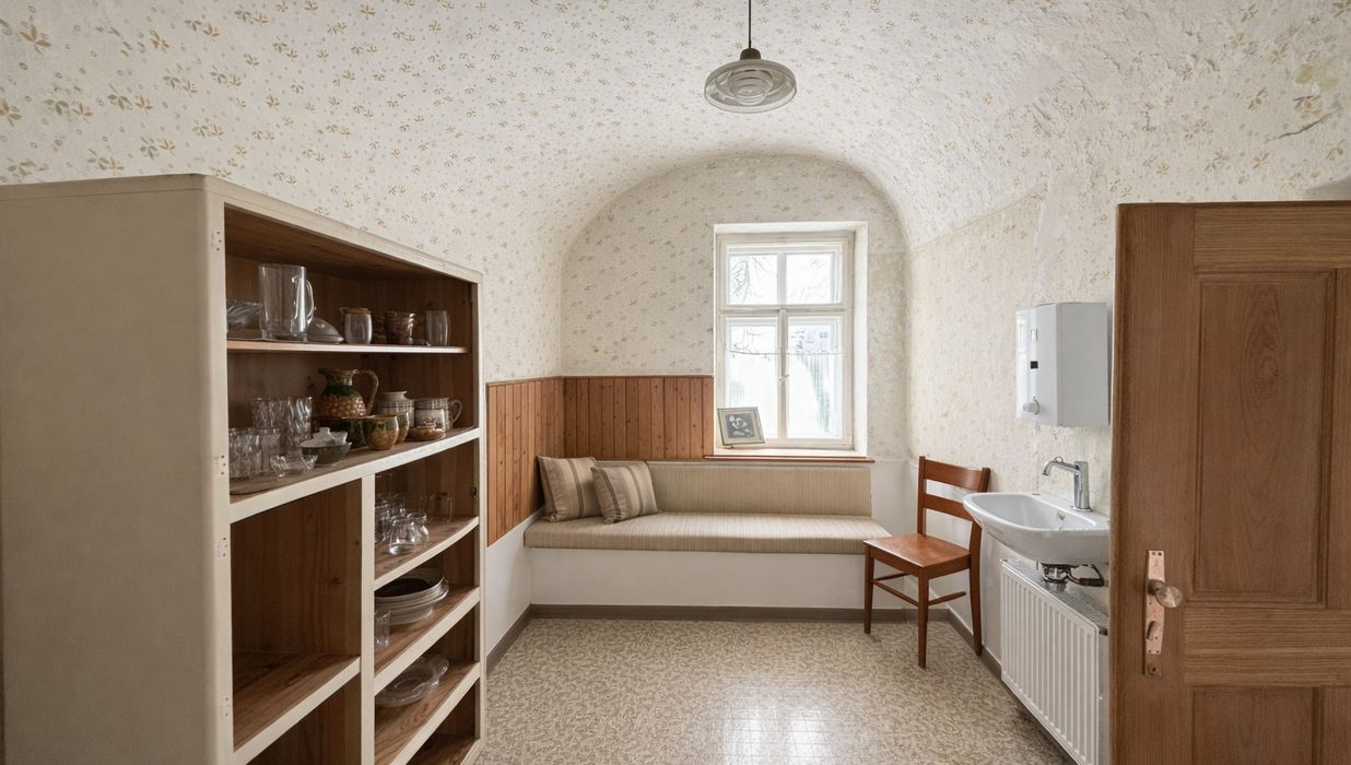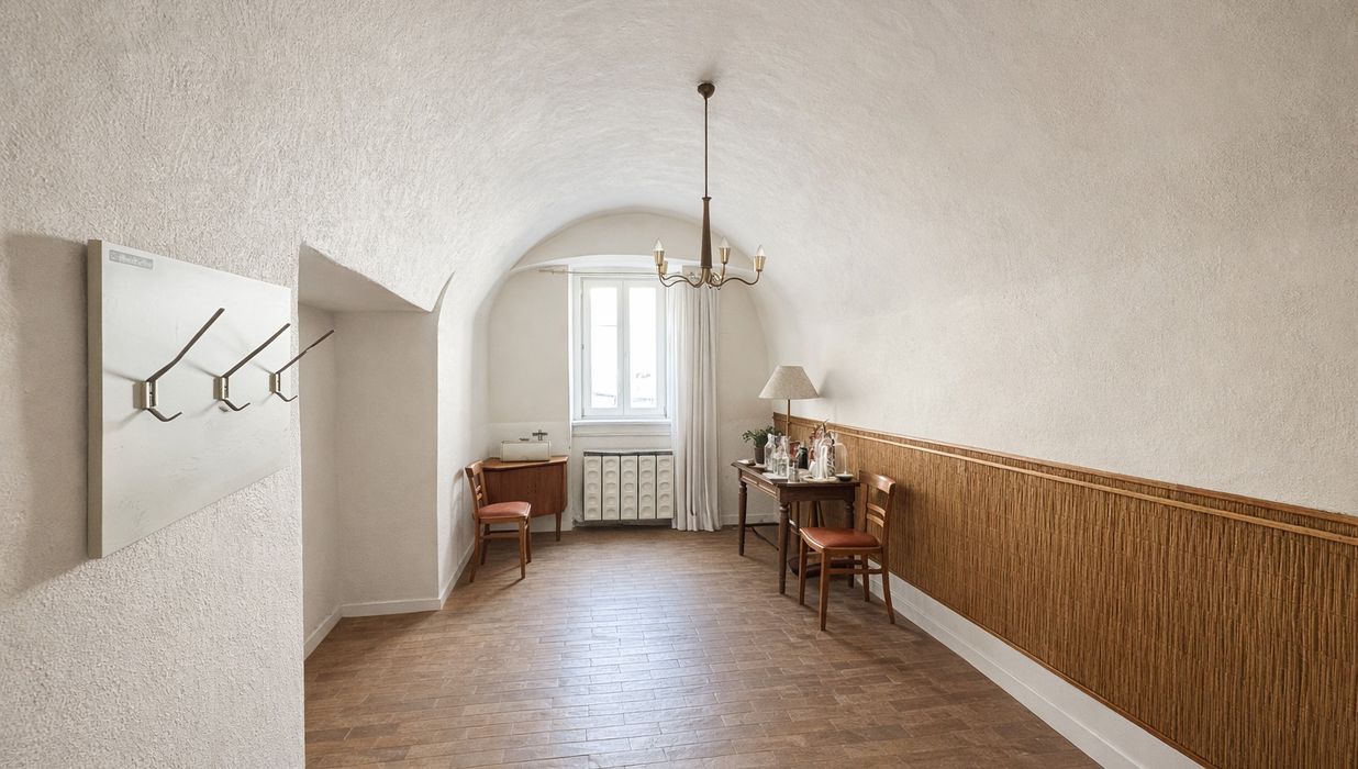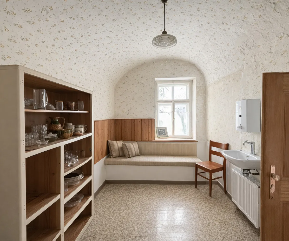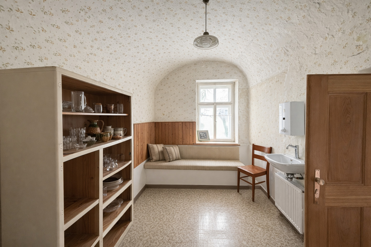 Der vordere Bereich im Erdgeschoss diente einst als Ausschank und lädt auch heute dazu ein, diese Tradition neu zu interpretieren – sei es gastronomisch, kreativ oder als einladender Wohnbereich. Im Obergeschoss befindet sich eine bereits bewohnbare Einheit, die sofort genutzt werden kann und einen ersten Rückzugsort inmitten der eigenen Baustelle bietet.