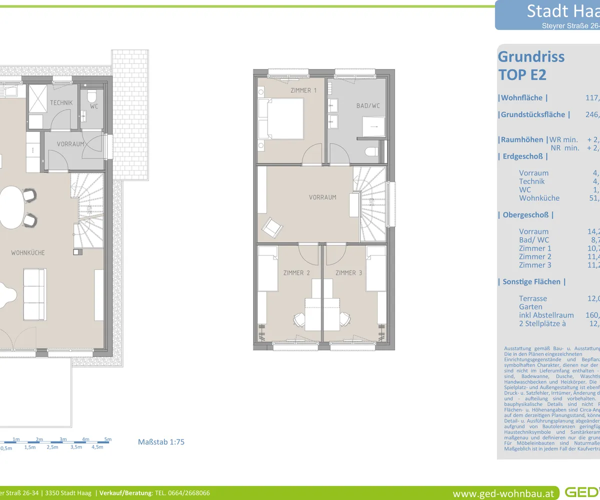 Das Erdgeschoss besteht aus einem lichtdurchfluteten offenen Wohn-, Koch- und Essbereich mit Zugang auf die südseitig ausgerichtete Terrasse und in den Garten. Auf dieser Ebene befinden sich außerdem das Vorzimmer, ein Gäste-WC, der Technikraum und ein zusätzlicher Abstellraum. Im Obergeschoss befinden sich drei getrennt begehbare Schlafzimmer mit einer Galerie (Option für Schrankraum), sowie ein großzügiges Badezimmer mit Fenster und einem WC. Jeder Garten verfügt über einen Geräteraum.