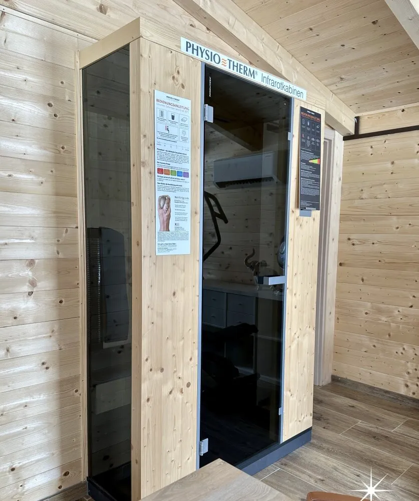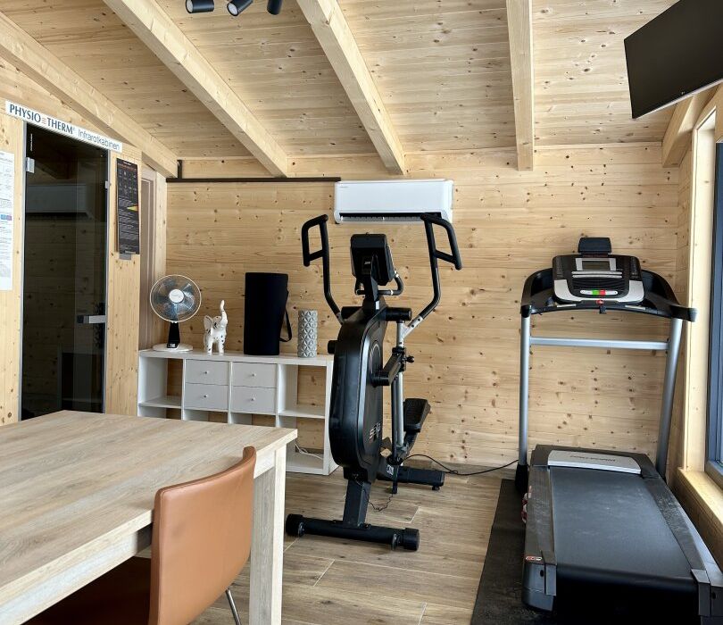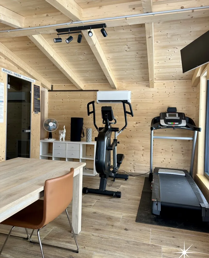Separater Rückzugsort im Büro: Ganz gleich, ob Sie von zu Hause aus arbeiten oder einen ruhigen Ort zum Entspannen suchen, das separate Bürogebäude im Garten umfasst ein privates Fitnessstudio sowie eine Sauna und verbindet Produktivität und Wellness in einer ruhigen alpinen Umgebung.