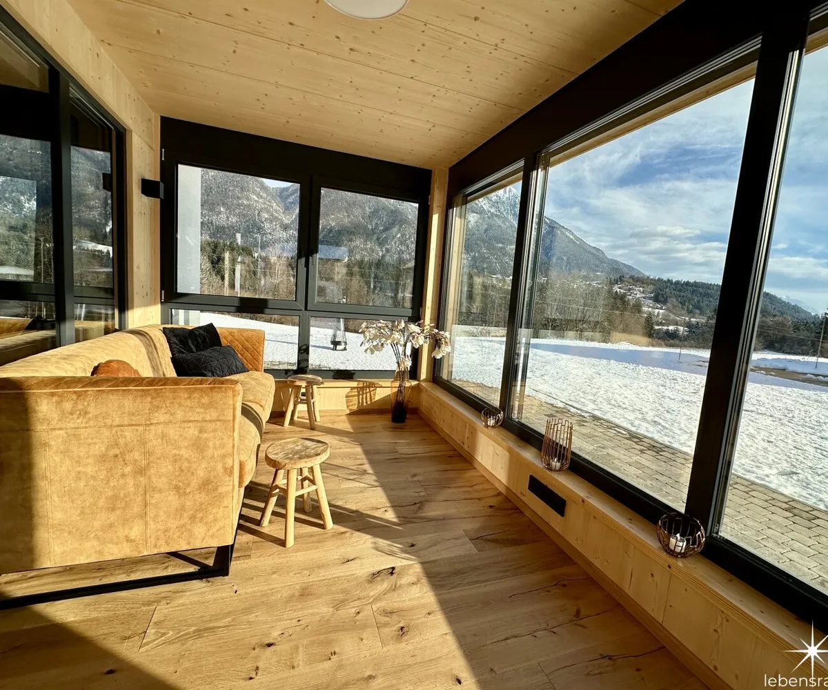 Atemberaubender Wintergarten: Betreten Sie den Wintergarten und lassen Sie sich vom Panoramablick auf die Berge verzaubern, ideal für gemütliche Winterabende oder zum Genießen der sonnenverwöhnten österreichischen Landschaft.