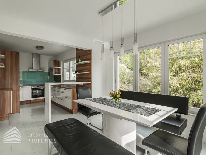 Zum Verkauf gelangt ein traumhaftes, hochwertig möbliertes Einfamilienhaus mit Einliegerwohnung, Pool und Garten in Hinterbrühl.