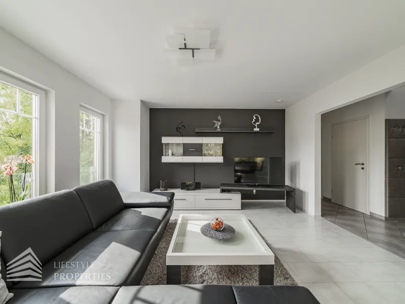 Sie betreten die Immobilie und befinden sich im geräumigen Eingangsbereich, von dem aus Sie in das ca. 29 m² große Wohnzimmer gelangen. Dieses wird durch die großen Fenster angenehm mit Licht durchflutet und ist mit einer schwarzen Couch, einem Esstisch sowie TV-Möbeln ausgestattet. Etwas vom Raum abgetrennt finden Sie die Einbauküche vor, welche mit modernen Geräten ausgestattet ist, eine große Arbeitsfläche sowie viel Stauraum bietet. Vom Wohnzimmer aus gelangen Sie auf den gemütlichen Balkon, der zum Entspannen an der frischen Luft einlädt und einen atemberaubenden Ausblick bietet. Nebenan finden Sie ein ca. 11 m² großes Zimmer vor, welches beispielsweise als Büro genutzt werden kann. Ein großes Fenster versorgt den Raum mit ausreichend Tageslicht. Des Weiteren finden Sie im Erdgeschoss ein Badezimmer mit Dusche und Toilette sowie einen praktischen Abstellraum vor.