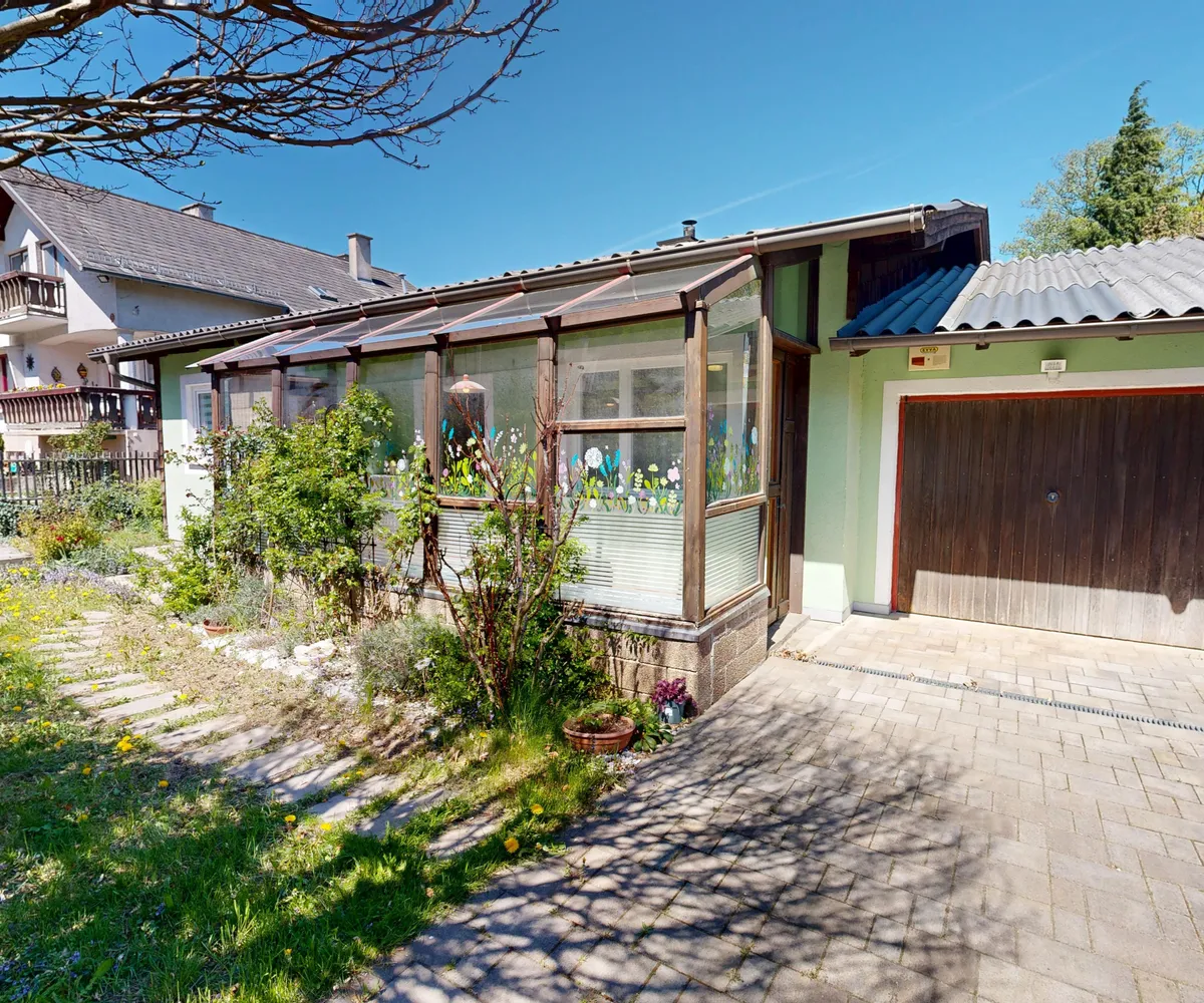 Ein besonderes Highlight ist der großzügige, sonnige Garten, der sich eben erstreckt und vielfältige Nutzungsmöglichkeiten eröffnet. Der Garten präsentiert sich teilweise mit gewachsenem Baumbestand, während offene Bereiche ein angenehmes, lichtdurchflutetes Ambiente schaffen. Über ein kleines Gartentor gelangen Sie direkt zur Sparbach – ein seltenes und besonders attraktives Detail, das dieser Liegenschaft einen einzigartigen Charakter verleiht.