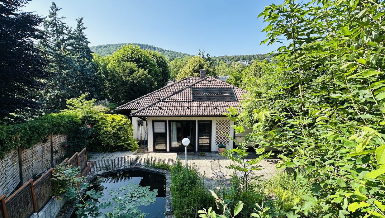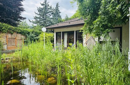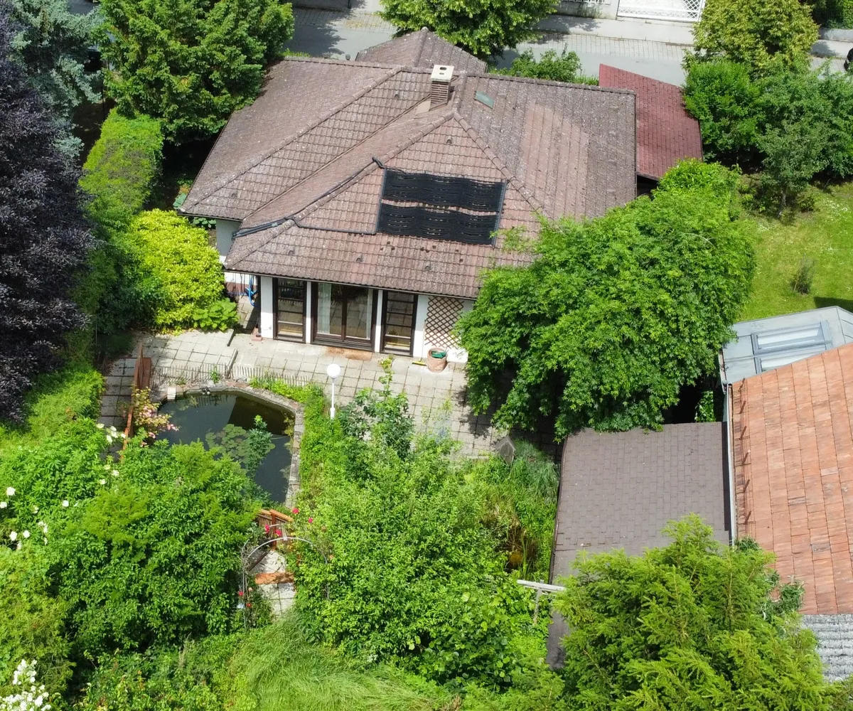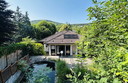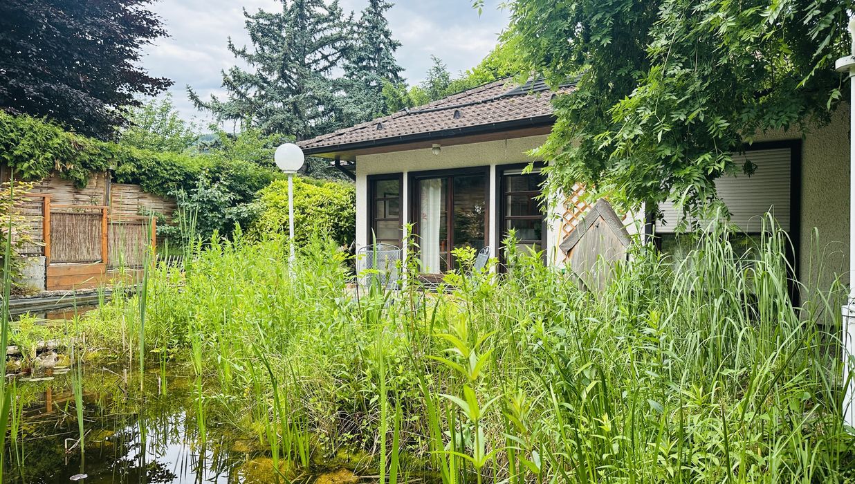 Das Haus liegt in ruhiger und praktisch uneinsehbarer Lage in einer Villengegend im Herzen der Hinterbrühl. Der Garten wurde naturnah gestaltet und ist in zwei Bereiche unterteilt: Vor der Terrasse dominiert ein Schwimmbiotop mit bis zu 2 m Wassertiefe und einer Regenerationszone den unteren Bereich des Gartens. Büsche und Altbaumbestand sorgen für ausreichend Beschattung und Blühendes für Gartenfreude zu jeder Jahreszeit. Der obere Bereich des Gartens (in Hanglage) ist über eine seitliche Treppe zu erreichen. Hier wurde naturnah gegärtnert und ein Refugium für Igel, Insekten und Eichkätzchen geschaffen. Auf der oberen Wiese hätte neben dem vorhandenen Sitzplatz mit Blick zur Römerwand und den umliegenden Erhebungen des Wienerwaldes auch noch ein Gartenhäuschen Platz. Hier stört nichts und niemand Ihre Ruhe und die intakte Natur rundherum ermöglicht auch Ihren Kindern, das I-Pad im Zimmer zu lassen und inmitten der Natur auf Entdeckungsreise zu gehen.