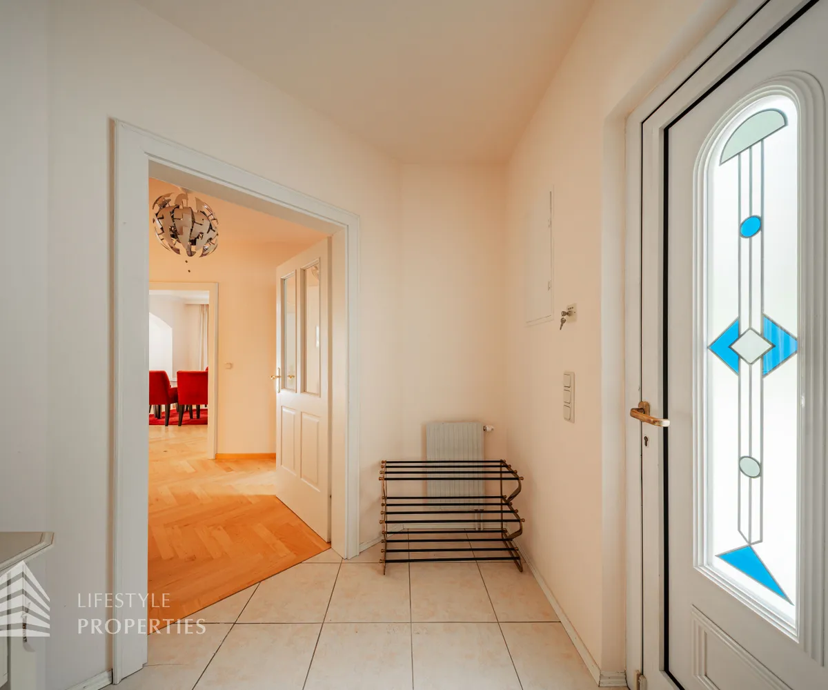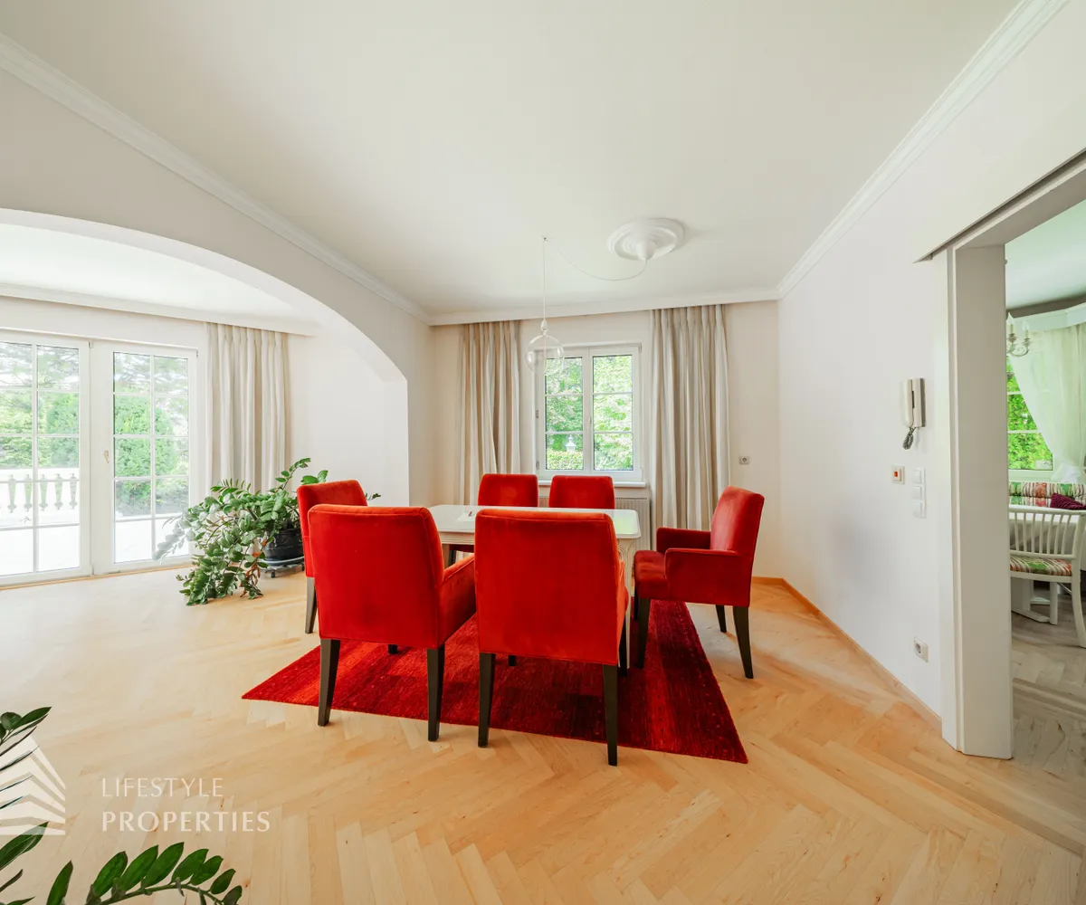 Beim Betreten der Villa befindet man sich direkt im Vorraum, diese mit einer großzügigen Garderobe und einen Windfang aus Glas ausgestattet ist. Rechts vom Eingang befindet sich die Toilette. Durch die Glastüre erreicht man den Essplatz und den exklusiven Wohnbereich mit seiner faszinierenden Ausstattung und den offenen Kamin, dieser durch zwei Stufen, mit edlen Säulen verbunden ist und durch die vielen Glasfronten und den Türen zur Terrasse mit viel Tageslicht durchflutet ist.