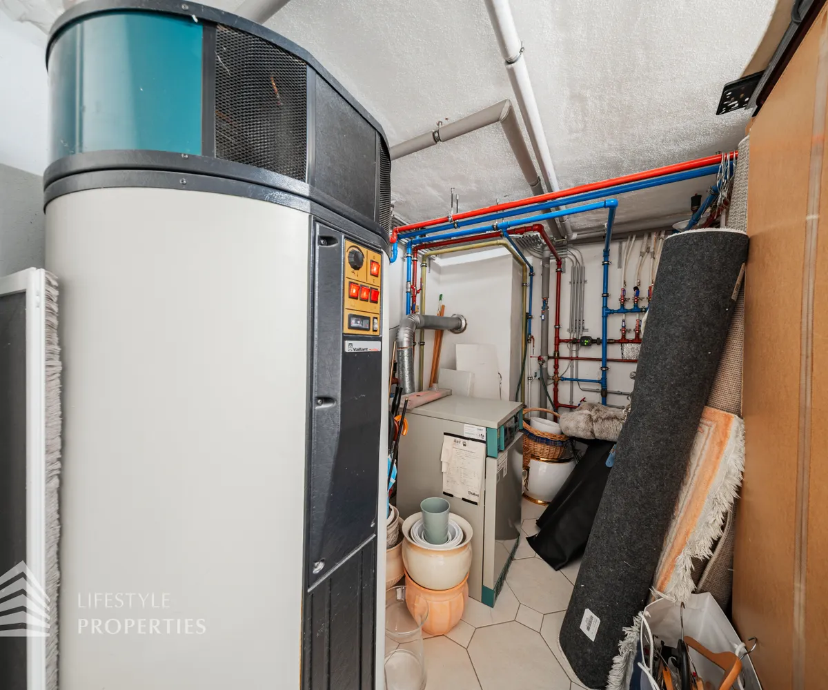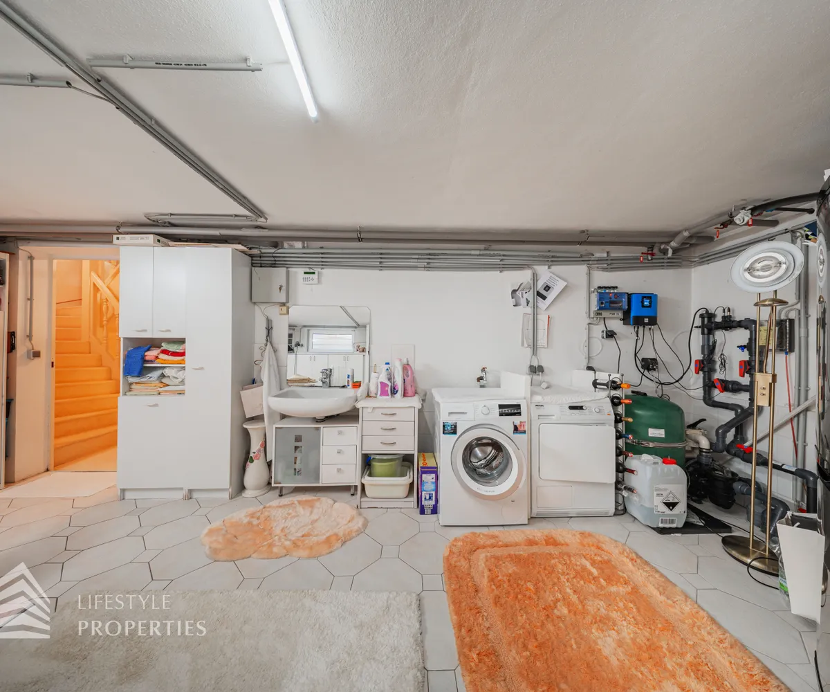 Des Weiteren verfügt die Villa über einen Wohnkeller, wo sich das Gästezimmer und der Wellnessbereich befindet. Ausgestattet mit einer finnischen Sauna und ein Kältebecken, einer Dusche, einen Waschbecken und einer separaten Toilette. Nebenan erreicht man den Wirtschaftsraum und Technikraum.