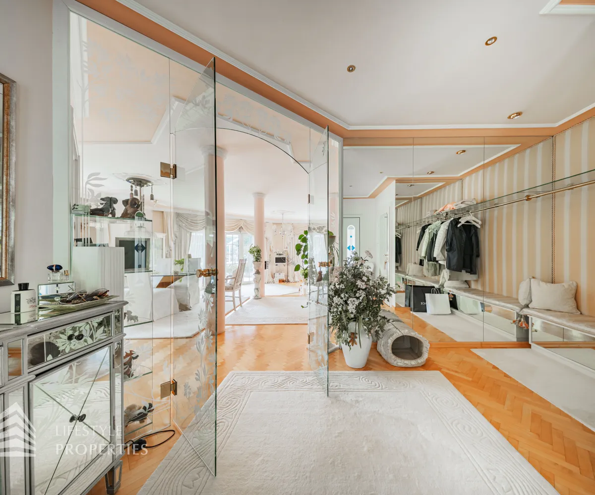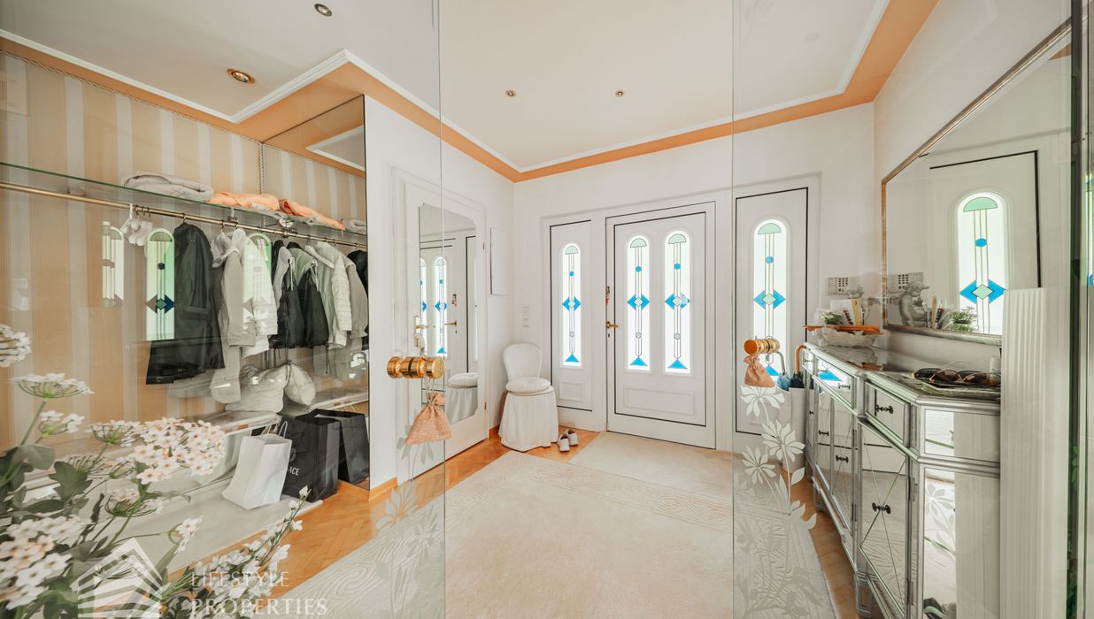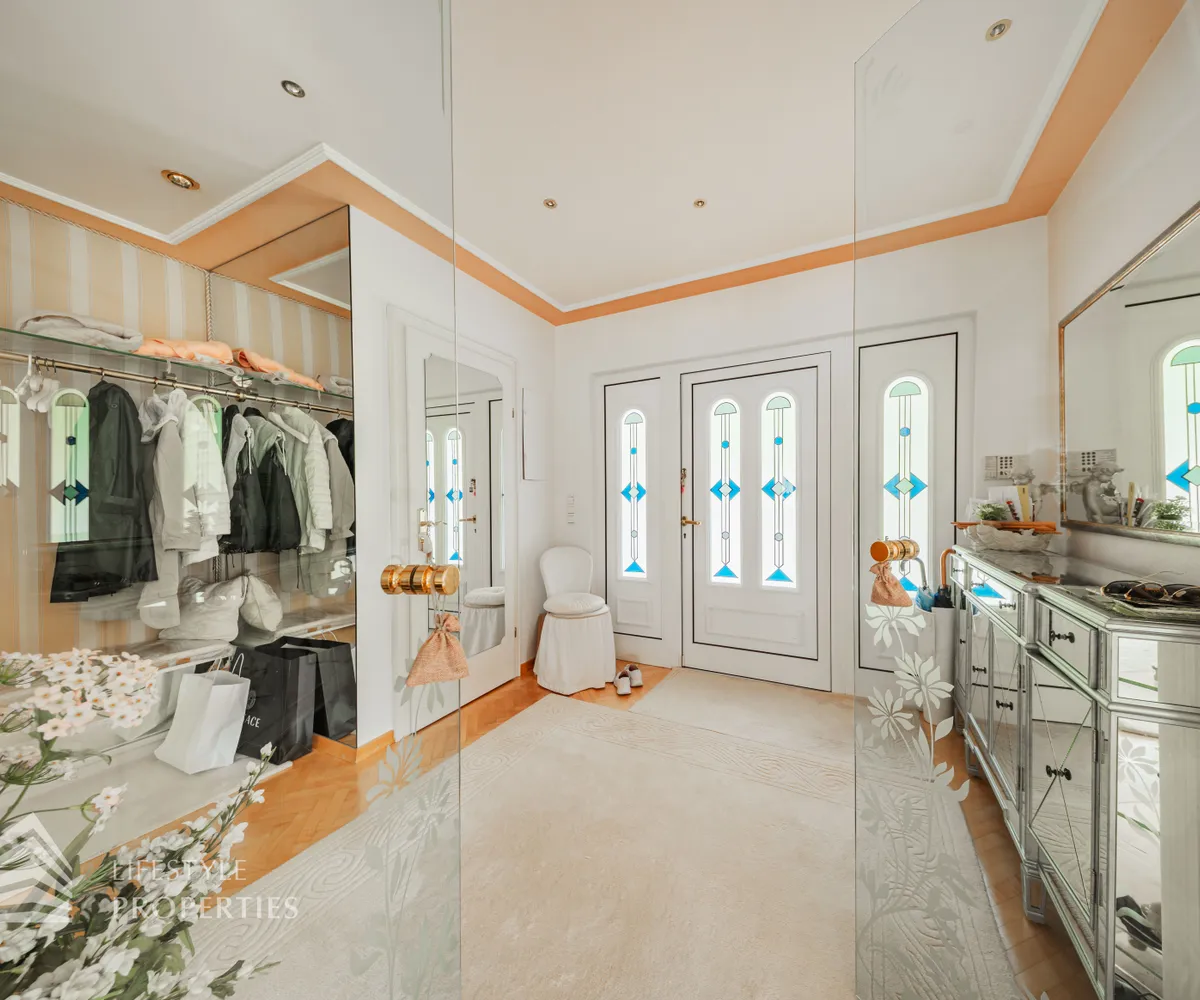 Beim Betreten der Villa befindet man sich direkt im Vorraum, diese mit einer großzügigen Garderobe und einen Windfang aus Glas ausgestattet ist. Rechts vom Eingang befindet sich die Toilette. Durch die Glastüre erreicht man den Essplatz und den exklusiven Wohnbereich mit seiner faszinierenden Ausstattung und den offenen Kamin, dieser durch zwei Stufen, mit edlen Säulen verbunden ist und durch die vielen Glasfronten und den Türen zur Terrasse mit viel Tageslicht durchflutet ist.