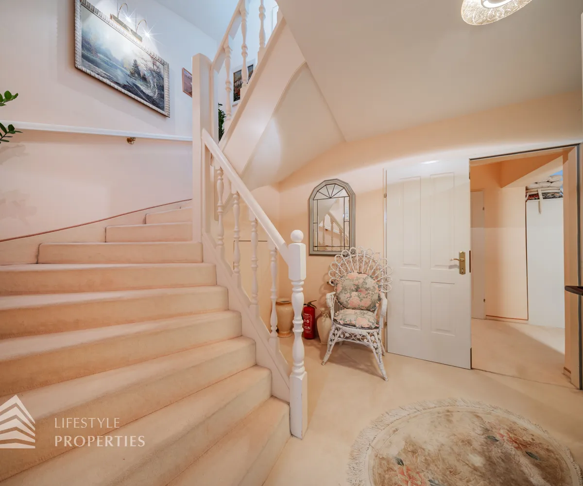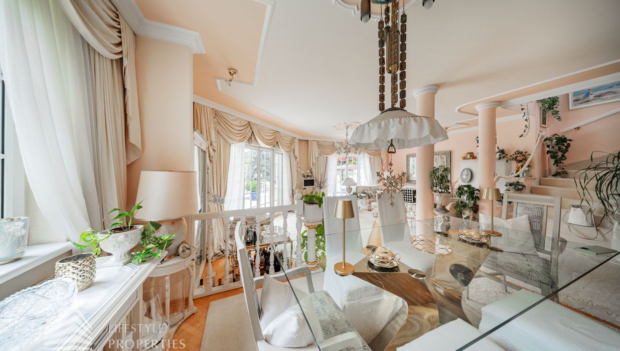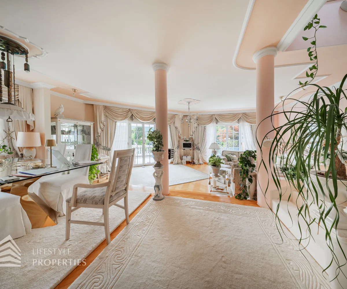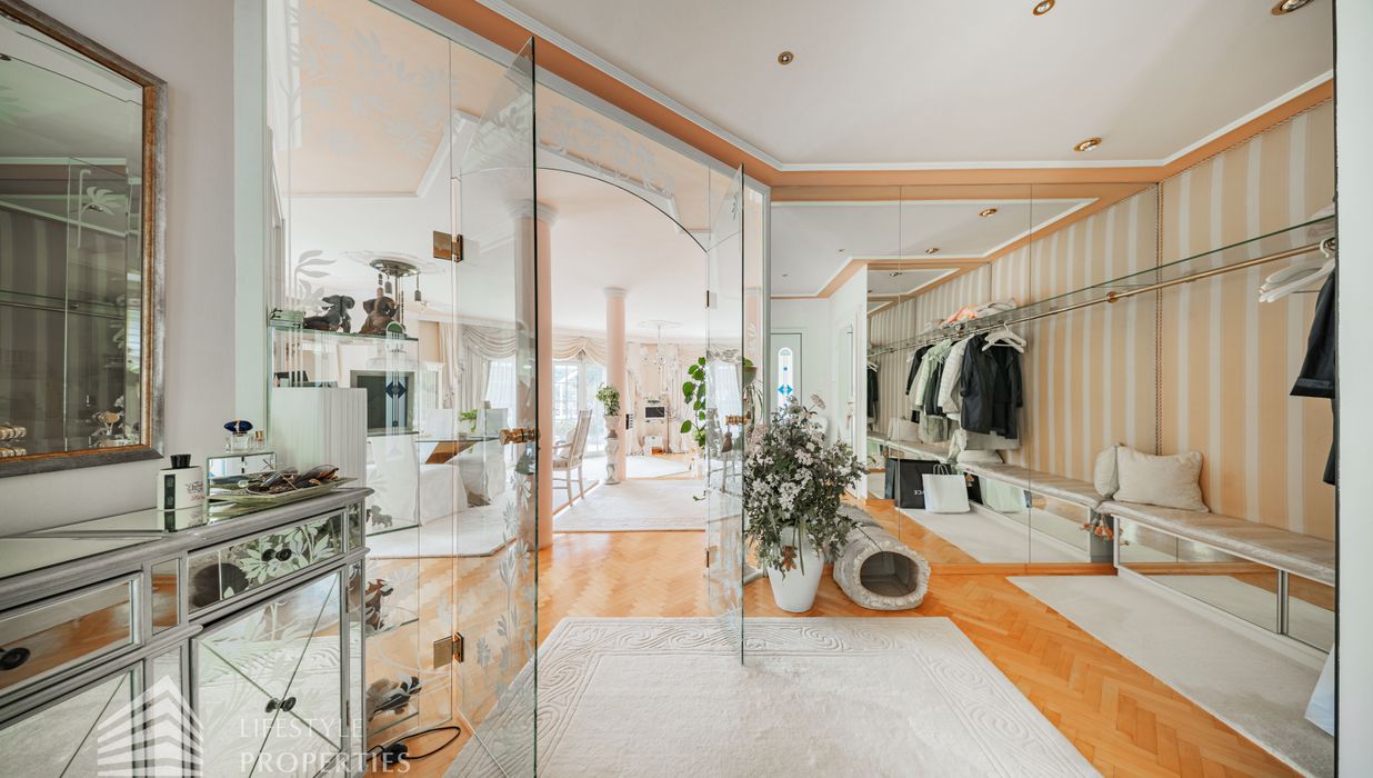 Beim Betreten der Villa befindet man sich direkt im Vorraum, diese mit einer großzügigen Garderobe und einen Windfang aus Glas ausgestattet ist. Rechts vom Eingang befindet sich die Toilette. Durch die Glastüre erreicht man den Essplatz und den exklusiven Wohnbereich mit seiner faszinierenden Ausstattung und den offenen Kamin, dieser durch zwei Stufen, mit edlen Säulen verbunden ist und durch die vielen Glasfronten und den Türen zur Terrasse mit viel Tageslicht durchflutet ist.