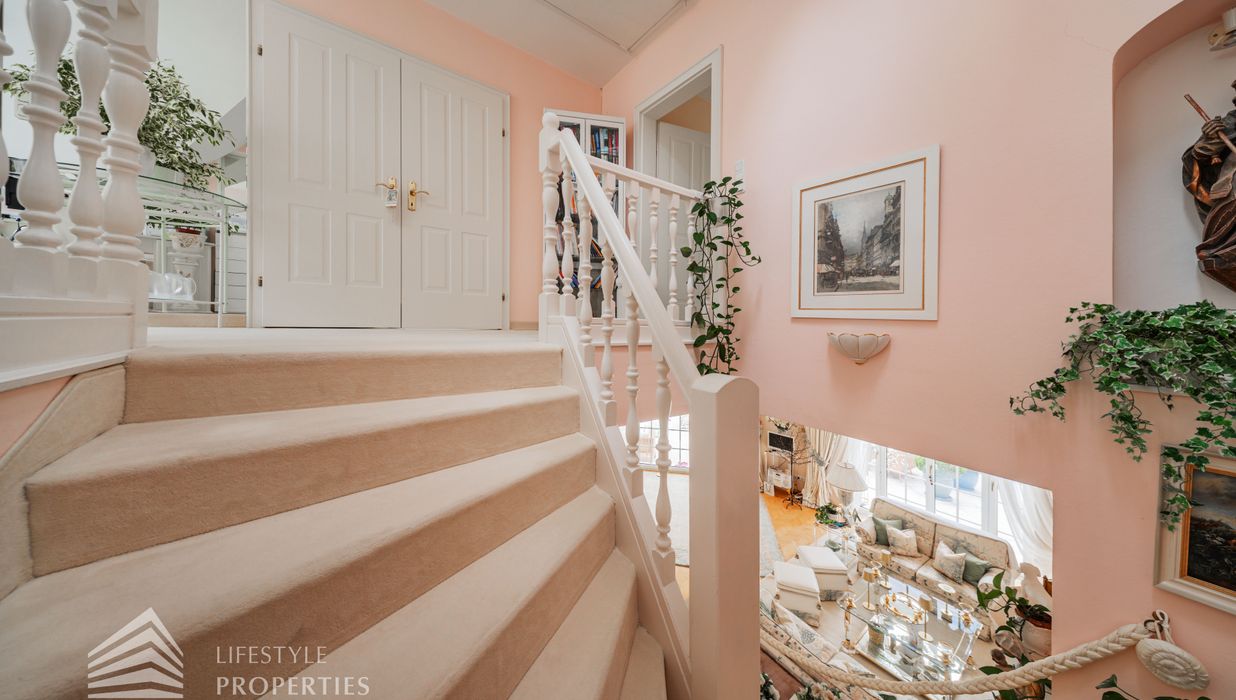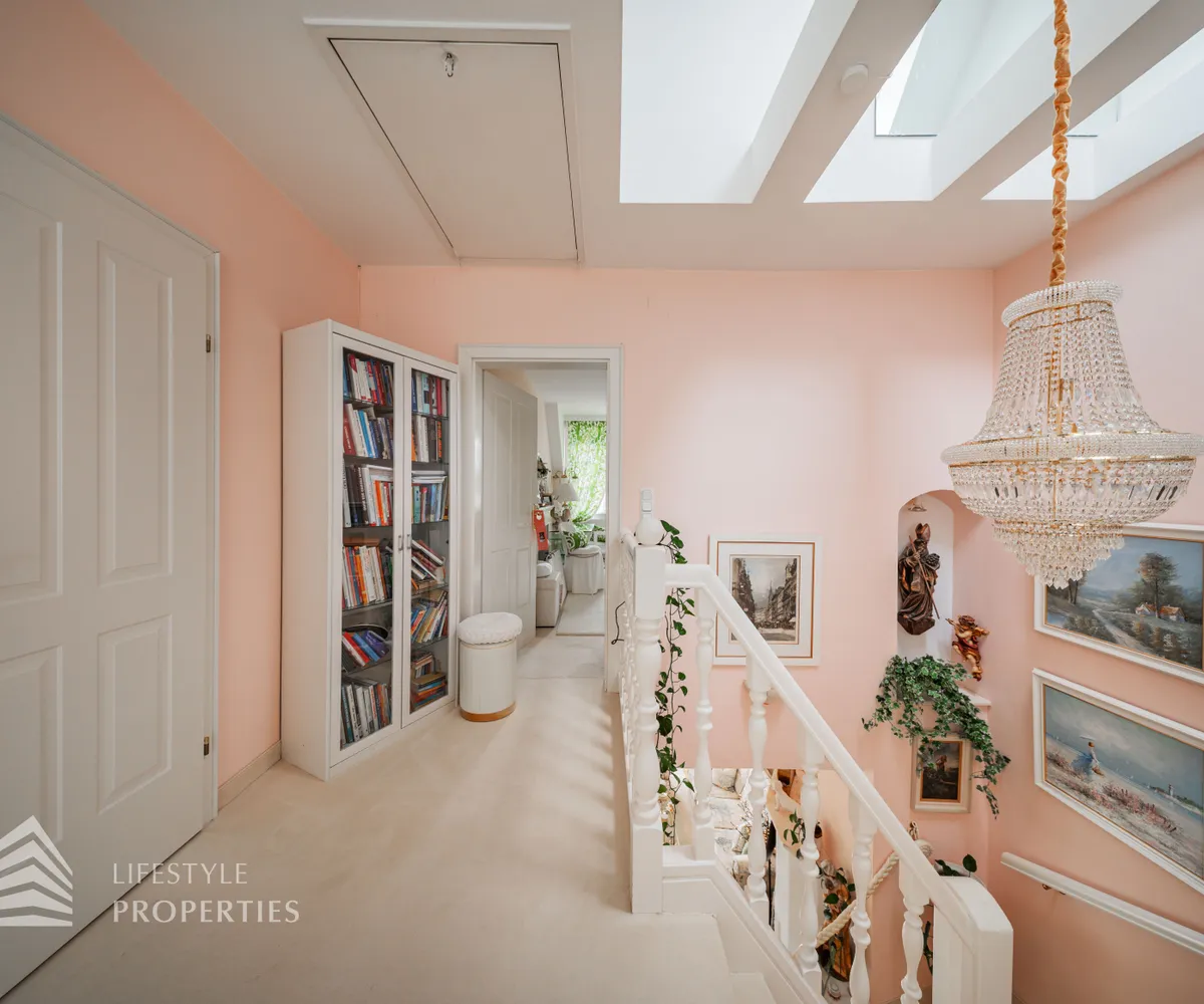 Über eine Holztreppe gelangt man in den oberen Bereich des Hauses, wo sich die offene Galerie befindet. Von dort erreicht man das elegante Badezimmer, dieses mit einer Badewanne, einen Waschtisch aus Marmor, einer Toilette und mit weißen Möbel vom Tischler ausgestattet ist. Rechts vom Badezimmer gelangt man in das großzügige Schlafzimmer, ausgestattet mit einen Balkon, wo man den herrlichen Garten beim Aufstehen betrachten kann. Neben dem Schlafzimmer befindet sich ein weiteres Zimmer, dieses sich als Arbeitszimmer oder Kinderzimmer eignet.