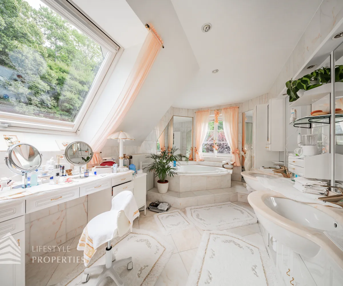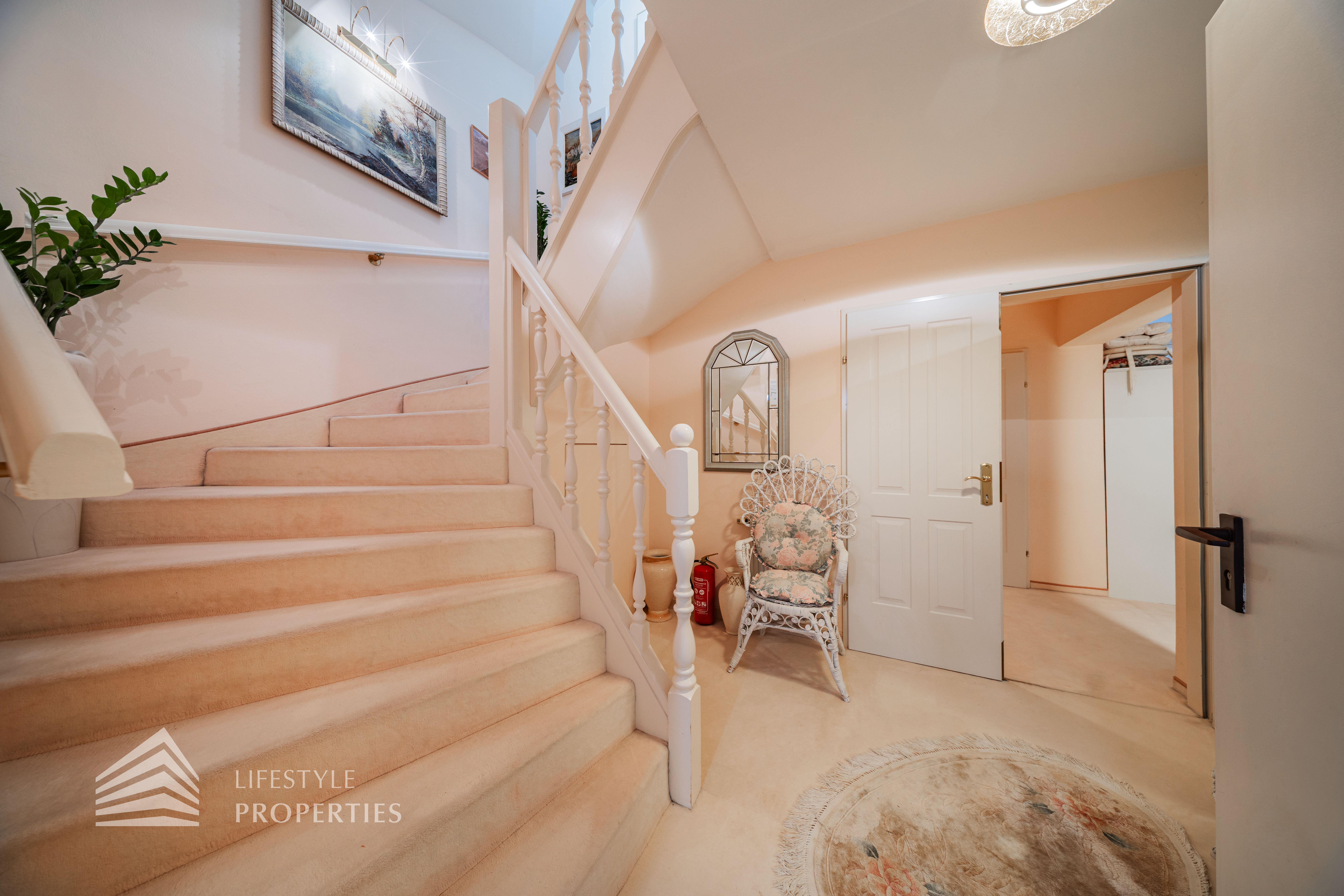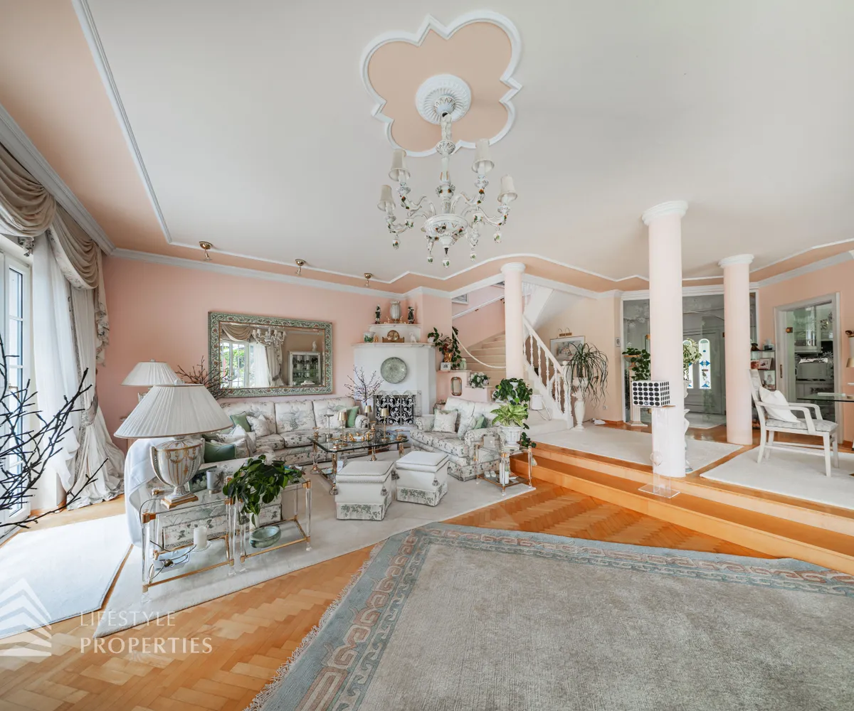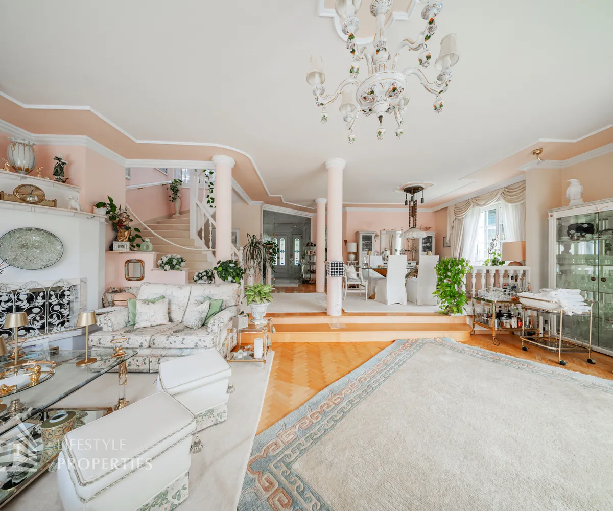 Die Villa hat eine Wohnfläche von ca. 304,20 m² und verfügt über zwei Eingänge, da das Objekt derzeit in zwei Wohneinheiten aufgeteilt ist.
