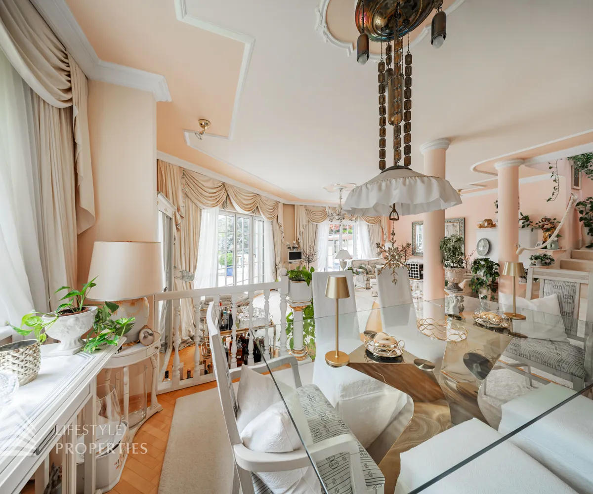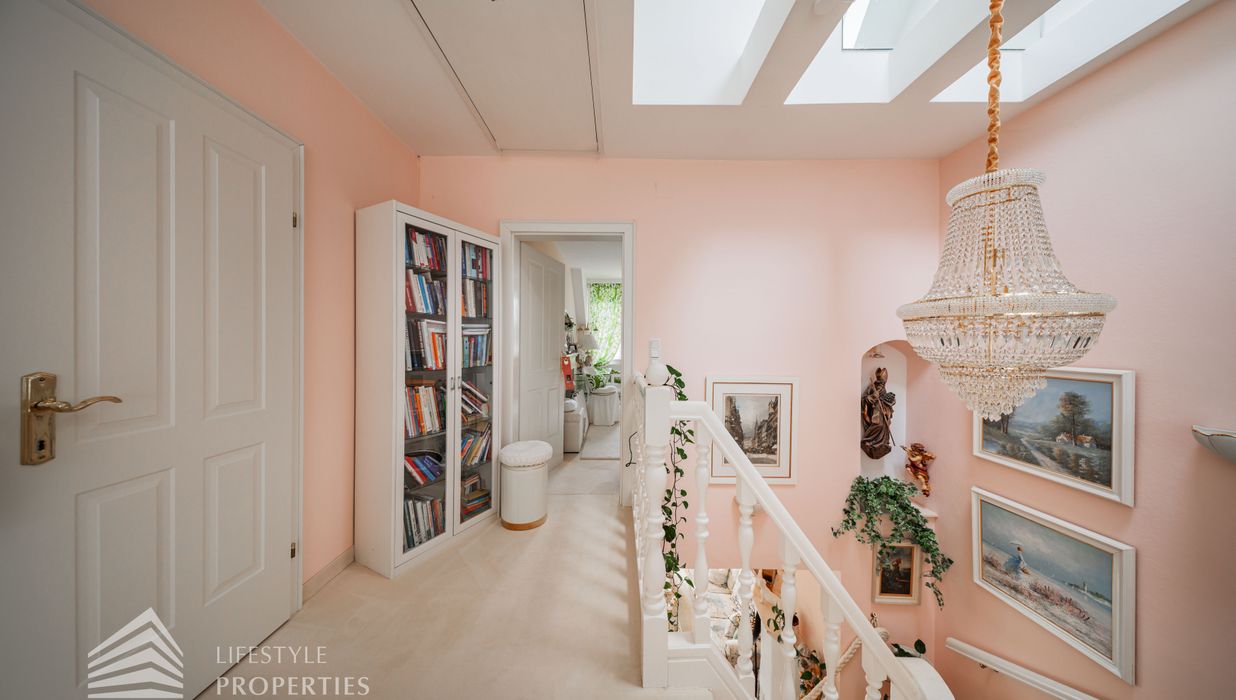 Links vom Esszimmer gelangt man in die vollausgestattete Küche, diese über viel Stauraum verfügt und mit einer schönen Essecke ausgestattet ist. Über eine Holztreppe gelangt man in den oberen Bereich des Hauses, wo sich die offene Galerie befindet. Von dort erreicht man das elegante Badezimmer, dieses mit einer Badewanne mit Massagedüsen, einen Waschtisch aus Marmor, einer Toilette und mit weißen Möbel vom Tischler ausgestattet ist. Rechts vom Badezimmer gelangt man in das klimatisierte Schlafzimmer, ausgestattet mit einen exklusiven Mobiliar und einen Balkon, wo man den herrlichen Garten beim Aufstehen betrachten kann. Neben dem Schlafzimmer befindet sich ein weiteres Zimmer, dieses sich als Arbeitszimmer oder Kinderzimmer eignet.