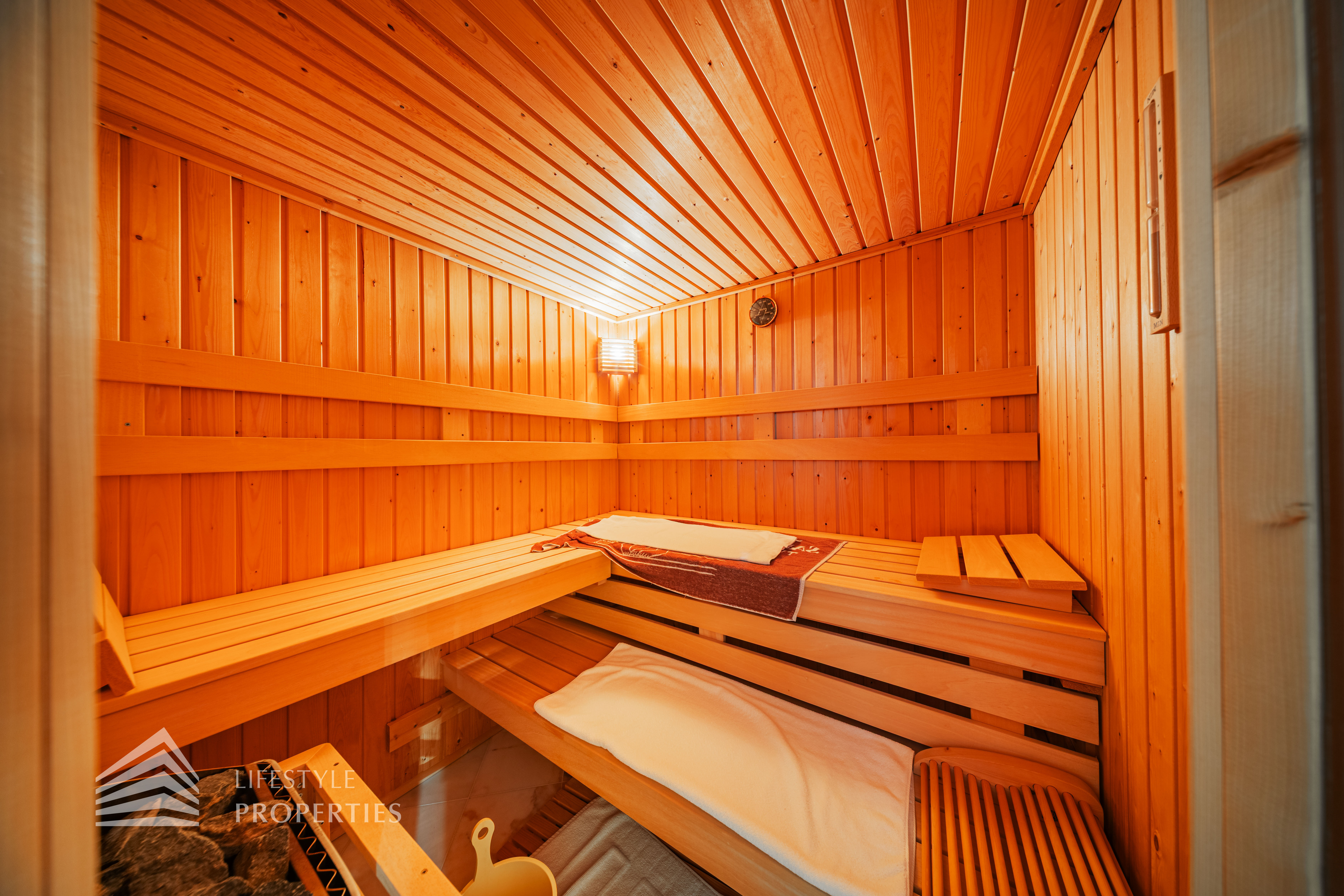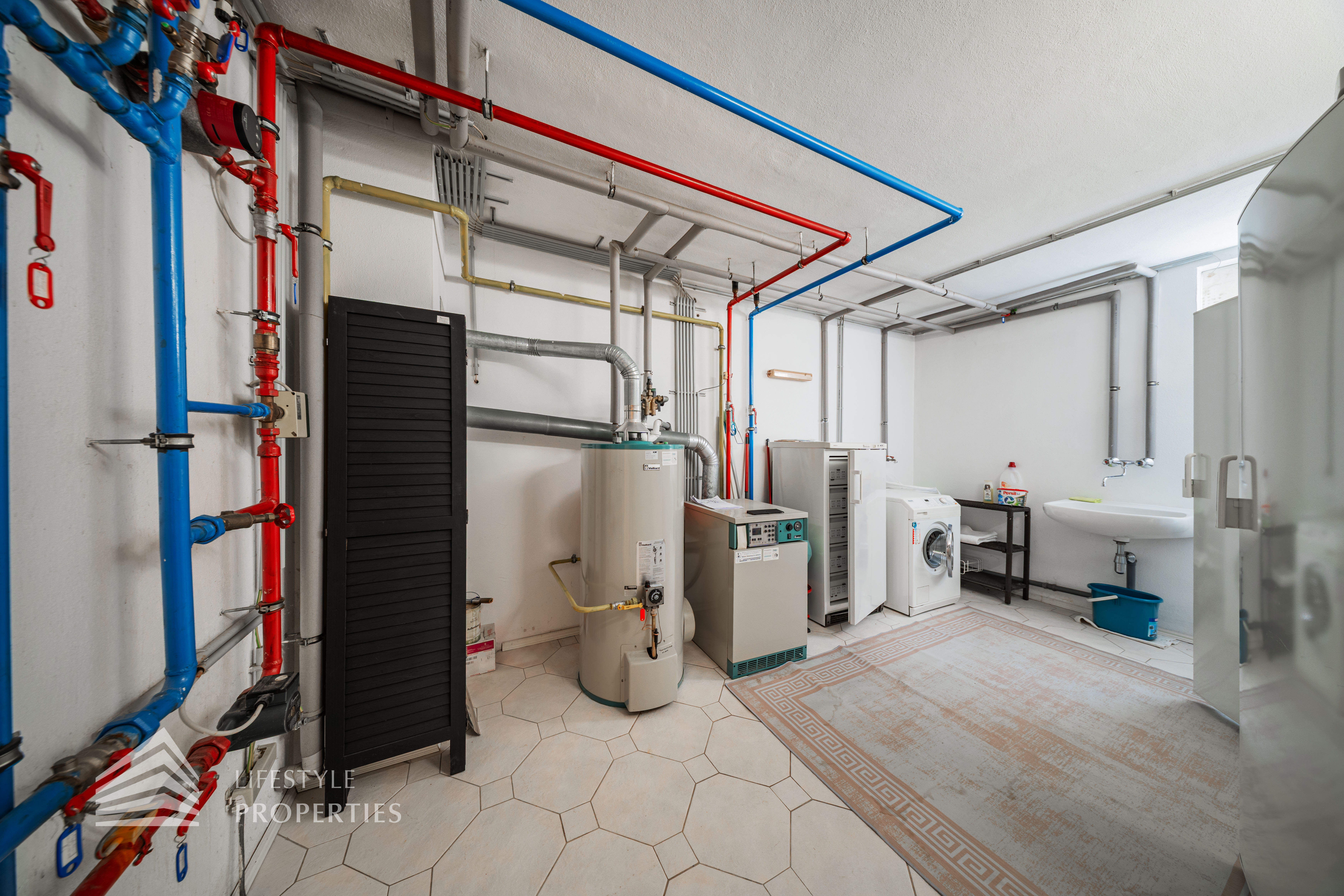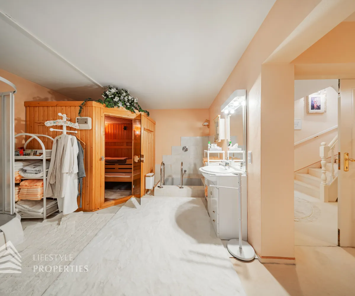 Des Weiteren verfügt die Villa über einen Wohnkeller, wo sich das Gästezimmer und der Wellnessbereich befindet. Ausgestattet mit einer finnischen Sauna und ein Kältebecken, einer Dusche, einen Waschbecken und einer separaten Toilette. Nebenan erreicht man den Wirtschaftsraum und Technikraum.