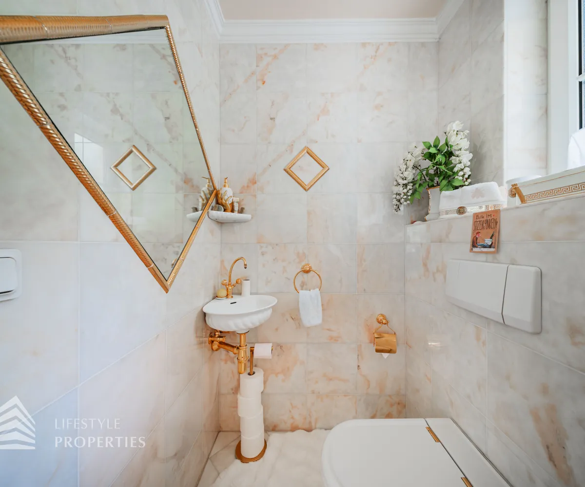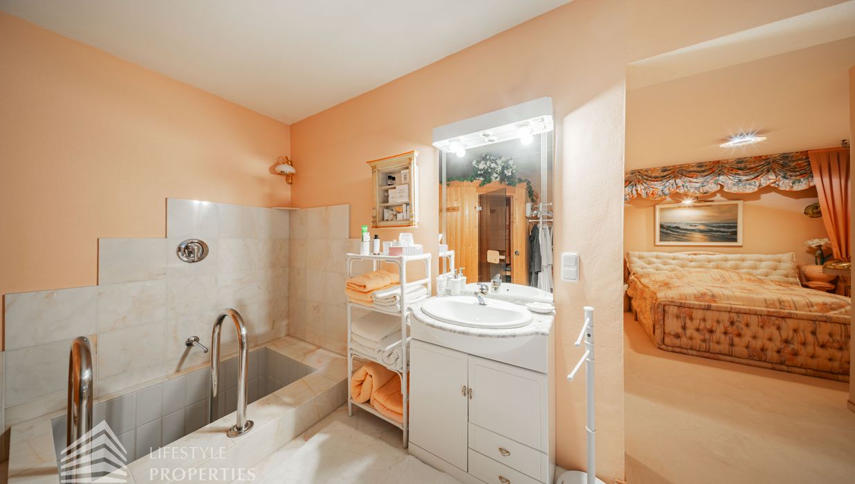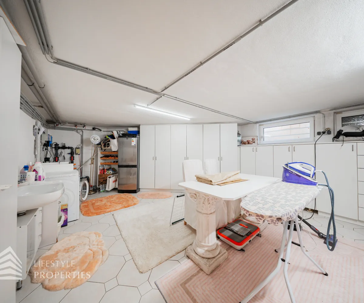 Des Weiteren verfügt die Villa über einen Wohnkeller, wo sich das Gästezimmer und der Wellnessbereich befindet. Ausgestattet mit einer finnischen Sauna und ein Kältebecken, einer Dusche, einen Waschbecken und einer separaten Toilette. Nebenan erreicht man den Wirtschaftsraum und Technikraum.