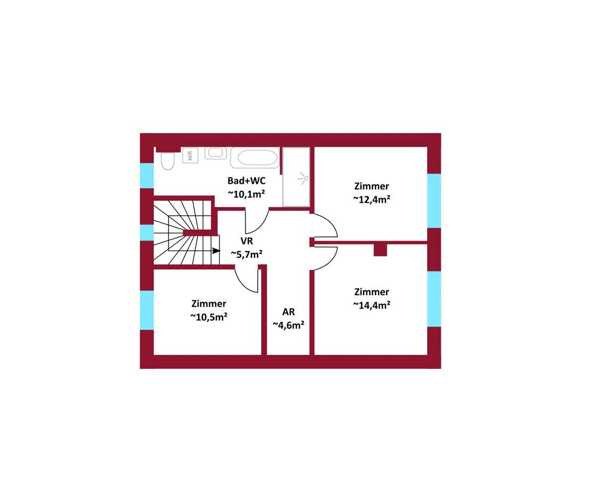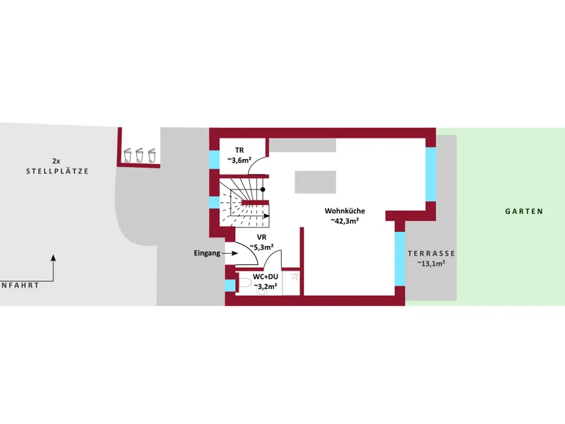 Mit einer Wohnfläche von ca. 112 m² , einer Terrasse von ca. 13 m² und einem Garten von ca. 100 m² teilt sich das Haus wie folgt auf: