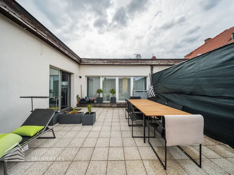 Im Obergeschoss stehen zwei Wohnungen mit jeweils eigenen Terrassen zur Verfügung: