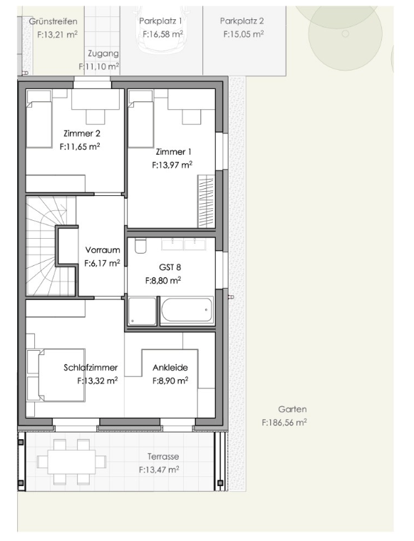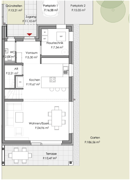Beim Betreten gelangt man über den Vorraum in den offenen, lichtdurchfluteten Wohnbereich. Der großzügige Wohn-/Essbereich mit angrenzender Küche bildet das Herzstück des täglichen Familienlebens und führt direkt auf die Terrasse mit anschließendem Garten – ein idealer Ort für Kinder, Hobbygärtner oder gemütliche Stunden im Freien. Ein Gäste-WC, ein Abstellraum und der Technikraum komplettieren das Erdgeschoss.