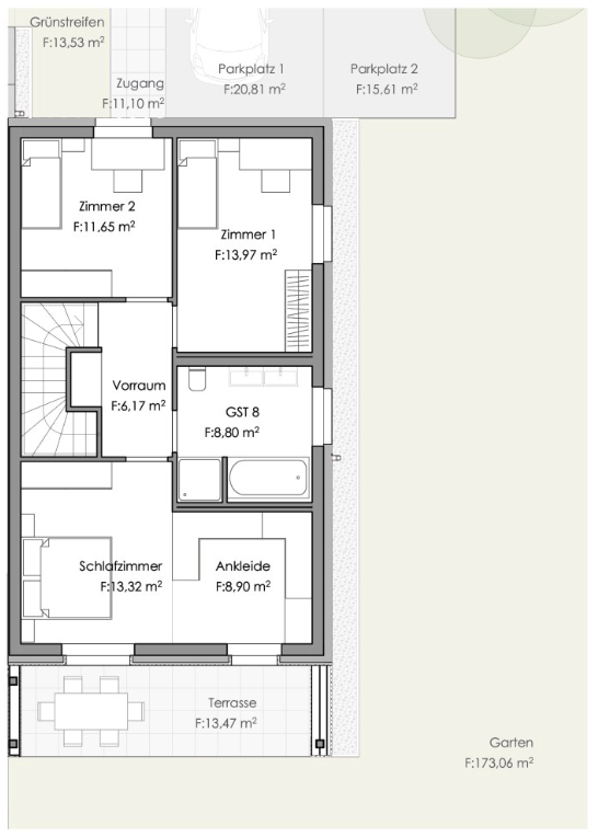 Der südlich orientierte Garten garantiert viele Sonnenstunden und bietet dank der leicht versetzten Bauweise auch auf der eigenen Terrasse viel Privatsphäre. Zwei Autoabstellplätze direkt vor dem Haus runden das Angebot ab.