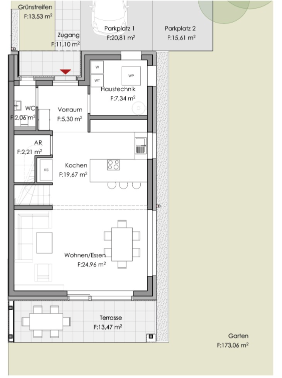 Haus 1 DHH: ca. 124,35 m² WNFl | Grundstück ca. 377,76 m² | Kaufpreis belagsfertig: € 467.000