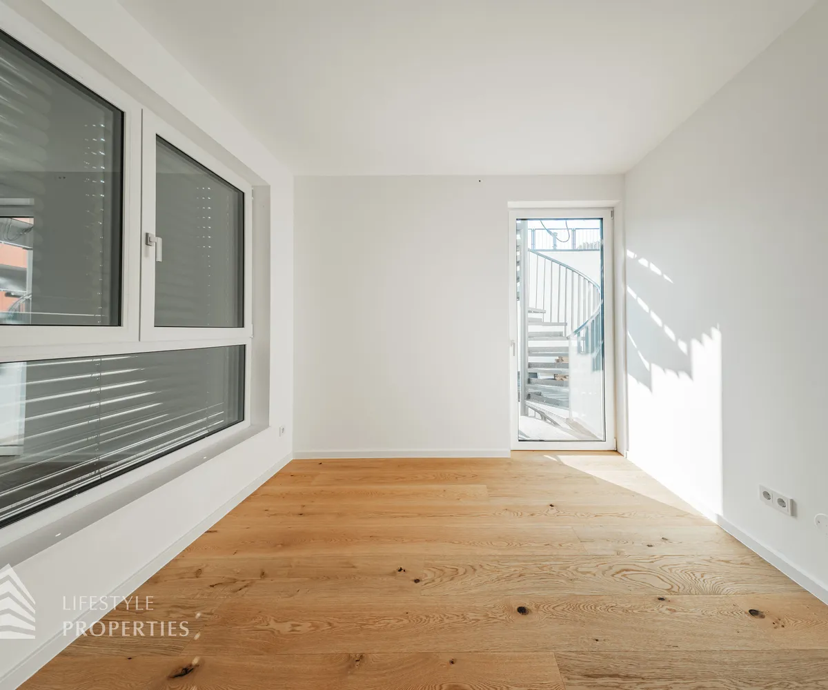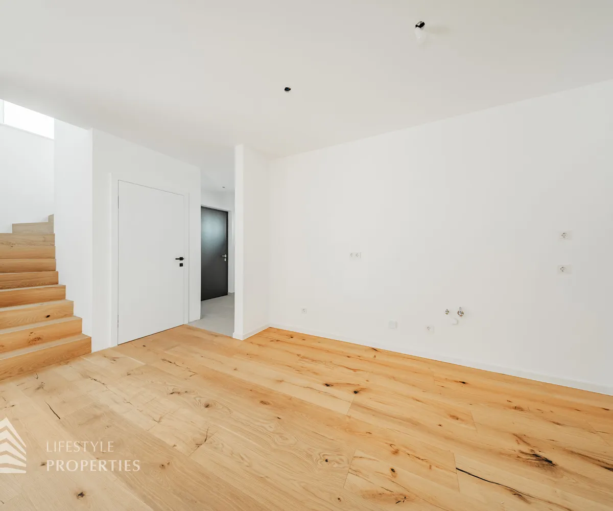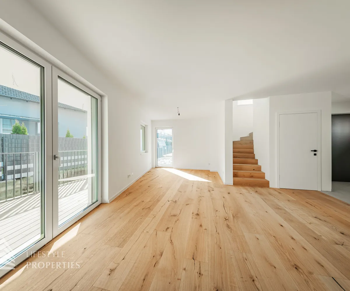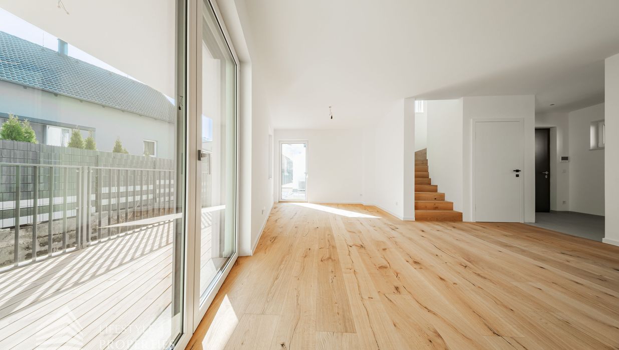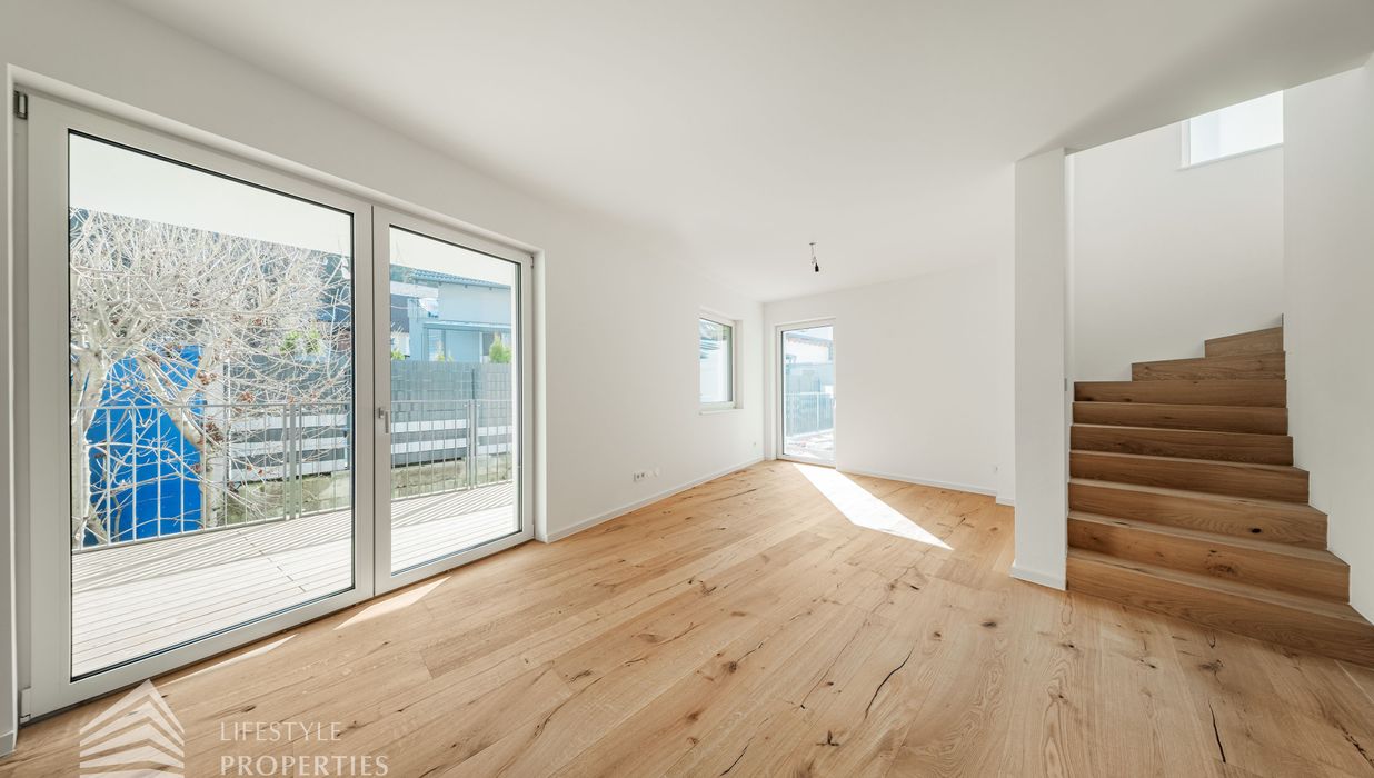 Beim Betreten des Hauses gelangen Sie zunächst in den einladenden Vorraum, der den perfekten Empfang für Bewohner und Gäste bietet. Direkt angrenzend öffnet sich der großzügige ca. 31 m² große Wohn- und Essbereich mit offener Küche, der durch seine offene Gestaltung sowohl für gesellige Abende als auch für gemütliche Familienmomente ideal ist. Ein separates WC sorgt für zusätzlichen Komfort, während der Abstellraum mit Waschmaschinenanschluss praktische Funktionalität bietet. Über die Terrasse im Erdgeschoss, die ca. 12 m² misst, gelangen Sie direkt in den Garten mit ca. 20 m², der zu entspannten Stunden im Freien, zum Spielen oder zu gemütlichen Abenden einlädt. Von hier aus gelangen Sie auf die private Dachterrasse mit ca. 34 m² , welche einen ungestörten Blick ins Grüne bietet – ein perfekter Ort für Entspannung, Sonnenbäder oder laue Sommerabende.