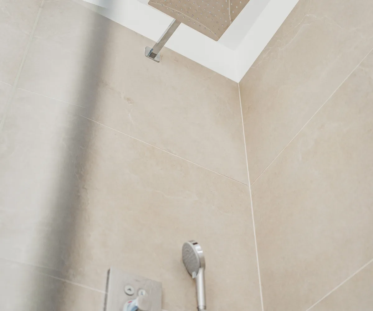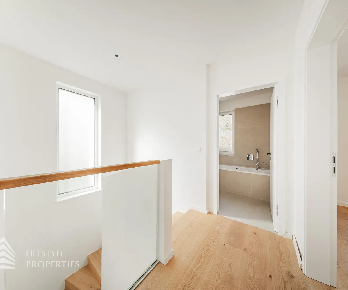 Im Obergeschoss erwarten Sie drei geräumige und lichtdurchflutete Schlafzimmer mit ca. 11 m² bis 13 m². Eines der Schlafzimmer verfügt über einen eigenen ca. 5 m² großen Schrankraum. Das elegante Badezimmer ist mit Badewanne, bodengleicher Dusche und Doppelwaschbecken ausgestattet, ein separates WC ergänzt den Komfort.