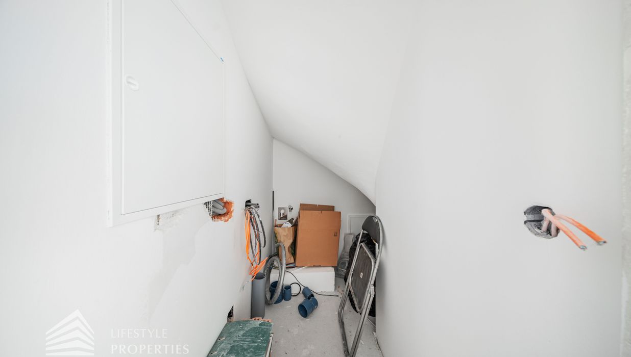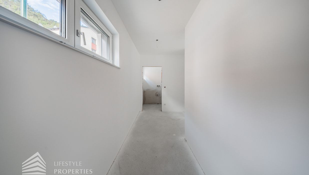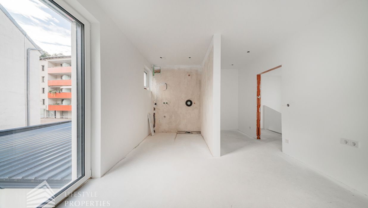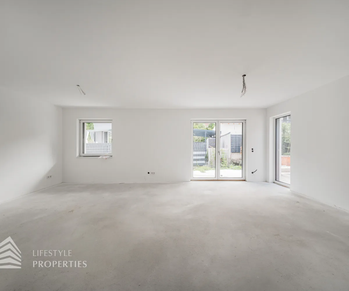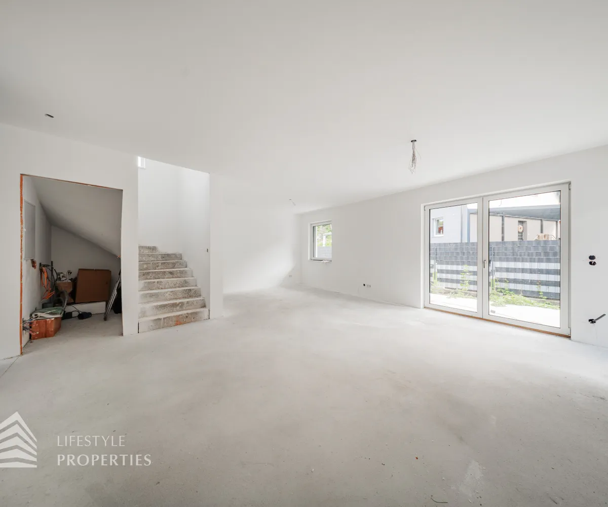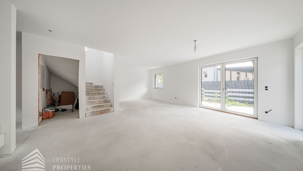 Beim Betreten des Hauses gelangen Sie zunächst in den einladenden Vorraum, der den perfekten Empfang für Bewohner und Gäste bietet. Direkt angrenzend öffnet sich der großzügige ca. 37 m² große Wohn- und Essbereich mit offener Küche, der durch seine offene Gestaltung sowohl für gesellige Abende als auch für gemütliche Familienmomente ideal ist. Ein separates WC sorgt für zusätzlichen Komfort, während der Abstellraum mit Waschmaschinenanschluss sowie das Küchenkammerl praktische Funktionalität bieten. Über die Terrasse im Erdgeschoss, die ca. 9 m² misst, gelangen Sie direkt in den Garten mit ca. 23 m², der zu entspannten Stunden im Freien, zum Spielen oder zu gemütlichen Abenden einlädt. Von hier aus gelangen Sie auf die private Dachterrasse mit ca. 40 m² , welche einen ungestörten Blick ins Grüne bietet – ein perfekter Ort für Entspannung, Sonnenbäder oder laue Sommerabende.