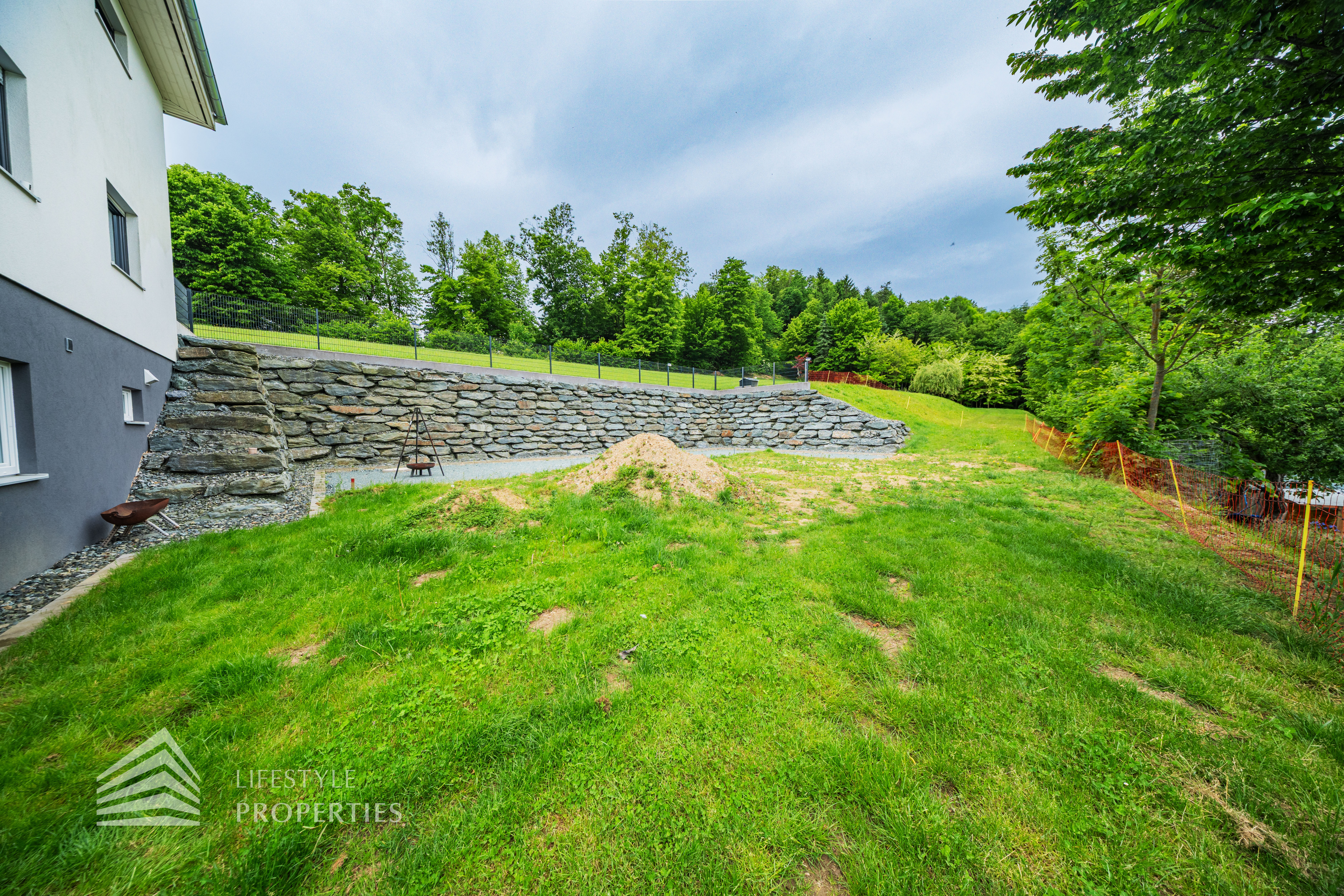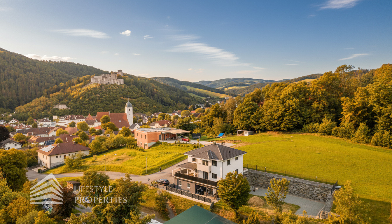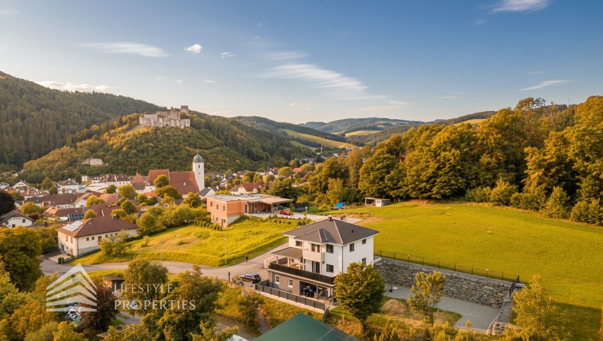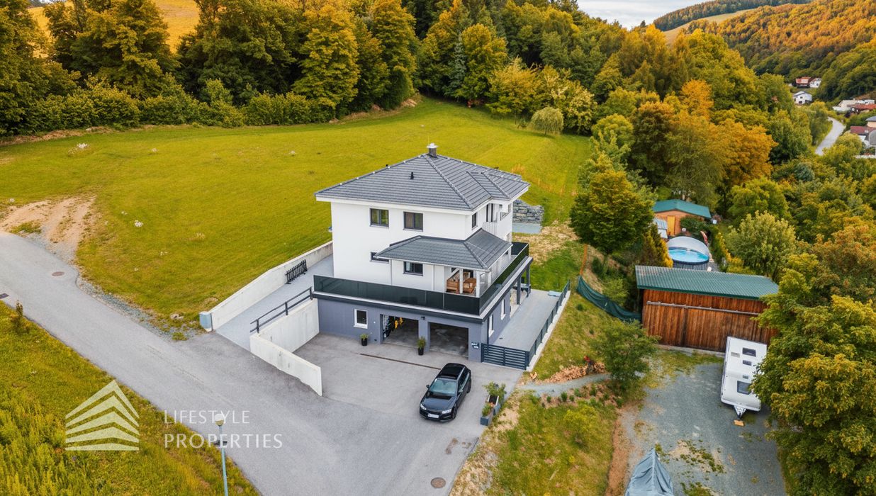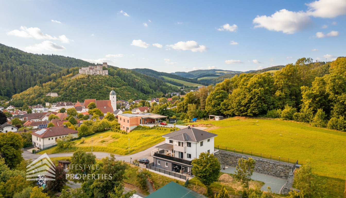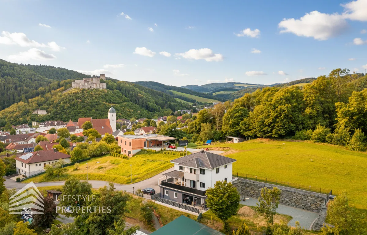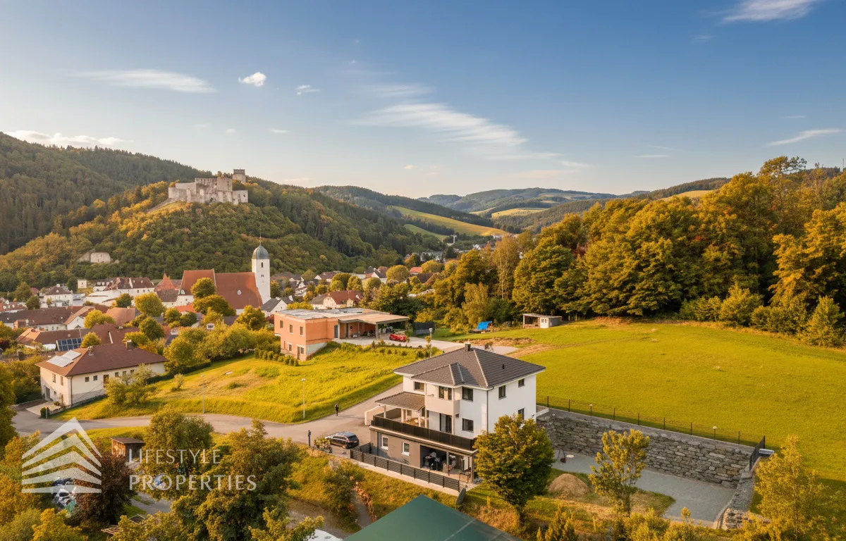 Wohnen, wo andere Urlaub machen! Dieses großzügige, moderne Einfamilienhaus in Holzriegelbauweise wurde 2014 errichtet und liegt in absoluter Ruhelage direkt am Waldrand – mit herrlichem Blick auf die Burgruine Kirchschlag und freiem Ausblick ohne direkte Nachbarn. Die ca. 260 m² grosse Nutzfläche ist auf drei Ebenen unterteilt (KG, EG, OG). Im ganzen Haus ist eine Zentrale Staubsaugeranlage und ein Glasfaseranschluss für ultraschnelles Internet verbaut. Das traumhafte Haus wurde als Niedrigenergiehaus in Holzriegelbauweise erbaut. Es überzeugt mit moderner Wohnraumlüftung zur Kühlung im Sommer. Beheizt wird mittels Erdwärme. Zum Objekt gehört ein verpflichtend zu übernehmendes Inventar im Wert von 40.000 EUR (nicht im Kaufpreis enthalten). Dieses umfasst unter anderem eine hochwertige Kücheneinrichtung, Badezimmermöbel im Obergeschoss und im Keller, einen Esstisch mit Stühlen, eine Garderobe mit Spiegelkasten, einen hochwertig verbauten Waschraum sowie eine praktische Werkzeugbank.