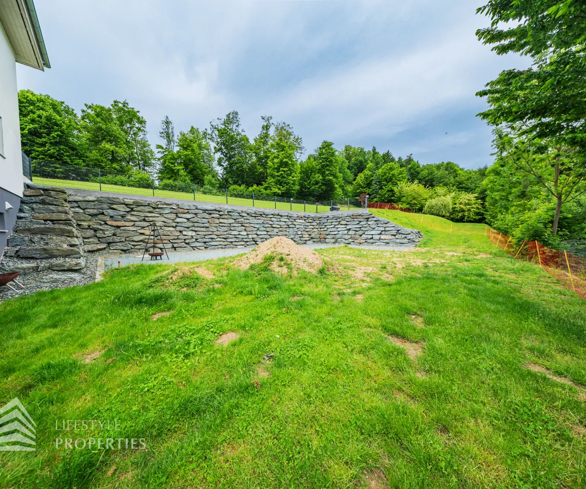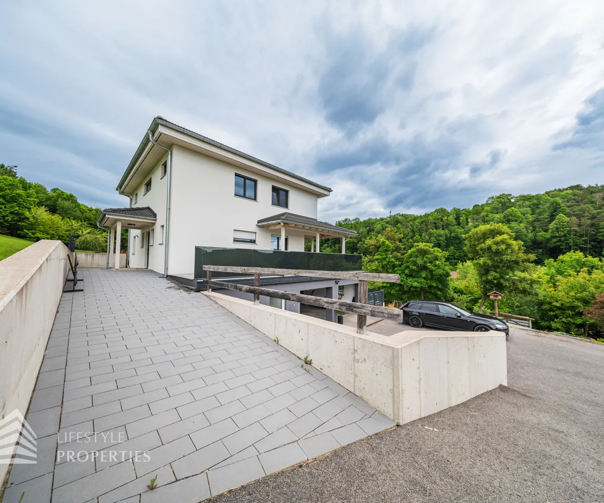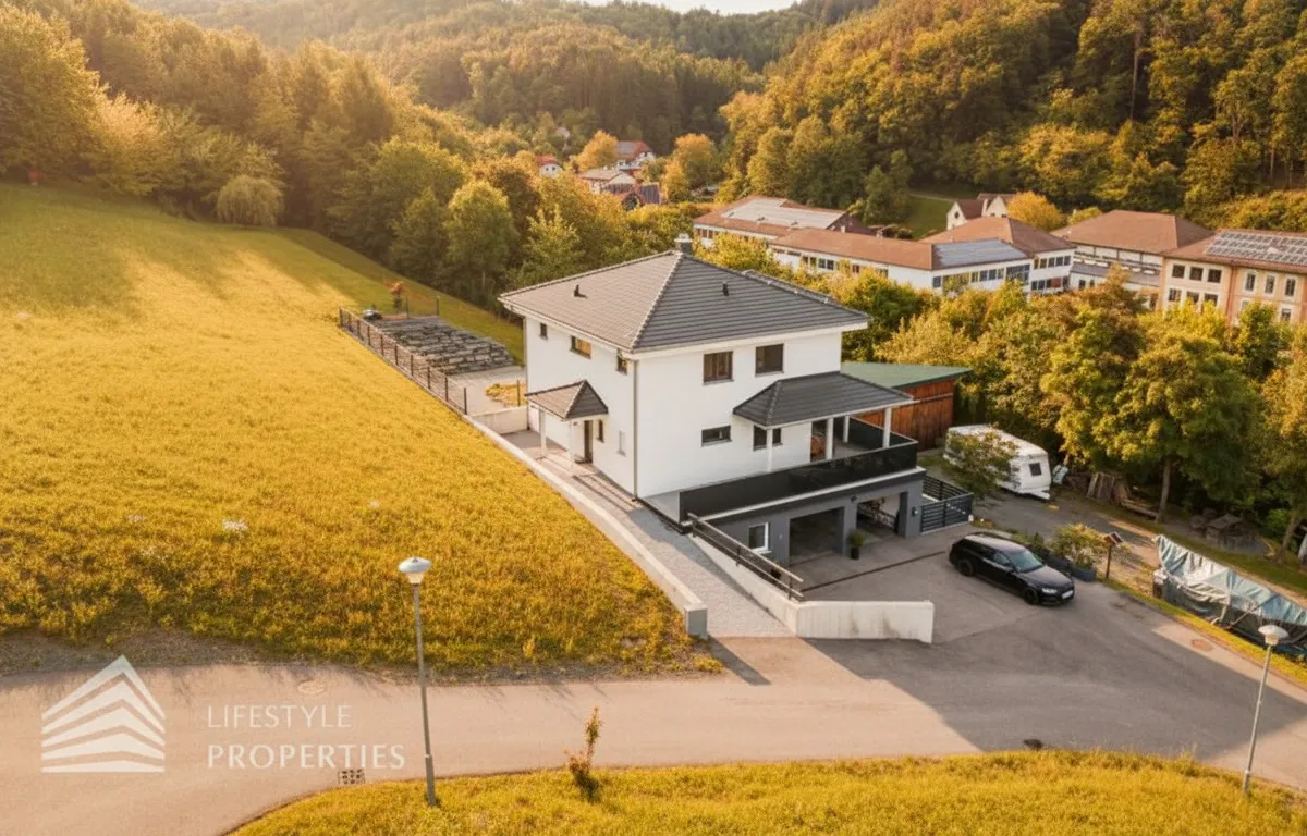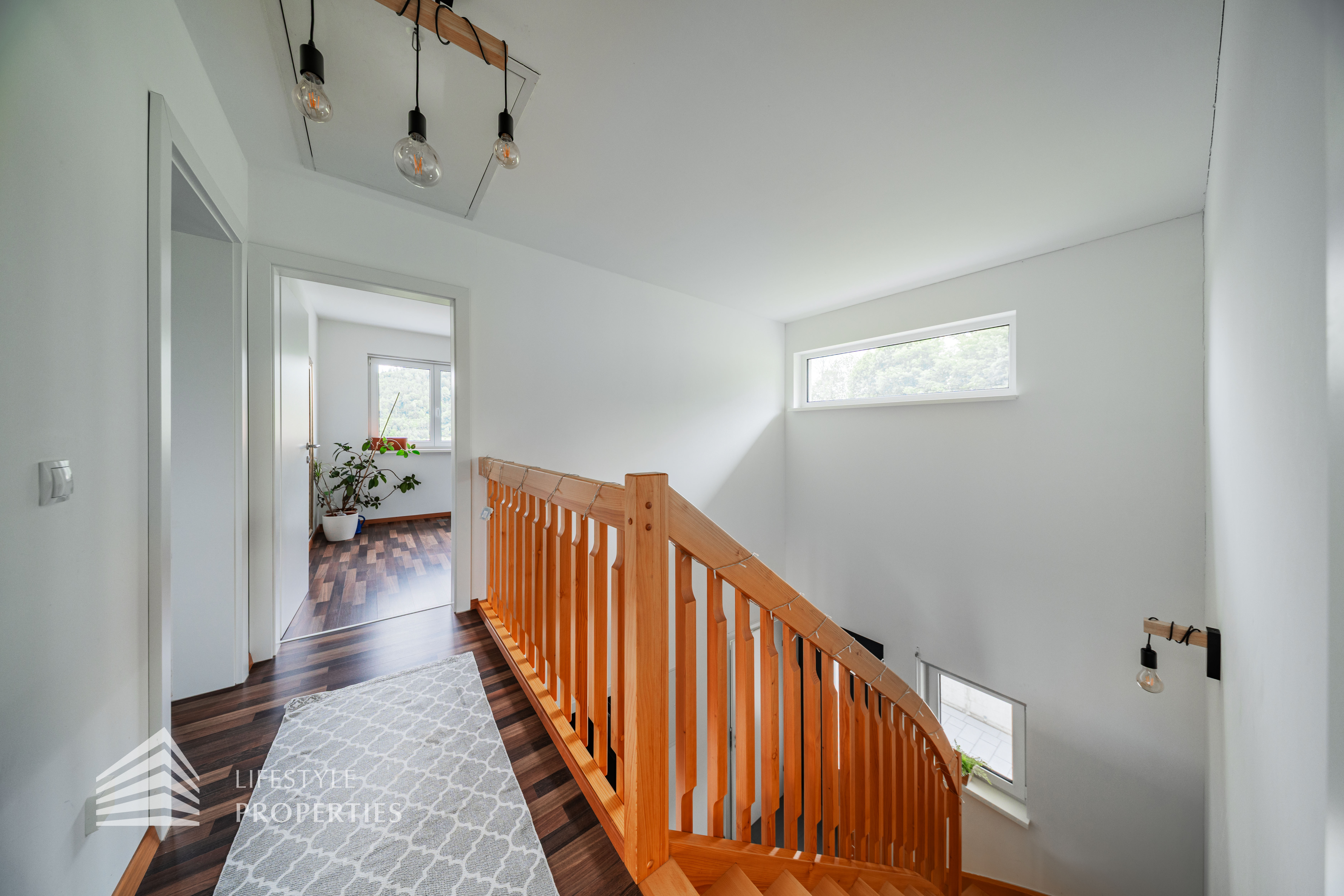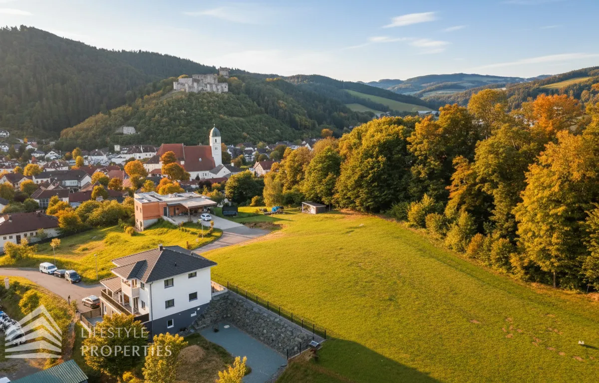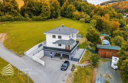 Wohnen, wo andere Urlaub machen! Dieses großzügige, moderne Einfamilienhaus in Holzriegelbauweise wurde 2014 errichtet und liegt in absoluter Ruhelage direkt am Waldrand – mit herrlichem Blick auf die Burgruine Kirchschlag und freiem Ausblick ohne direkte Nachbarn. Die ca. 260 m² grosse Nutzfläche ist auf drei Ebenen unterteilt (KG, EG, OG). Im ganzen Haus ist eine Zentrale Staubsaugeranlage und ein Glasfaseranschluss für ultraschnelles Internet verbaut. Das traumhafte Haus wurde als Niedrigenergiehaus in Holzriegelbauweise erbaut. Es überzeugt mit moderner Wohnraumlüftung zur Kühlung im Sommer. Beheizt wird mittels Erdwärme. Zum Objekt gehört ein verpflichtend zu übernehmendes Inventar im Wert von 40.000 EUR (nicht im Kaufpreis enthalten). Dieses umfasst unter anderem eine hochwertige Kücheneinrichtung, Badezimmermöbel im Obergeschoss und im Keller, einen Esstisch mit Stühlen, eine Garderobe mit Spiegelkasten, einen hochwertig verbauten Waschraum sowie eine praktische Werkzeugbank.