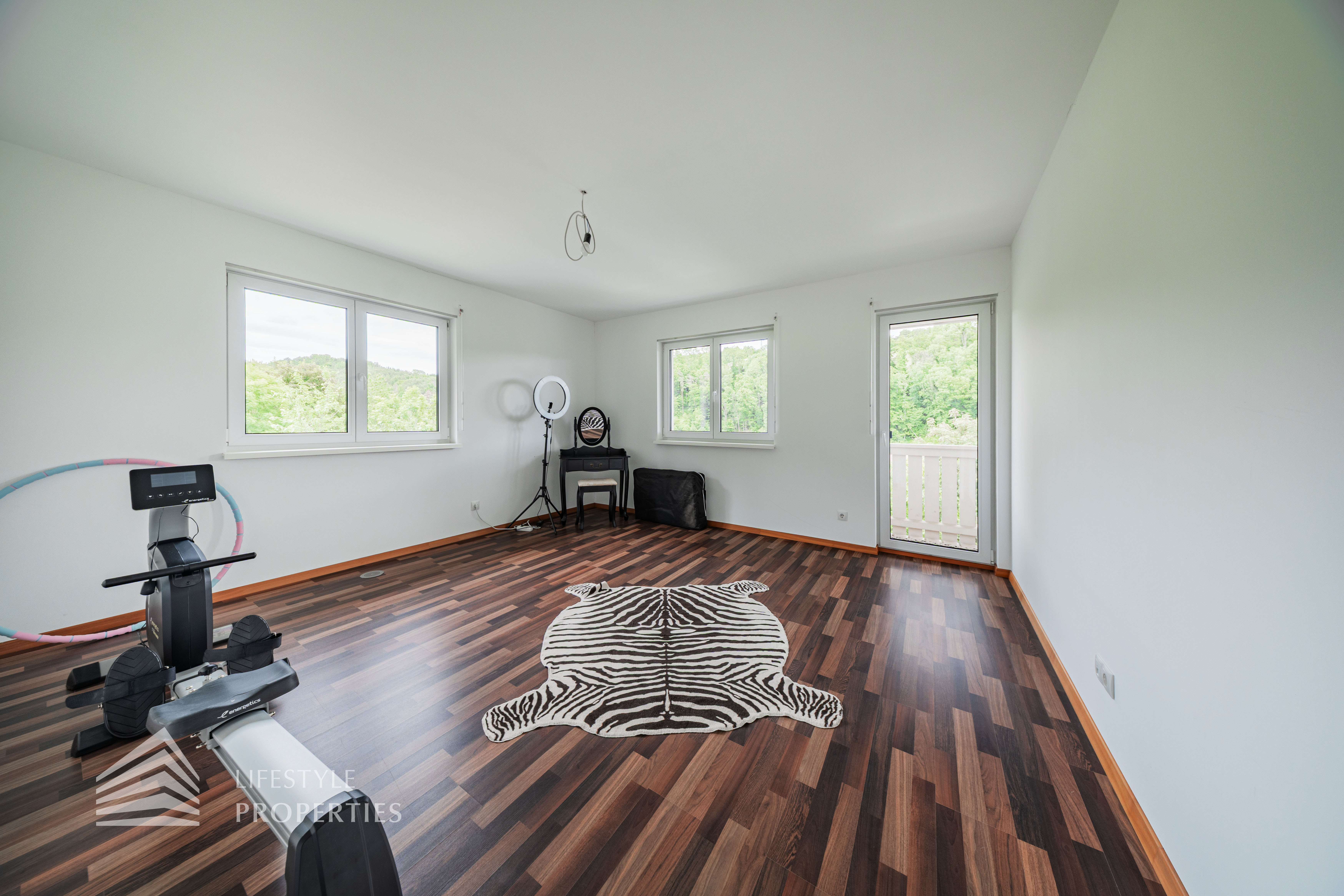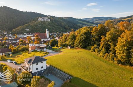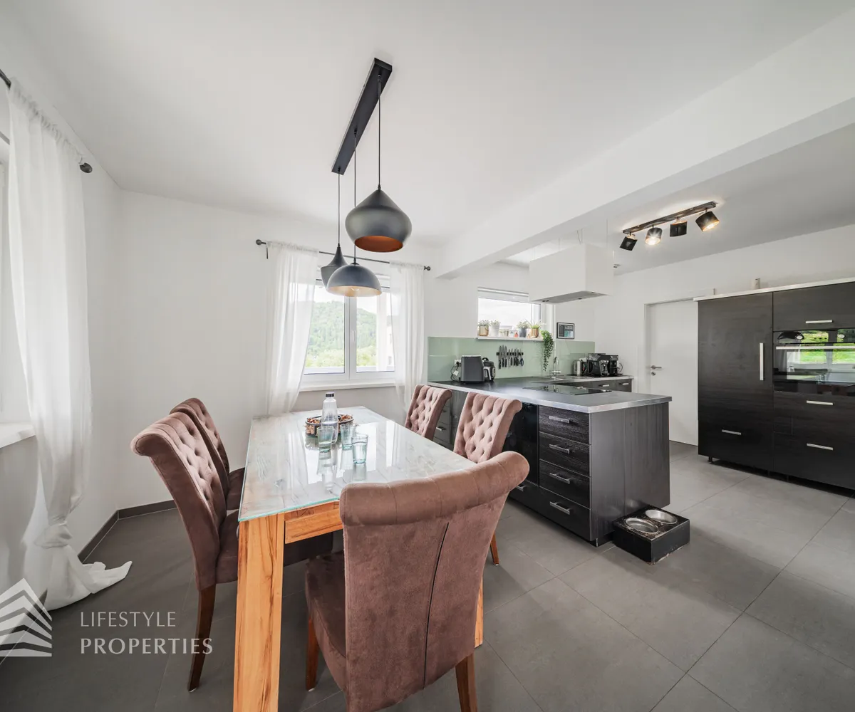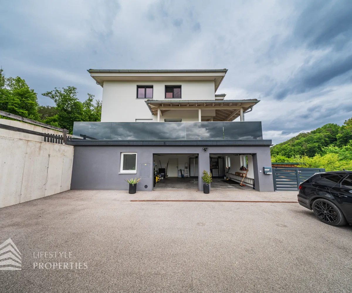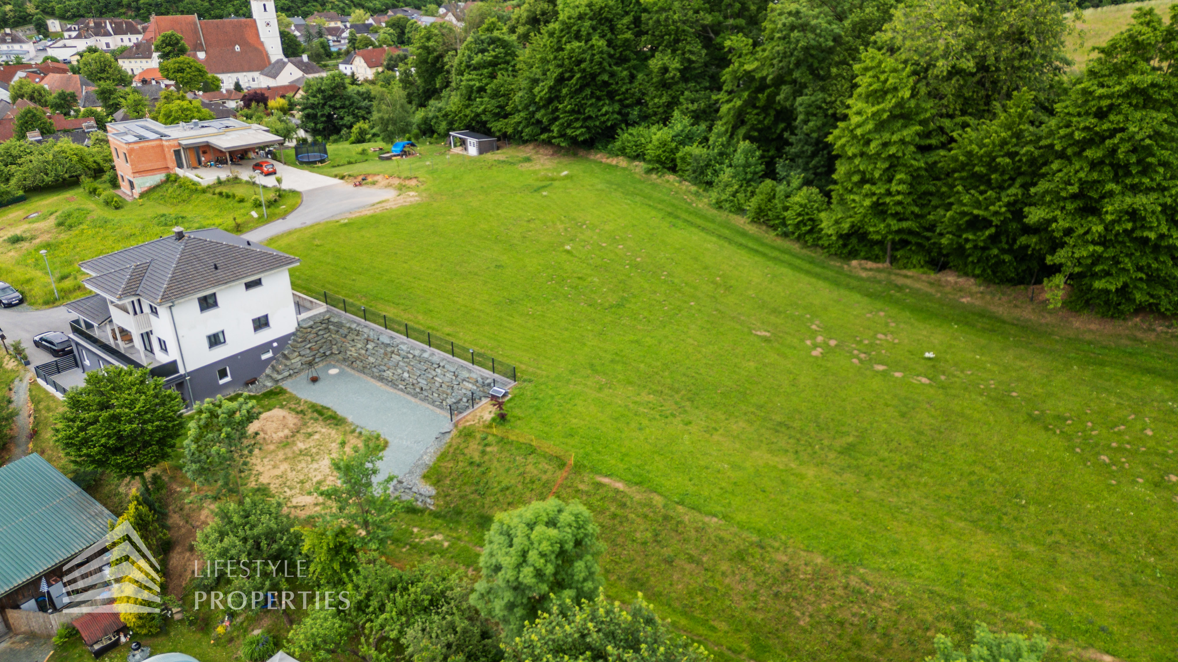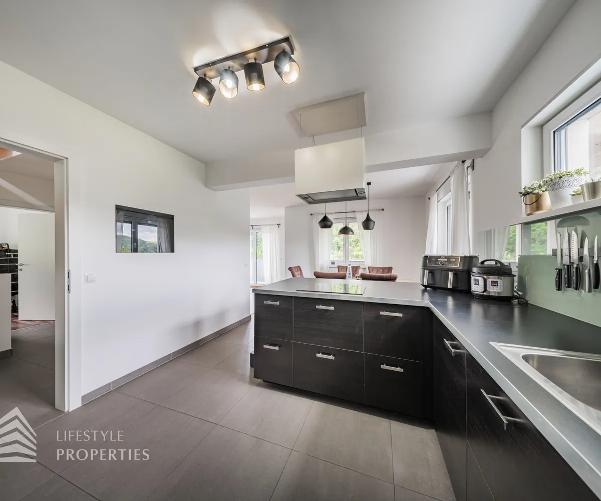 Wohnen, wo andere Urlaub machen! Dieses großzügige, moderne Einfamilienhaus in Holzriegelbauweise wurde 2014 errichtet und liegt in absoluter Ruhelage direkt am Waldrand – mit herrlichem Blick auf die Burgruine Kirchschlag und freiem Ausblick ohne direkte Nachbarn. Die ca. 260 m² grosse Nutzfläche ist auf drei Ebenen unterteilt (KG, EG, OG). Im ganzen Haus ist eine Zentrale Staubsaugeranlage und ein Glasfaseranschluss für ultraschnelles Internet verbaut. Das traumhafte Haus wurde als Niedrigenergiehaus in Holzriegelbauweise erbaut. Es überzeugt mit moderner Wohnraumlüftung zur Kühlung im Sommer. Beheizt wird mittels Erdwärme. Zum Objekt gehört ein verpflichtend zu übernehmendes Inventar im Wert von 40.000 EUR (nicht im Kaufpreis enthalten). Dieses umfasst unter anderem eine hochwertige Kücheneinrichtung, Badezimmermöbel im Obergeschoss und im Keller, einen Esstisch mit Stühlen, eine Garderobe mit Spiegelkasten, einen hochwertig verbauten Waschraum sowie eine praktische Werkzeugbank.