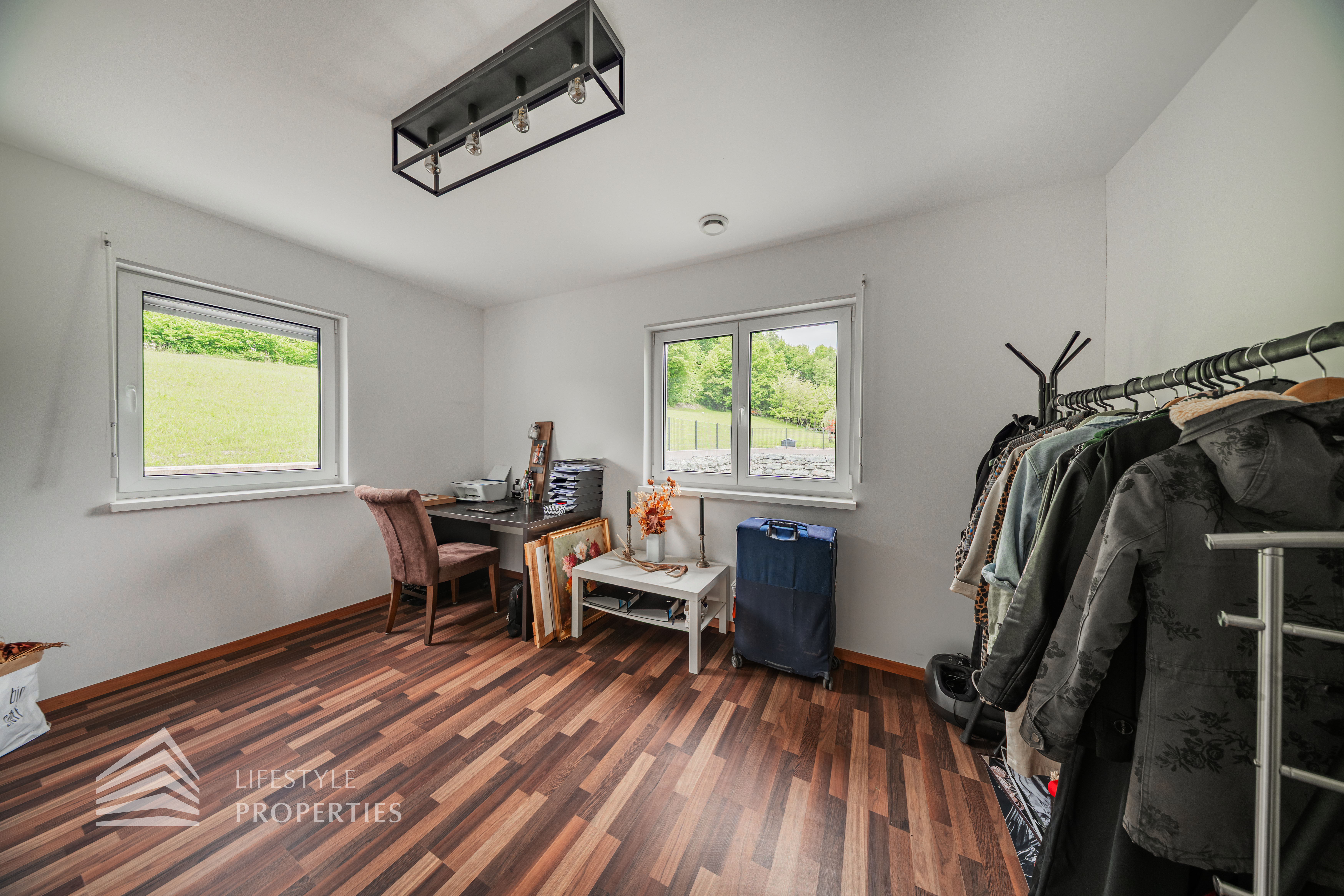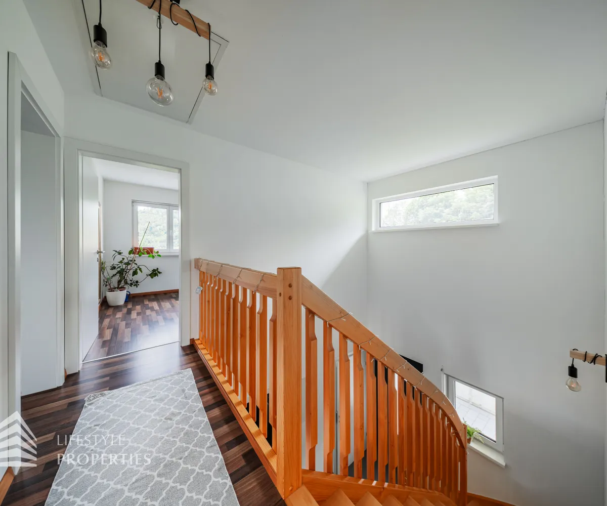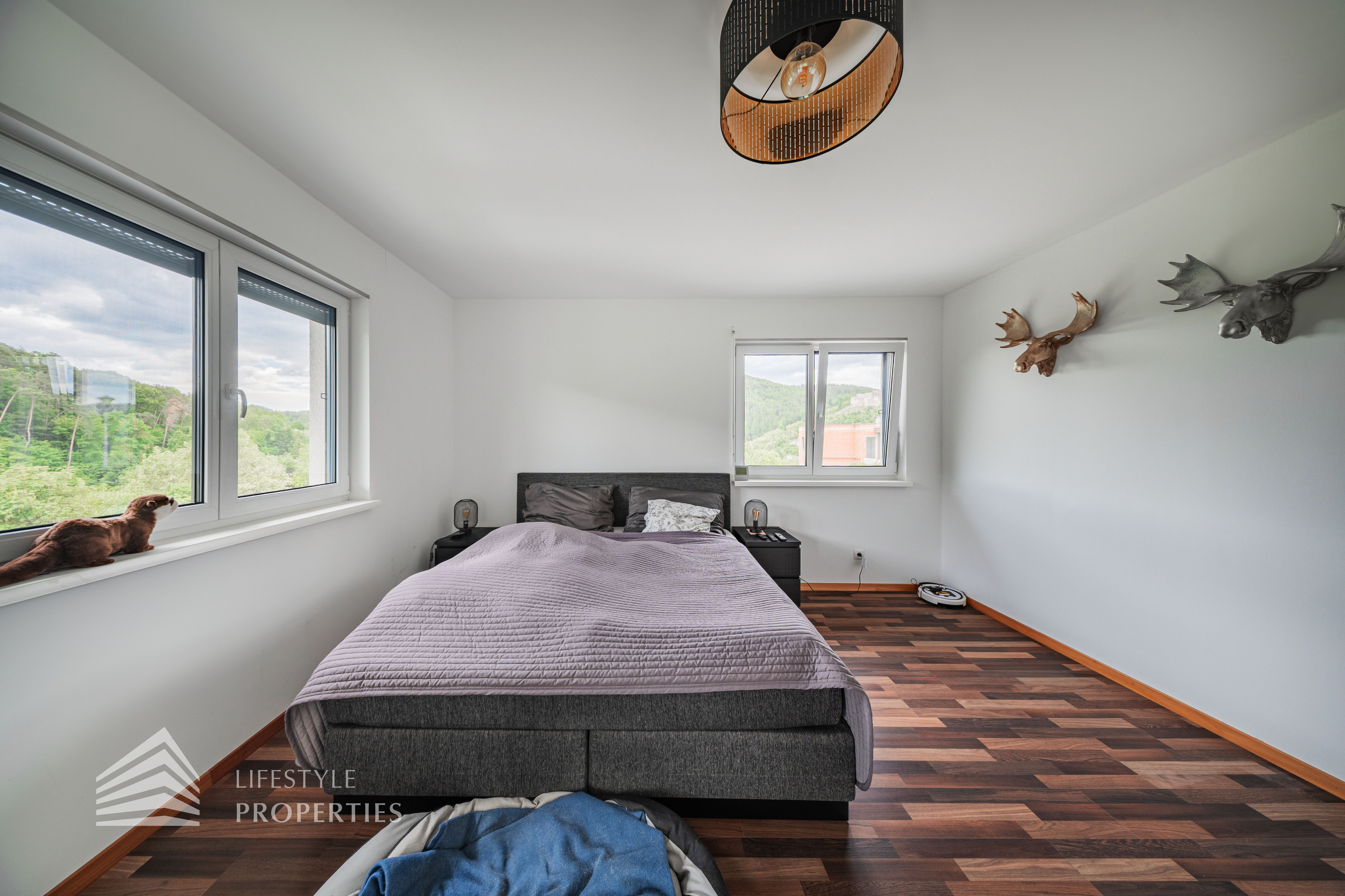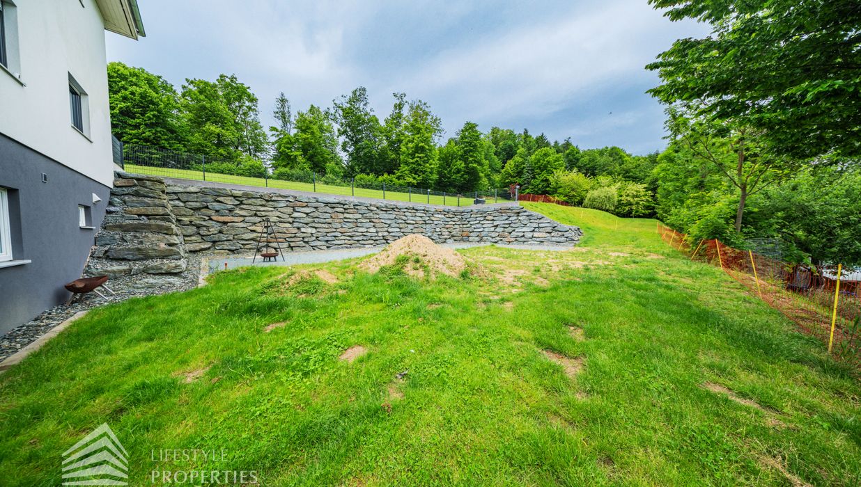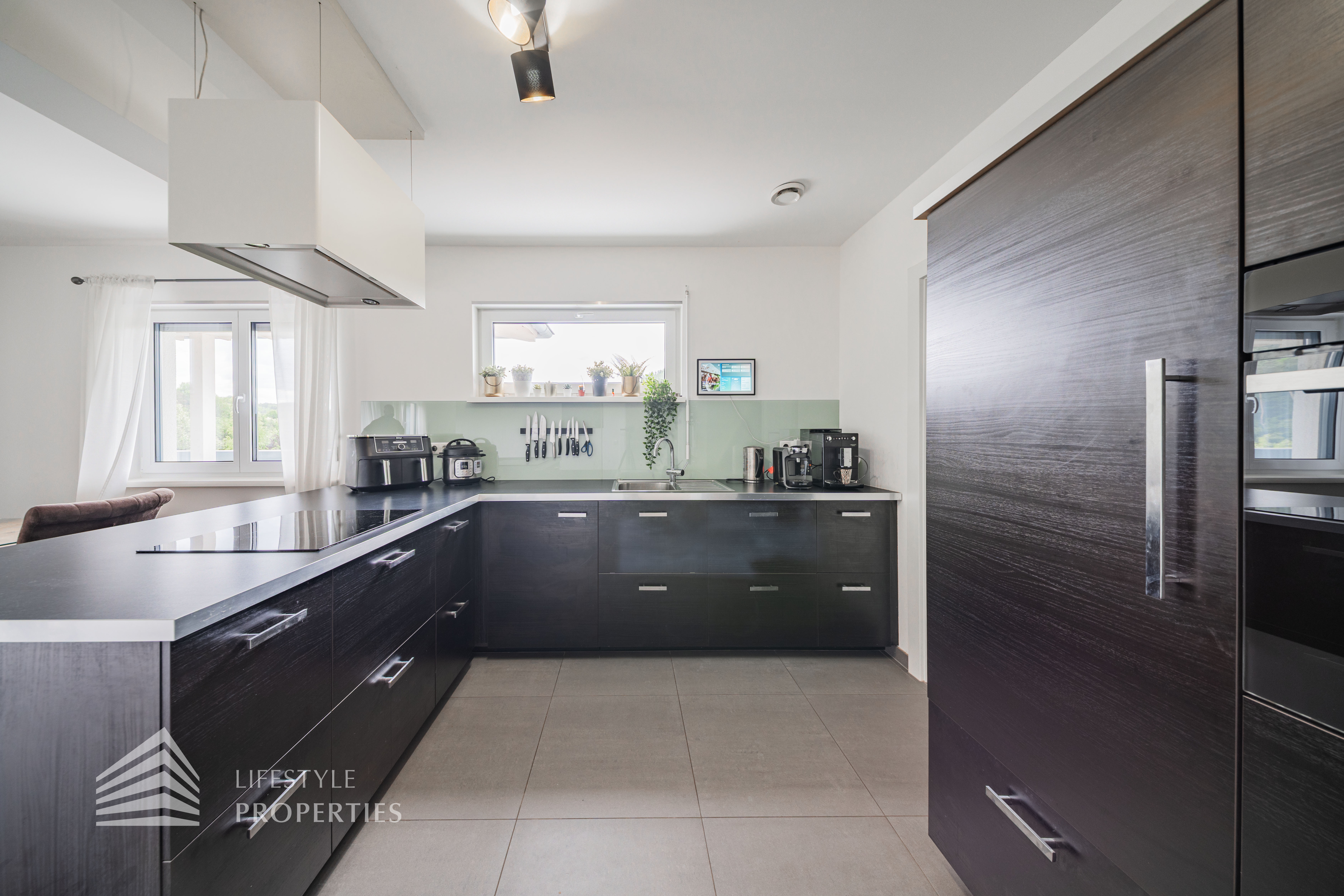 Wohnen, wo andere Urlaub machen! Dieses großzügige, moderne Einfamilienhaus in Holzriegelbauweise wurde 2014 errichtet und liegt in absoluter Ruhelage direkt am Waldrand – mit herrlichem Blick auf die Burgruine Kirchschlag und freiem Ausblick ohne direkte Nachbarn. Die ca. 260 m² grosse Nutzfläche ist auf drei Ebenen unterteilt (KG, EG, OG). Im ganzen Haus ist eine Zentrale Staubsaugeranlage und ein Glasfaseranschluss für ultraschnelles Internet verbaut. Das traumhafte Haus wurde als Niedrigenergiehaus in Holzriegelbauweise erbaut. Es überzeugt mit moderner Wohnraumlüftung zur Kühlung im Sommer. Beheizt wird mittels Erdwärme. Zum Objekt gehört ein verpflichtend zu übernehmendes Inventar im Wert von 40.000 EUR (nicht im Kaufpreis enthalten). Dieses umfasst unter anderem eine hochwertige Kücheneinrichtung, Badezimmermöbel im Obergeschoss und im Keller, einen Esstisch mit Stühlen, eine Garderobe mit Spiegelkasten, einen hochwertig verbauten Waschraum sowie eine praktische Werkzeugbank.