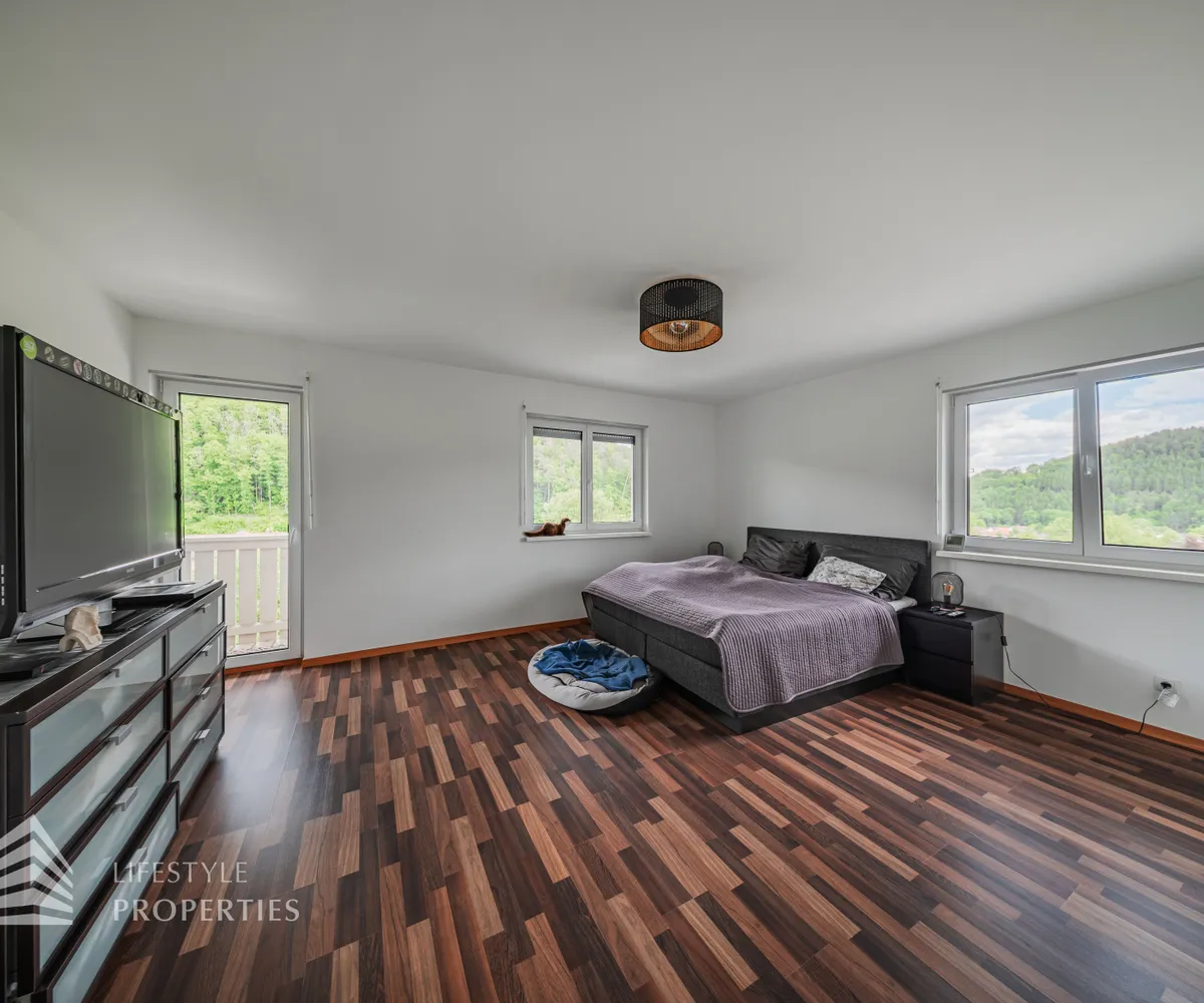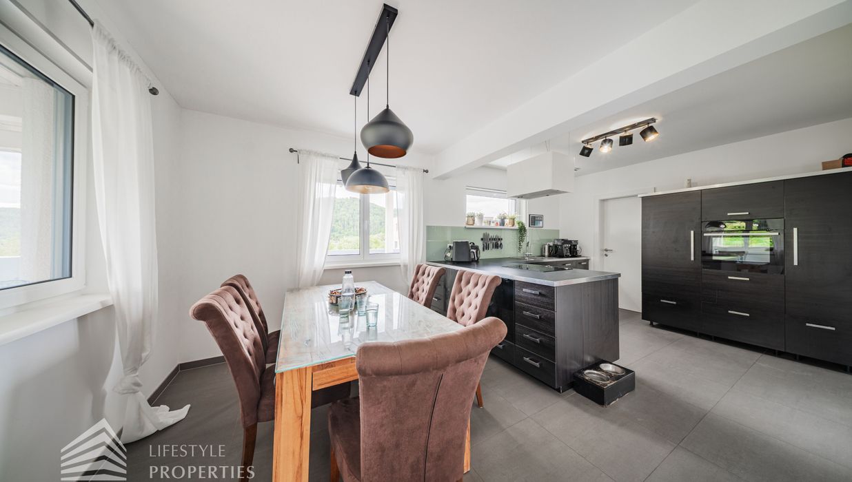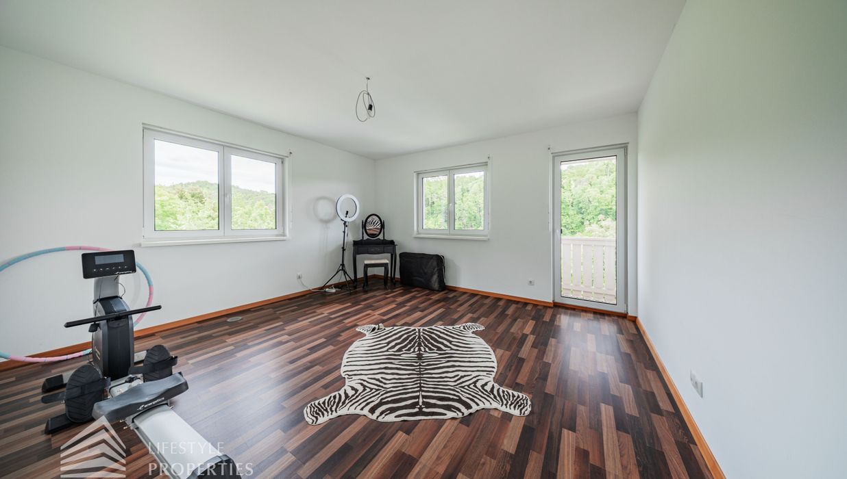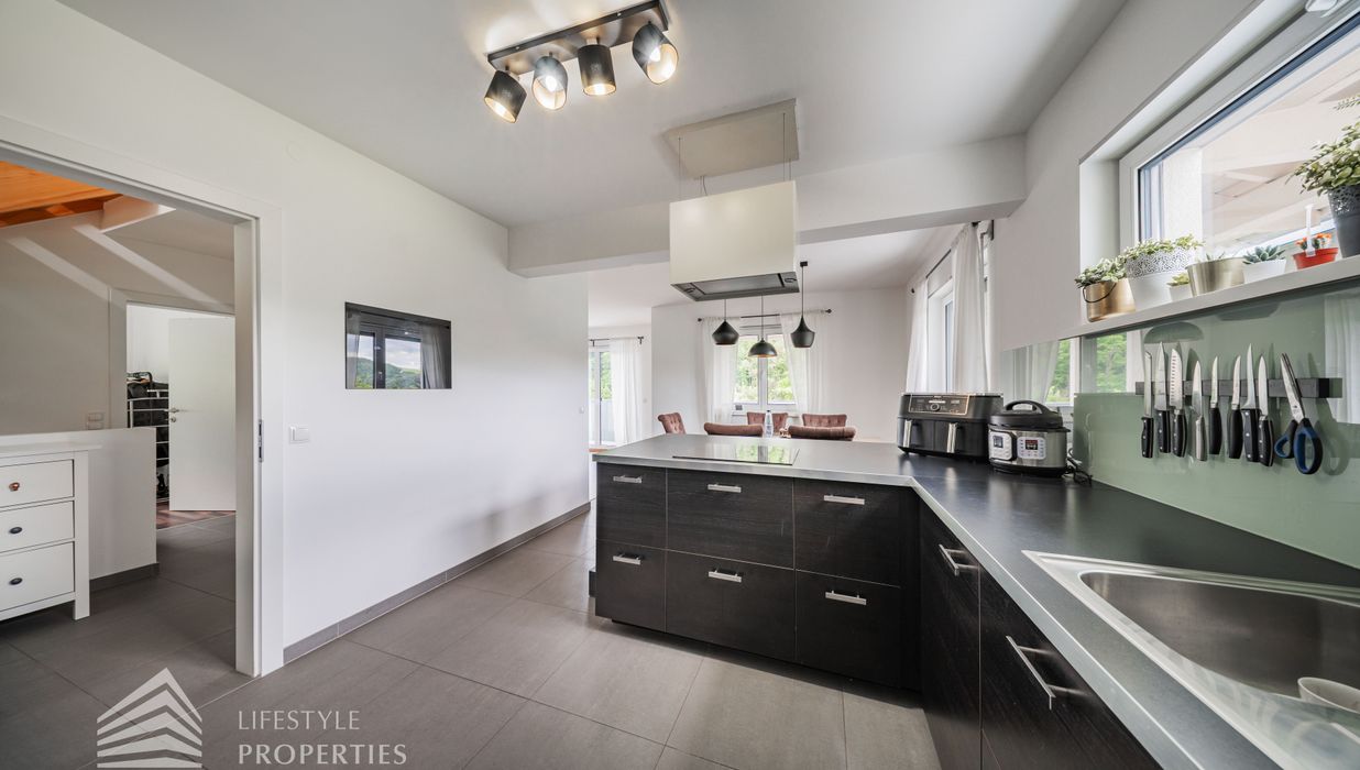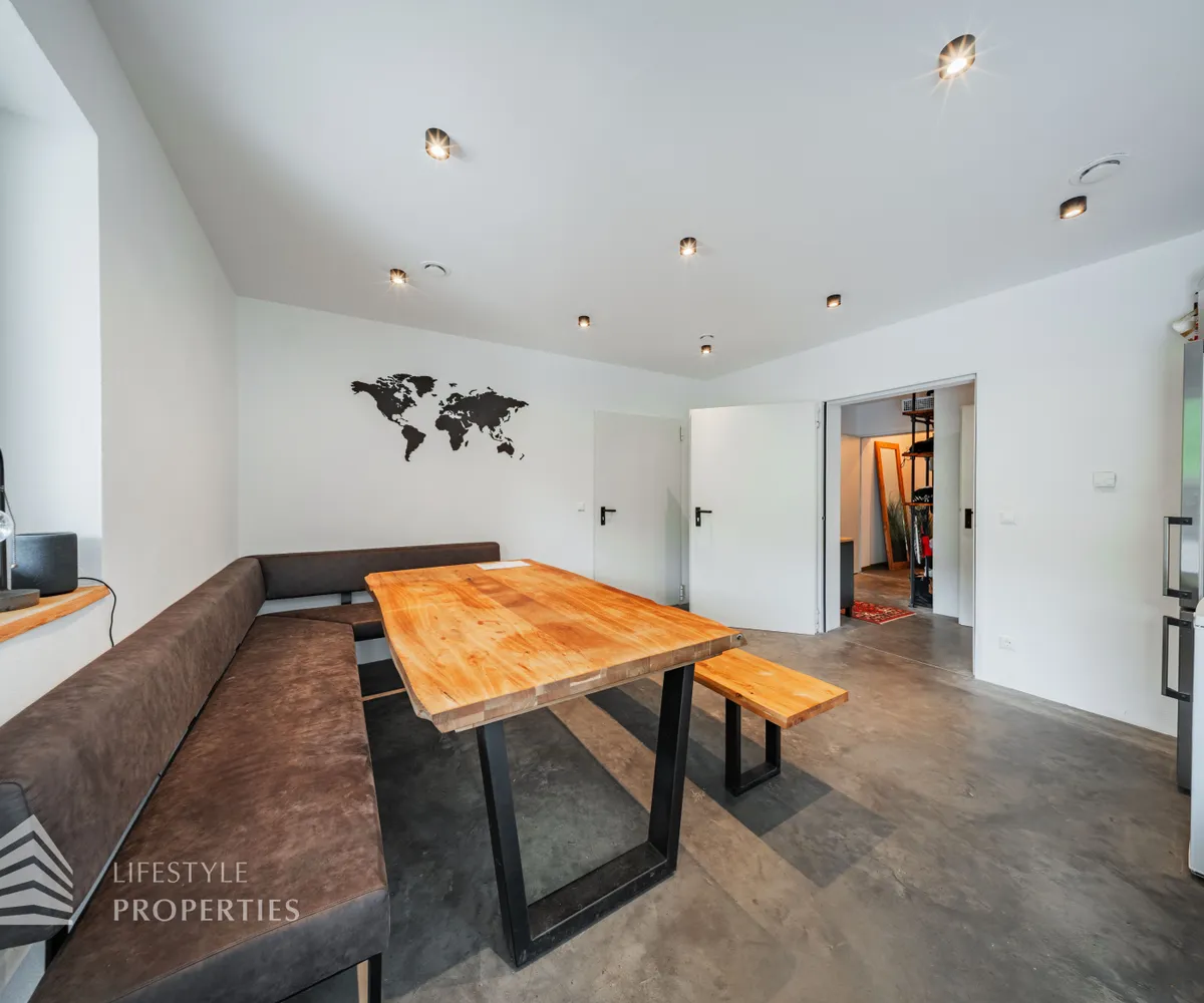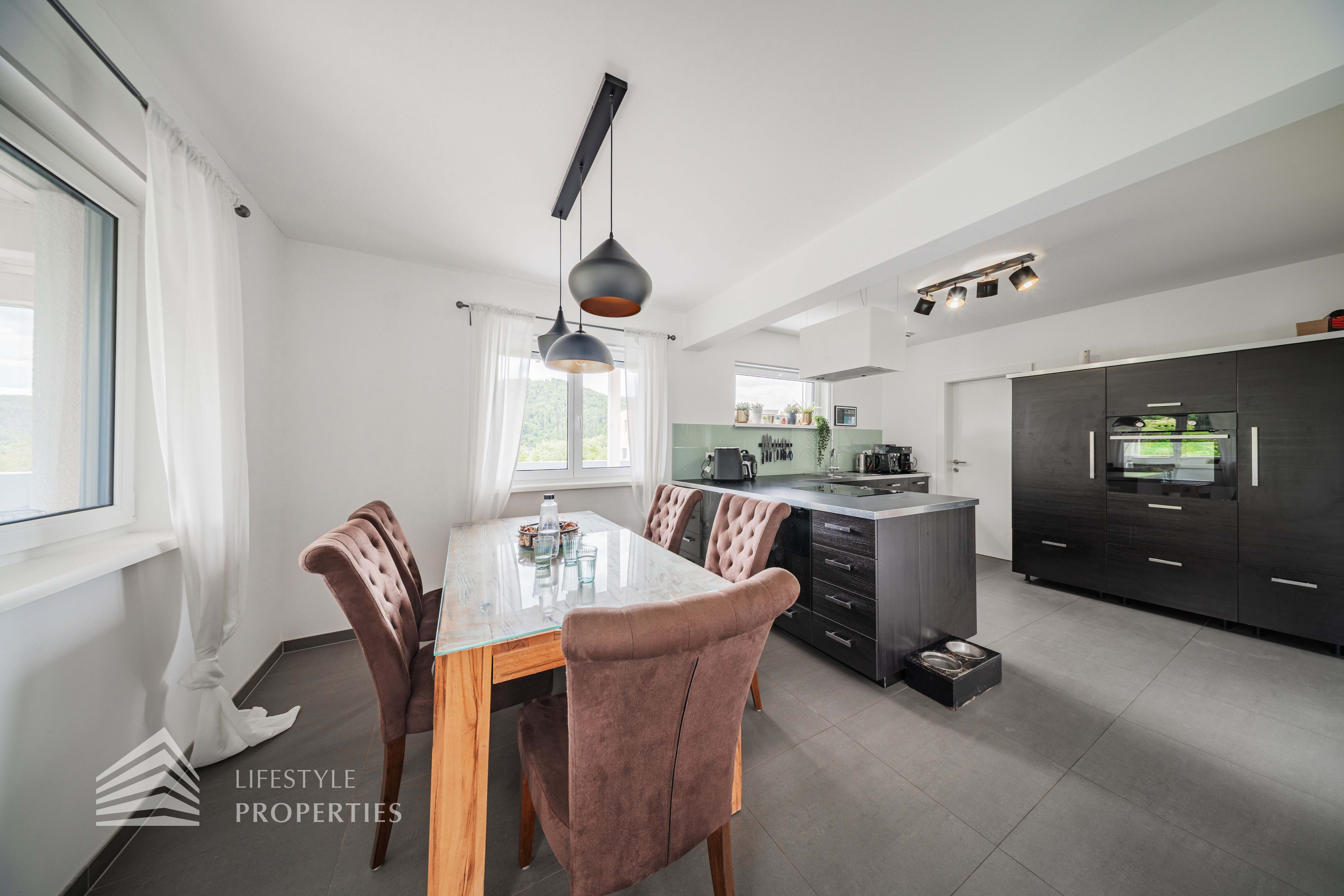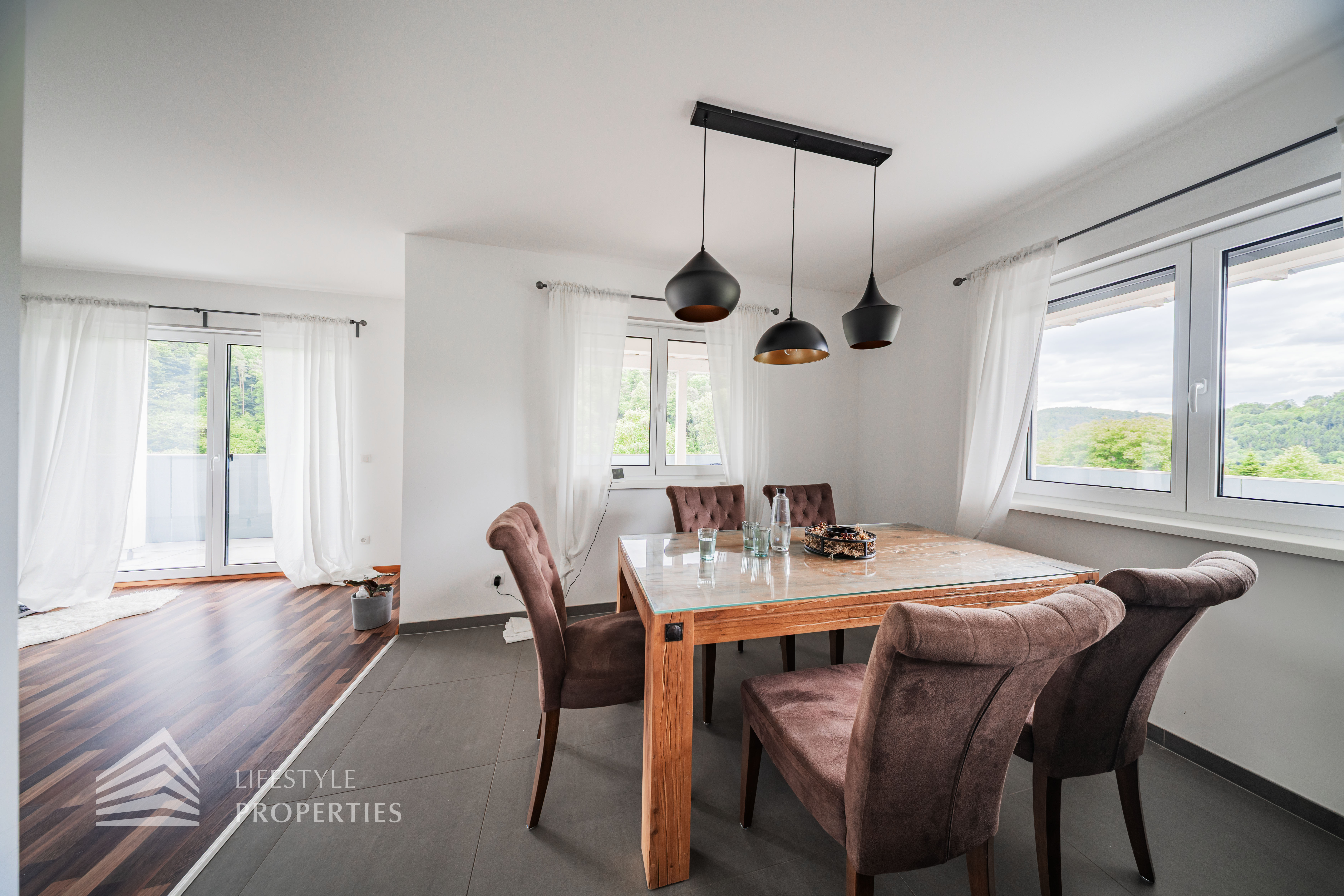 Wohnen, wo andere Urlaub machen! Dieses großzügige, moderne Einfamilienhaus in Holzriegelbauweise wurde 2014 errichtet und liegt in absoluter Ruhelage direkt am Waldrand – mit herrlichem Blick auf die Burgruine Kirchschlag und freiem Ausblick ohne direkte Nachbarn. Die ca. 260 m² grosse Nutzfläche ist auf drei Ebenen unterteilt (KG, EG, OG). Im ganzen Haus ist eine Zentrale Staubsaugeranlage und ein Glasfaseranschluss für ultraschnelles Internet verbaut. Das traumhafte Haus wurde als Niedrigenergiehaus in Holzriegelbauweise erbaut. Es überzeugt mit moderner Wohnraumlüftung zur Kühlung im Sommer. Beheizt wird mittels Erdwärme. Zum Objekt gehört ein verpflichtend zu übernehmendes Inventar im Wert von 40.000 EUR (nicht im Kaufpreis enthalten). Dieses umfasst unter anderem eine hochwertige Kücheneinrichtung, Badezimmermöbel im Obergeschoss und im Keller, einen Esstisch mit Stühlen, eine Garderobe mit Spiegelkasten, einen hochwertig verbauten Waschraum sowie eine praktische Werkzeugbank.