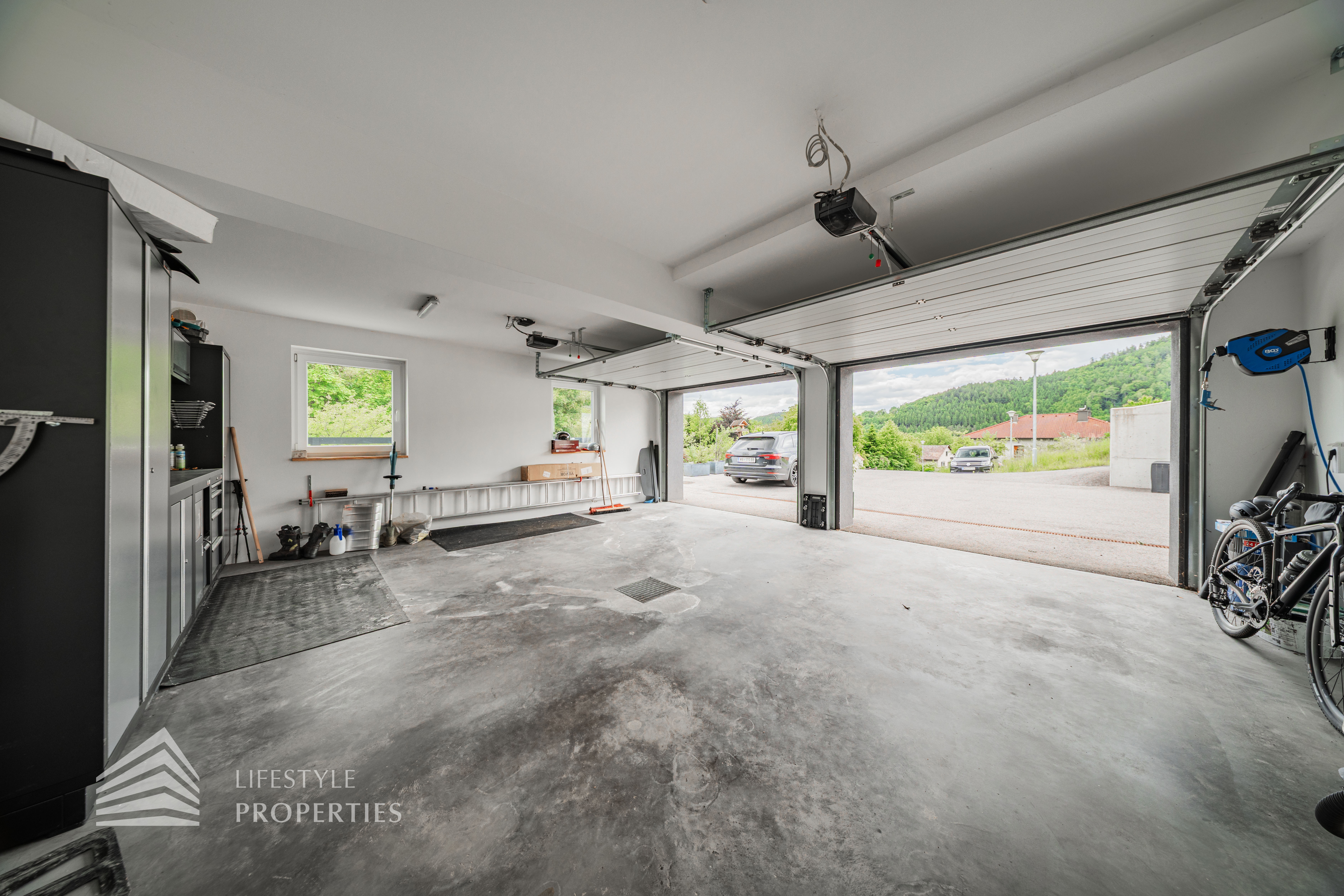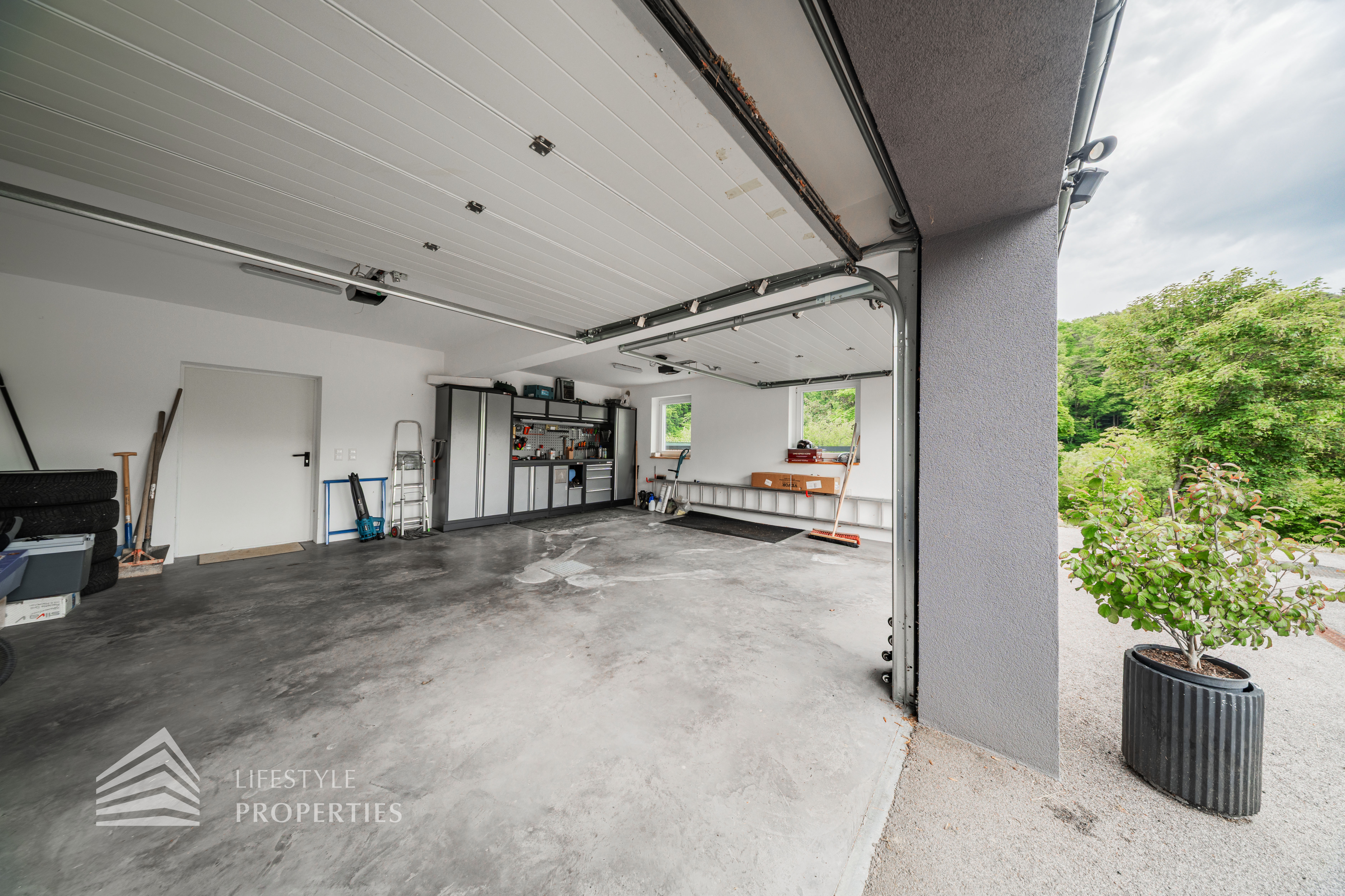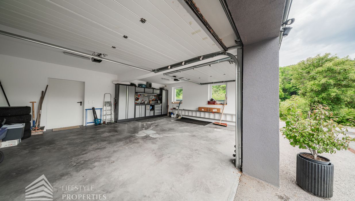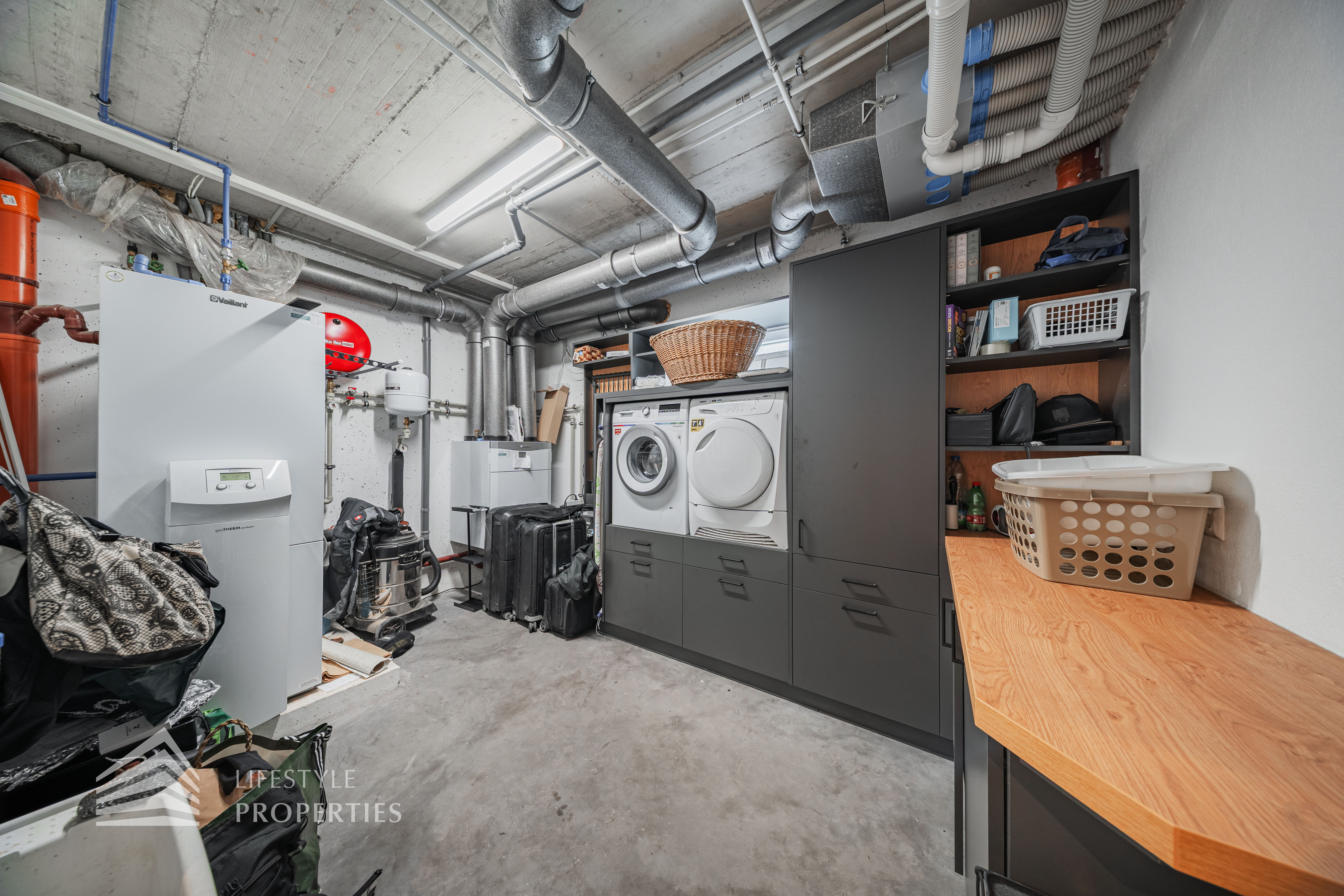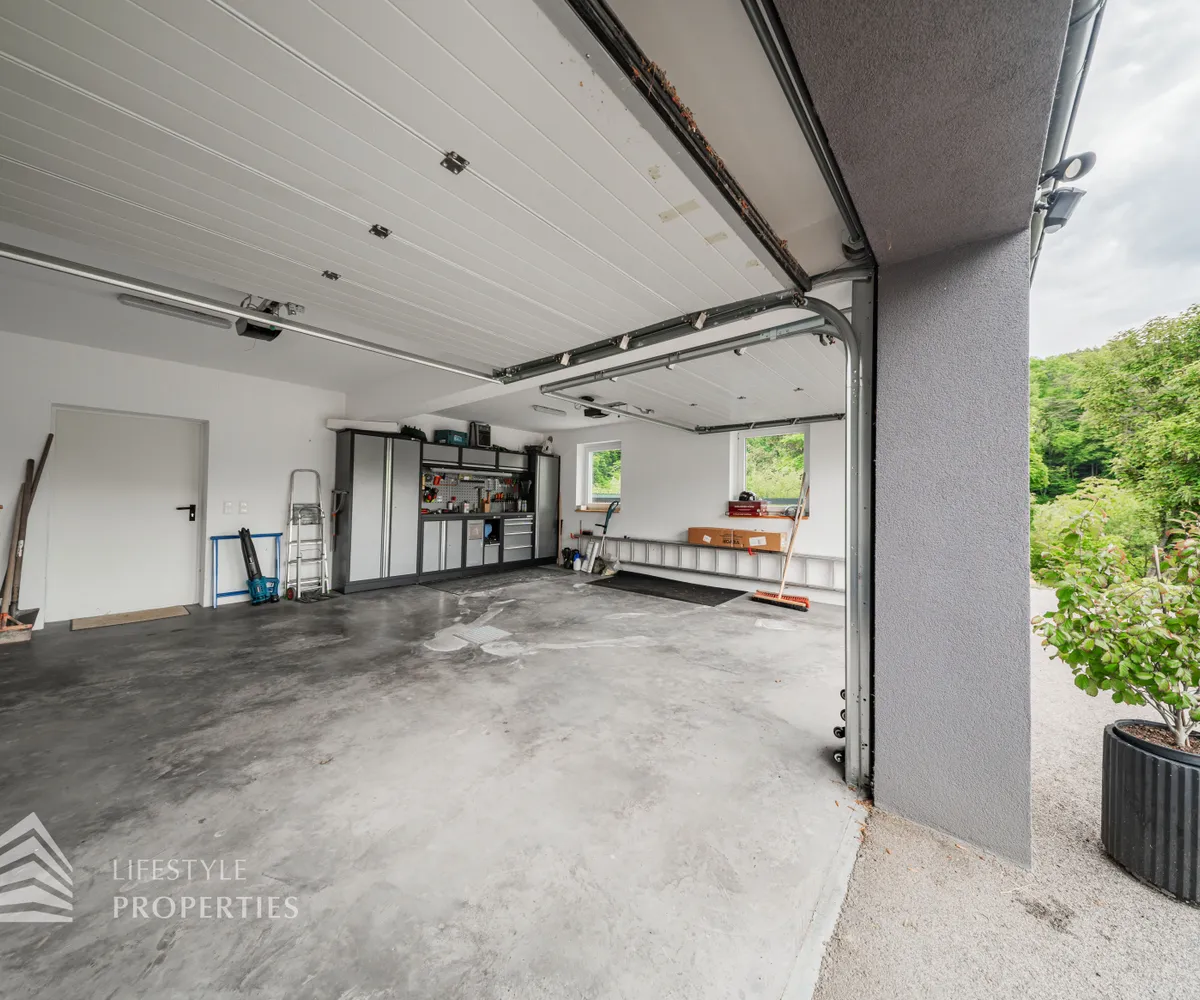 Einen voll ausgebautem Keller ebenerdig zugänglich mit eigenem Eingang, inkl. Fußbodenheizung in allen Räumen, Badezimmer und vorbereitetem Küchenanschluss. Der Keller kann ohne viel Aufwand als eigene Wohn Nutzeinheit adaptiert werden. Die fußbodenbeheizte Garage mit Platz für 2 PKWs bietet zusätzlich einen Starkstromanschluss für E-Lade Station und einen Wasseranschluss.