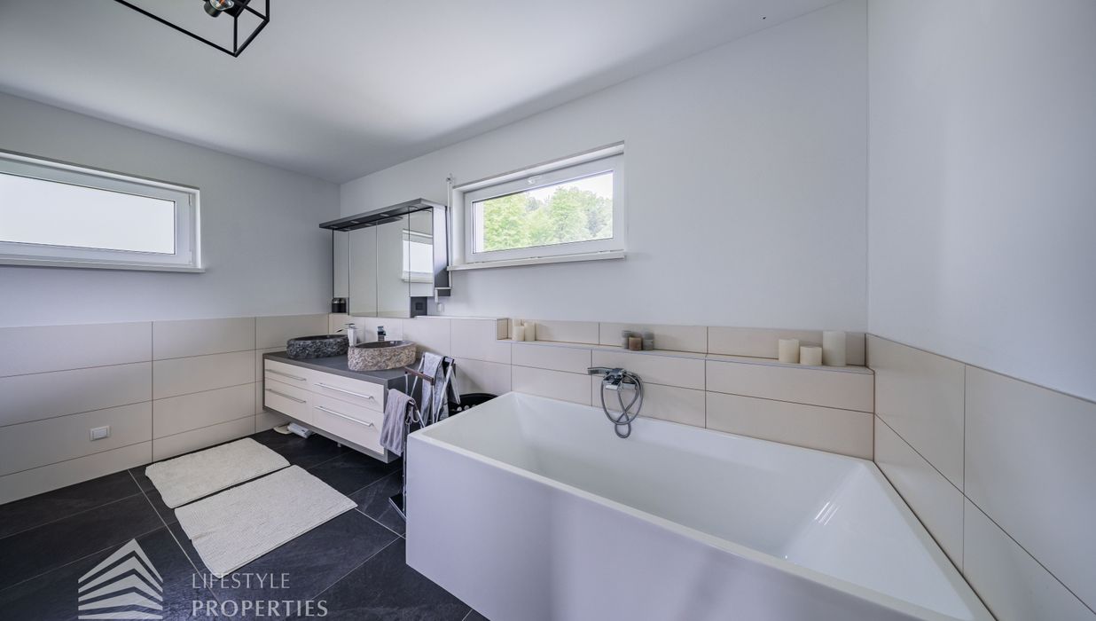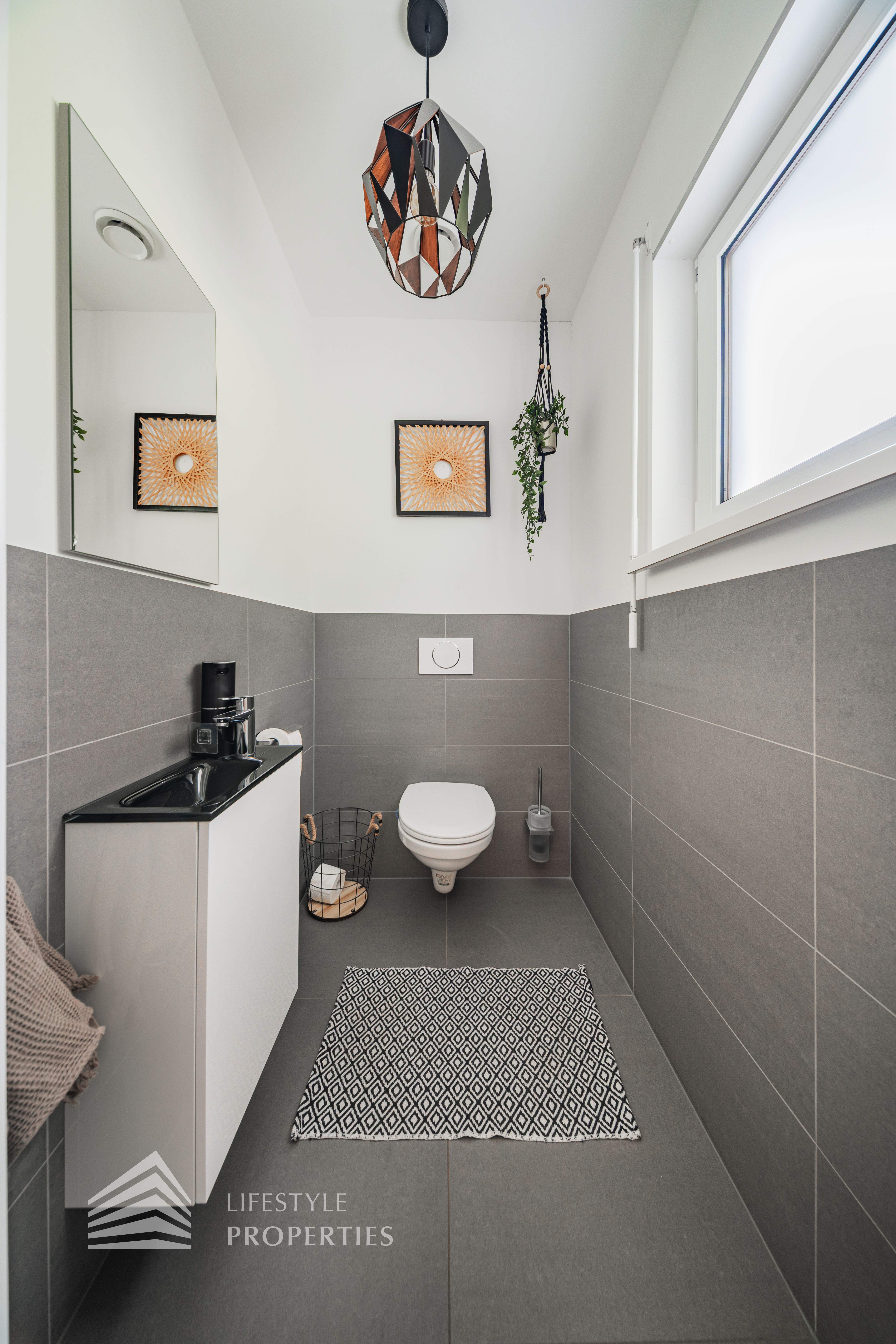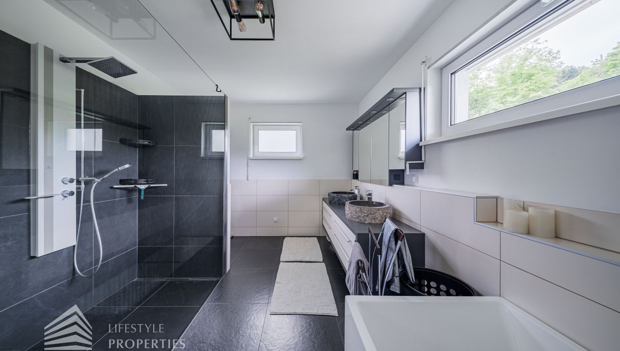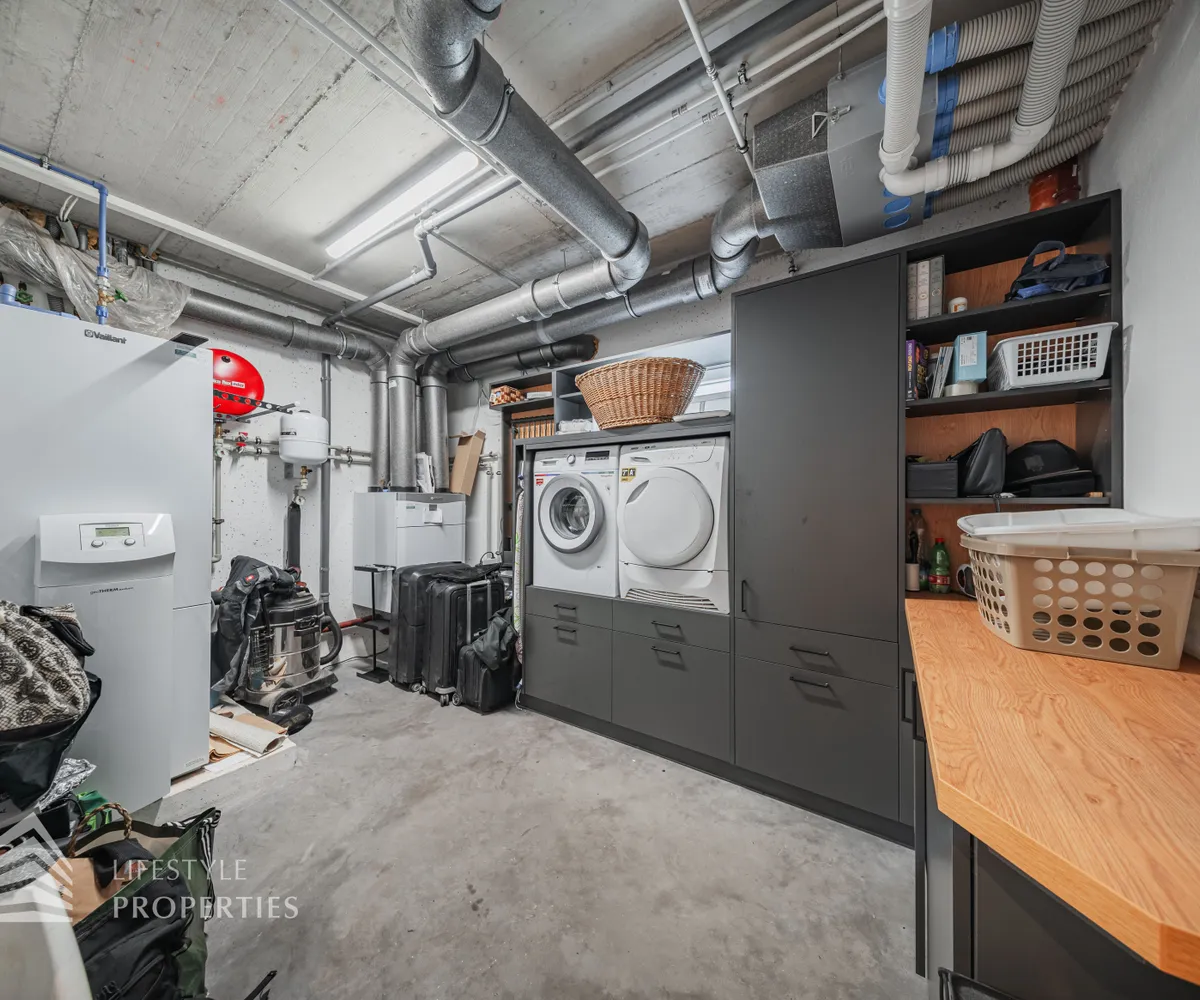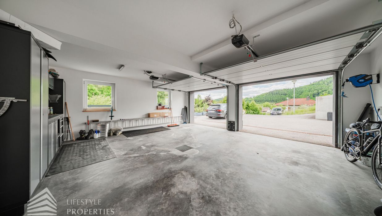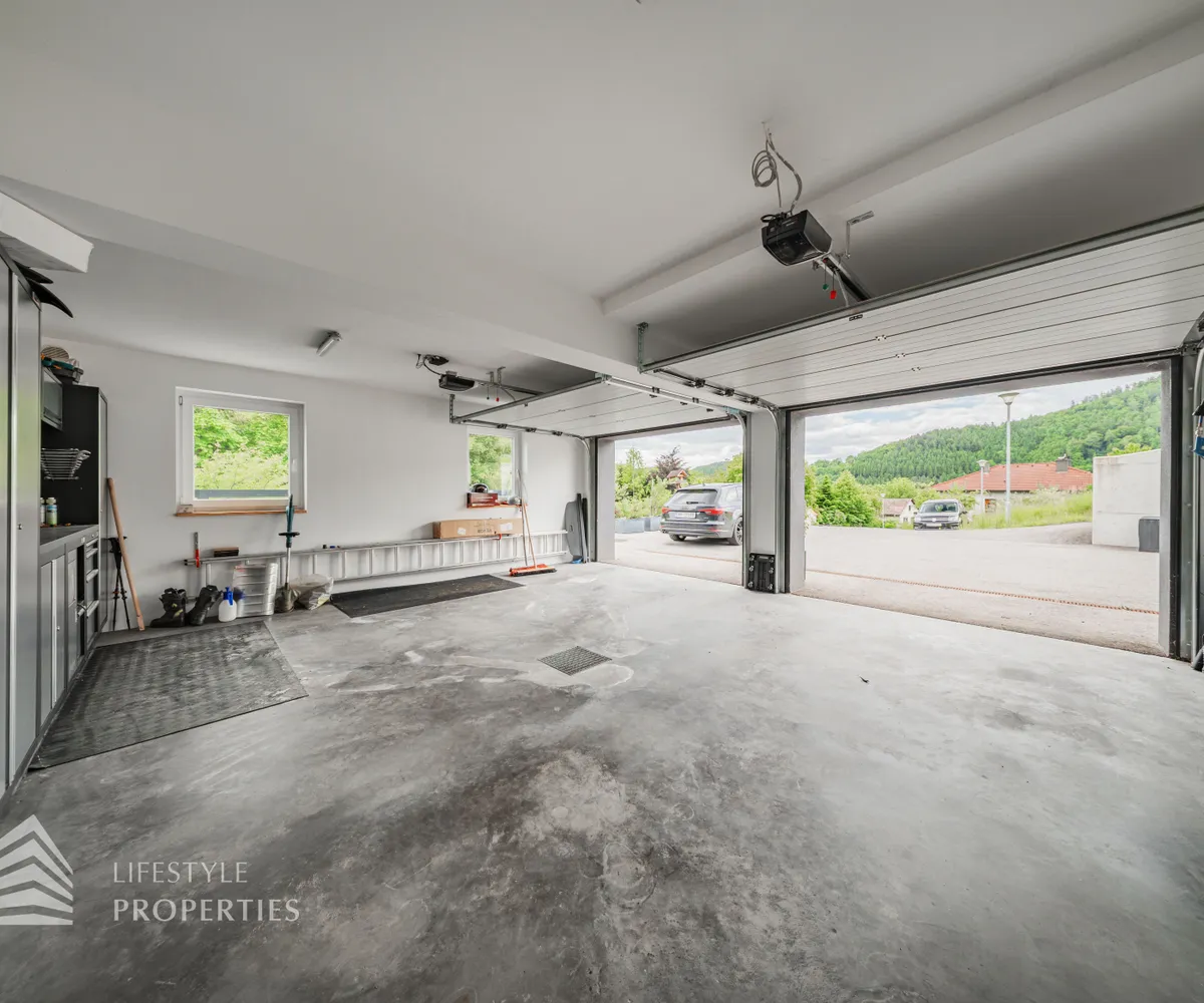 Einen voll ausgebautem Keller ebenerdig zugänglich mit eigenem Eingang, inkl. Fußbodenheizung in allen Räumen, Badezimmer und vorbereitetem Küchenanschluss. Der Keller kann ohne viel Aufwand als eigene Wohn Nutzeinheit adaptiert werden. Die fußbodenbeheizte Garage mit Platz für 2 PKWs bietet zusätzlich einen Starkstromanschluss für E-Lade Station und einen Wasseranschluss.