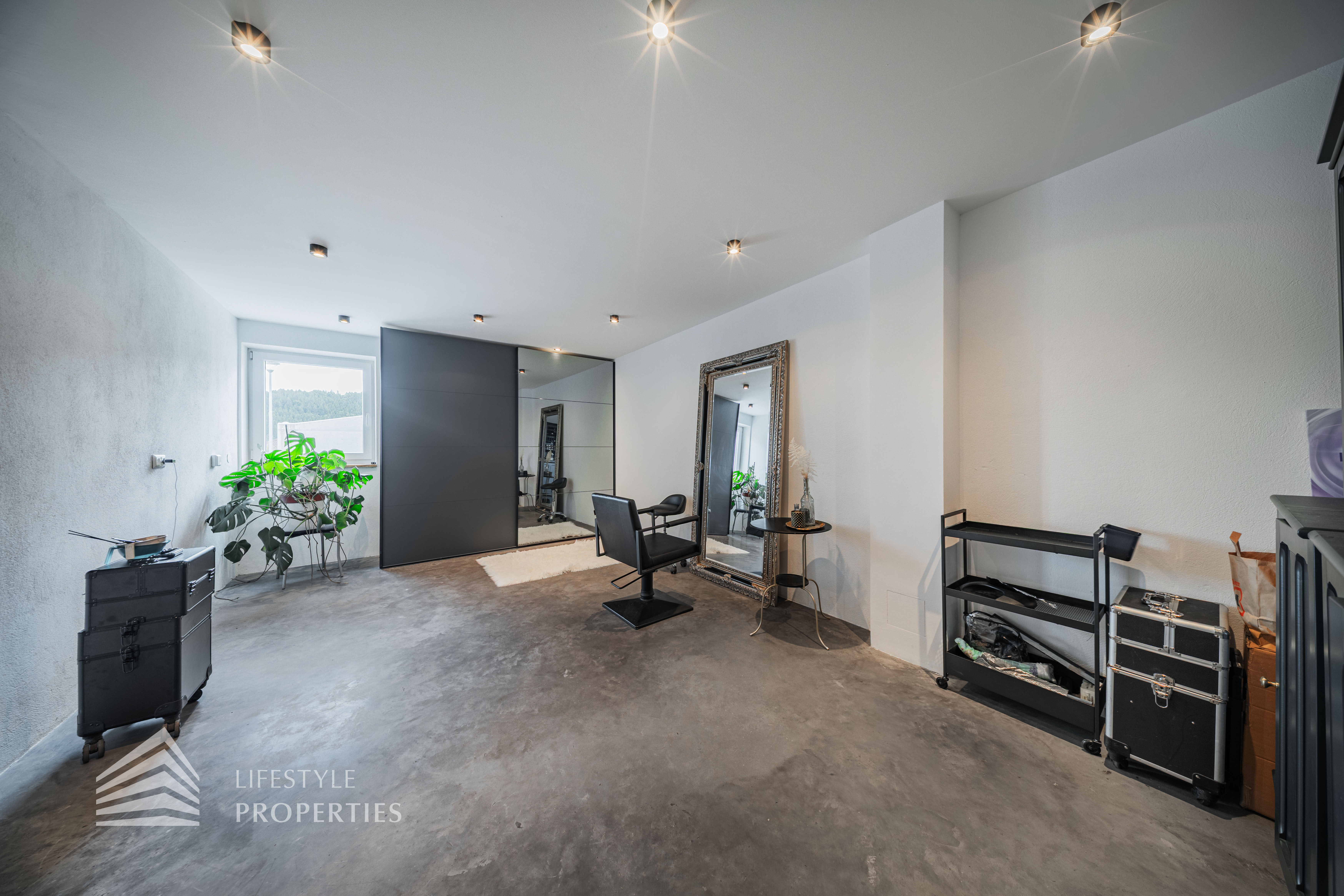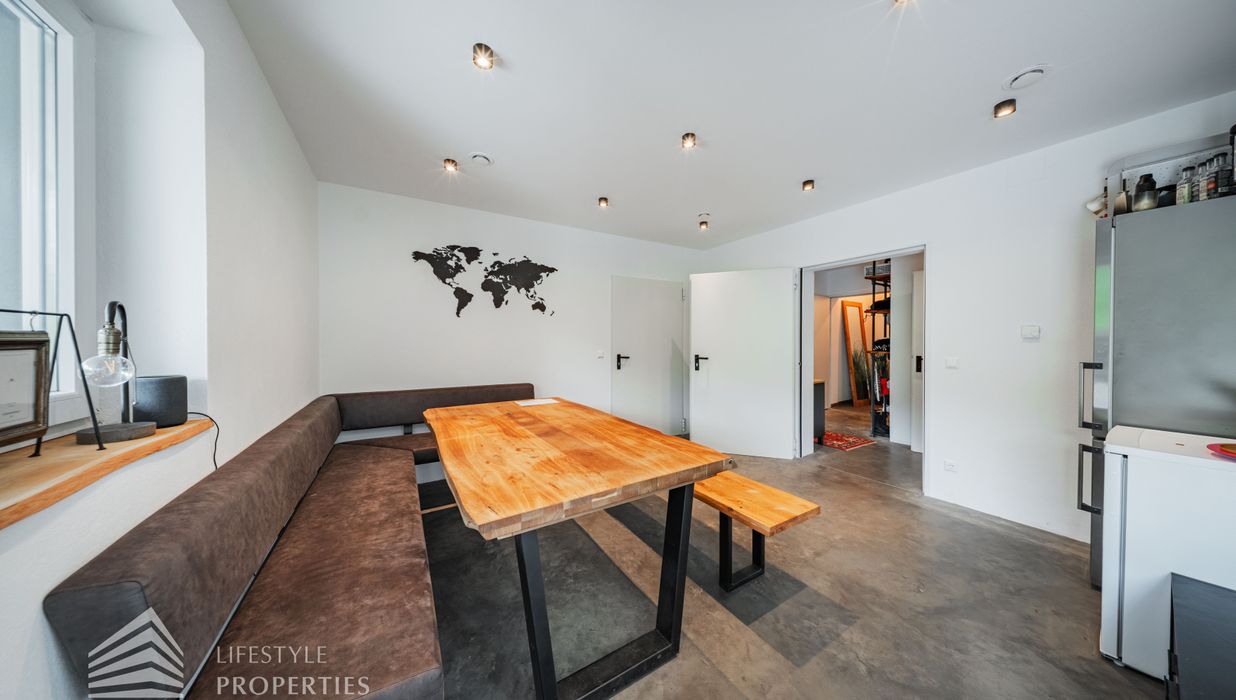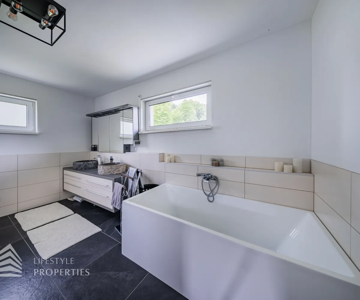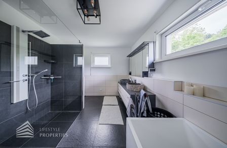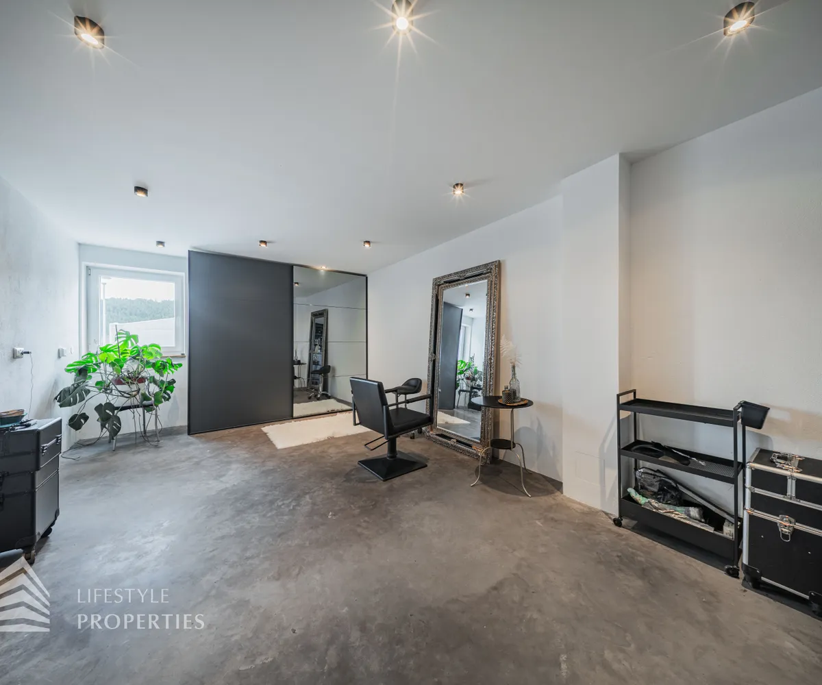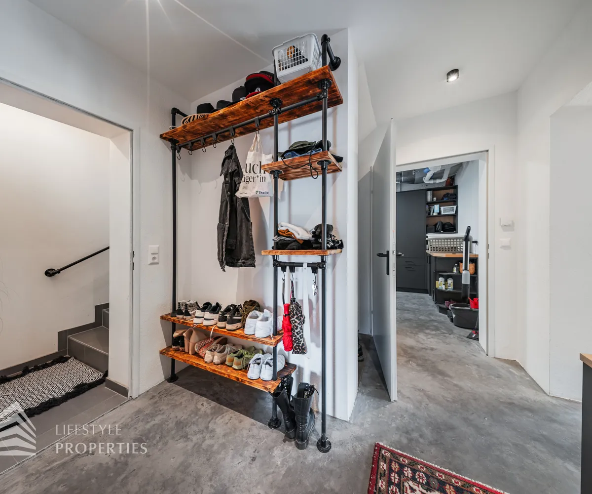 Einen voll ausgebautem Keller ebenerdig zugänglich mit eigenem Eingang, inkl. Fußbodenheizung in allen Räumen, Badezimmer und vorbereitetem Küchenanschluss. Der Keller kann ohne viel Aufwand als eigene Wohn Nutzeinheit adaptiert werden. Die fußbodenbeheizte Garage mit Platz für 2 PKWs bietet zusätzlich einen Starkstromanschluss für E-Lade Station und einen Wasseranschluss.