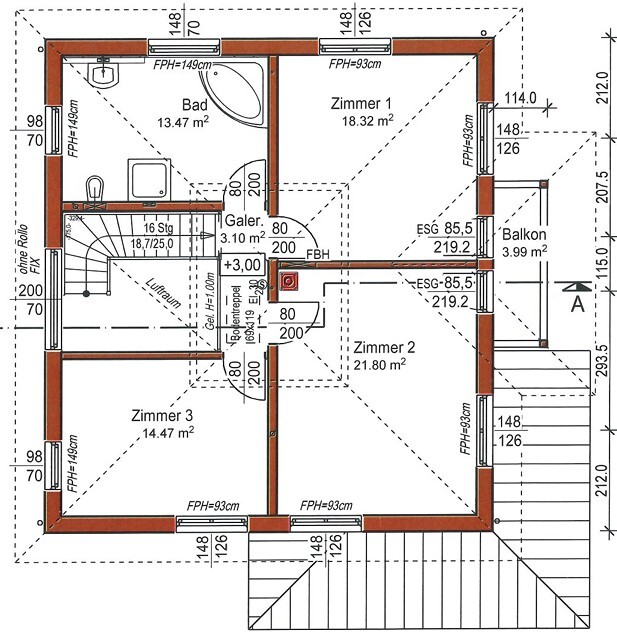 In dem ca. 68 m² großen Obergeschoss (ohne Dachschrägen) finden Sie drei großzügig angelegte Zimmer sowie einen ostseitig ausgerichteten Balkon und ein voll ausgestattetes, modernes, großes Badezimmer mit Wanne, Dusche und Toilette.