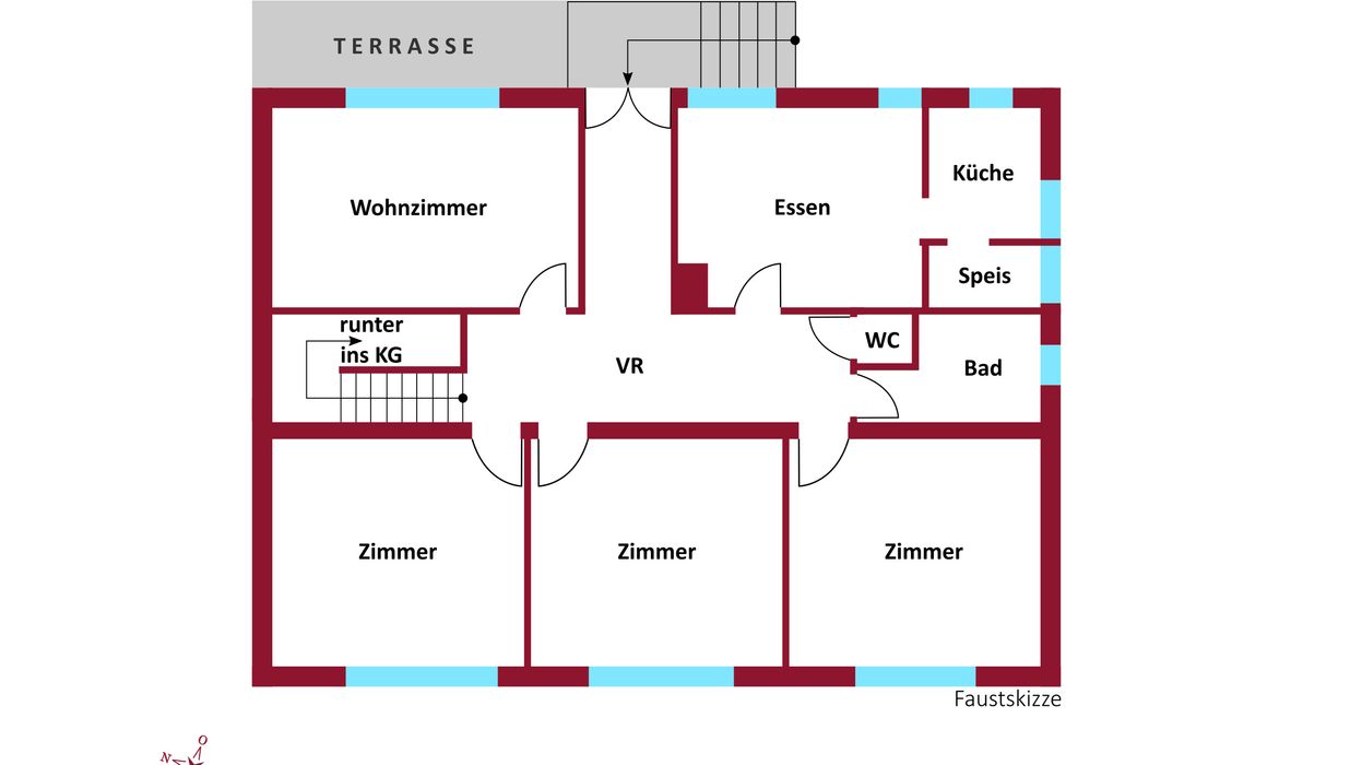 Das Haus ist vollständig unterkellert und bietet dadurch ein großzügiges Raumangebot mit vielfältigem Potenzial. Der Haupteingang ist bequem über die Terrasse erreichbar. Auf der Wohnebene erwarten Sie ein gemütliches Wohnzimmer, drei gut geschnittene Schlafzimmer, ein Badezimmer mit Fenster und Badewanne sowie ein separates WC . Die Küche ist direkt vom Esszimmer zugänglich und wird durch eine praktische Speisekammer ergänzt.